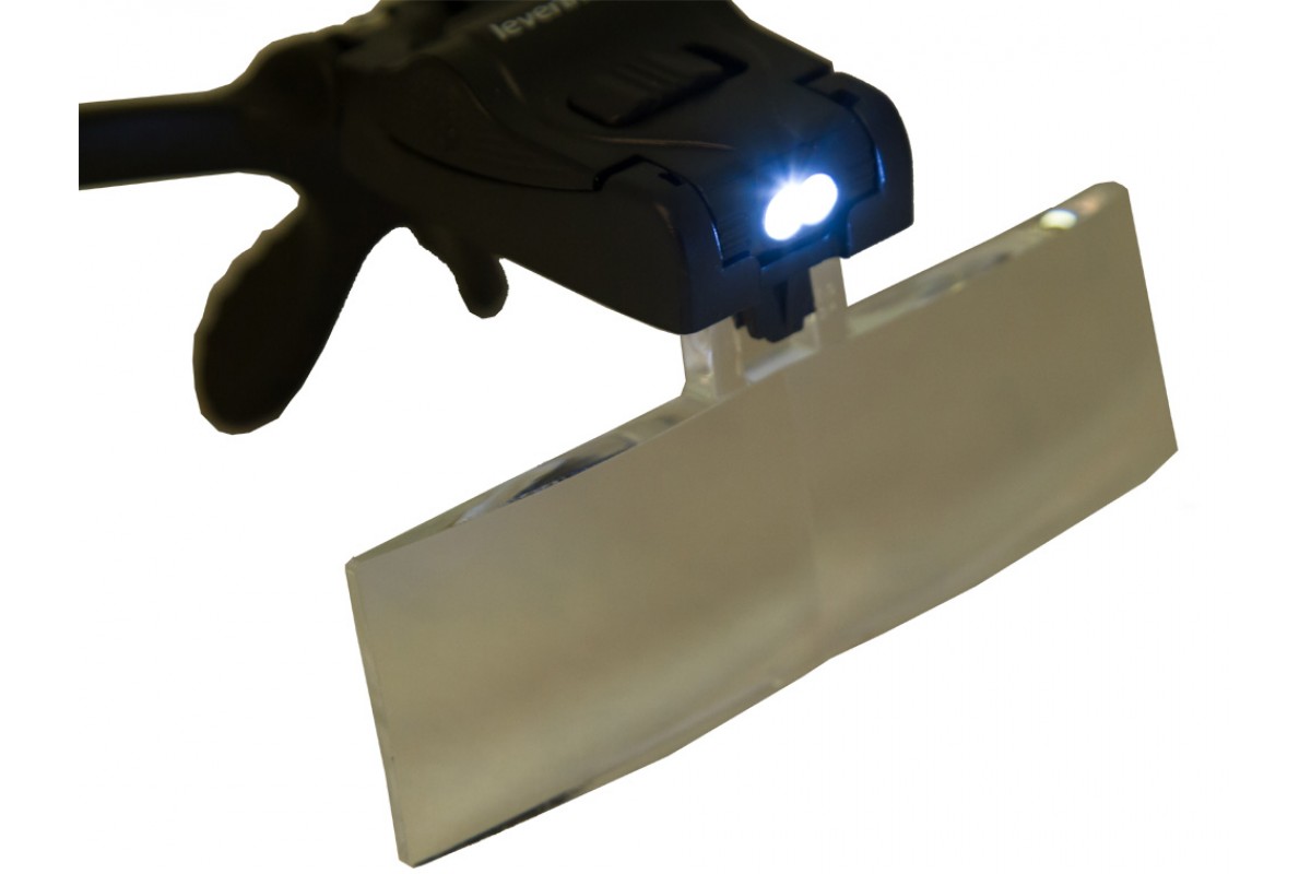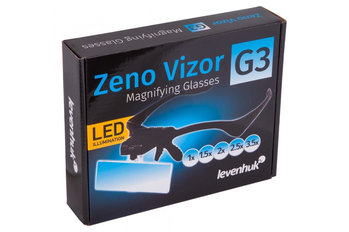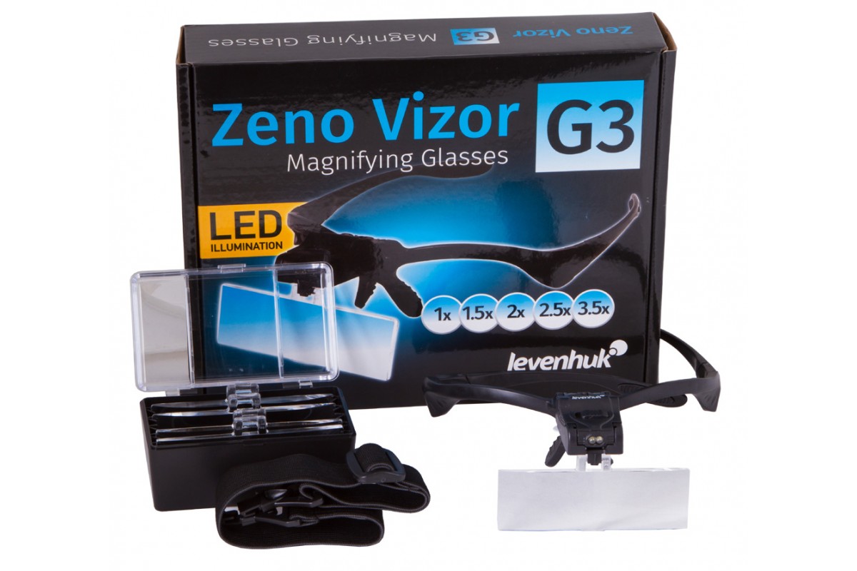 Лупа-очки Levenhuk Zeno Vizor G3 имеет встроенную подсветку и пять сменных линз из полимерного оптического стекла. Меняя линзы, можно получить 5 фиксированных увеличений в диапазоне от 1х до 3,5х. Подсветка яркая, светодиодная, с широкой областью охвата. При скудном внешнем освещении она поможет не прерывать работу и выполнять все манипуляции максимально аккуратно.