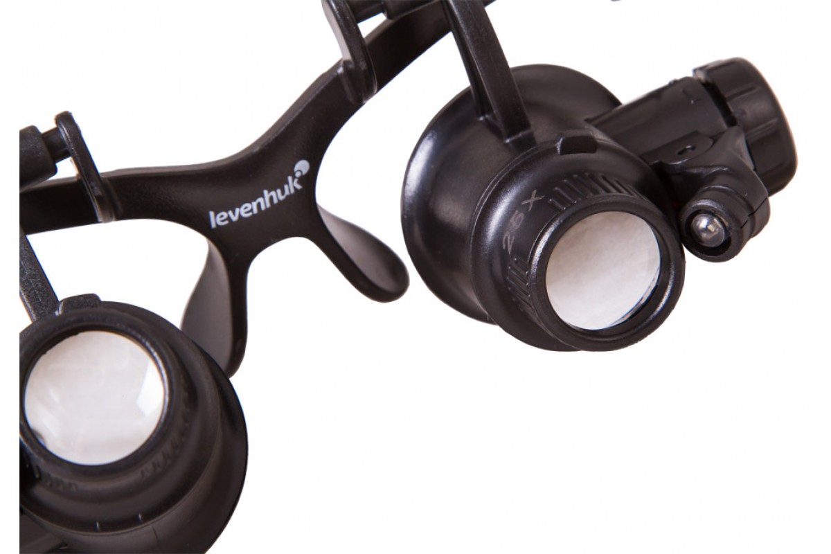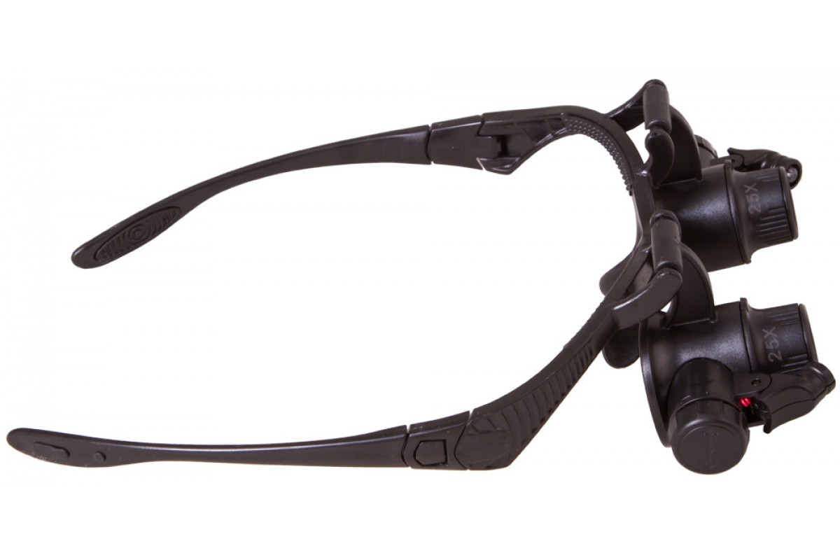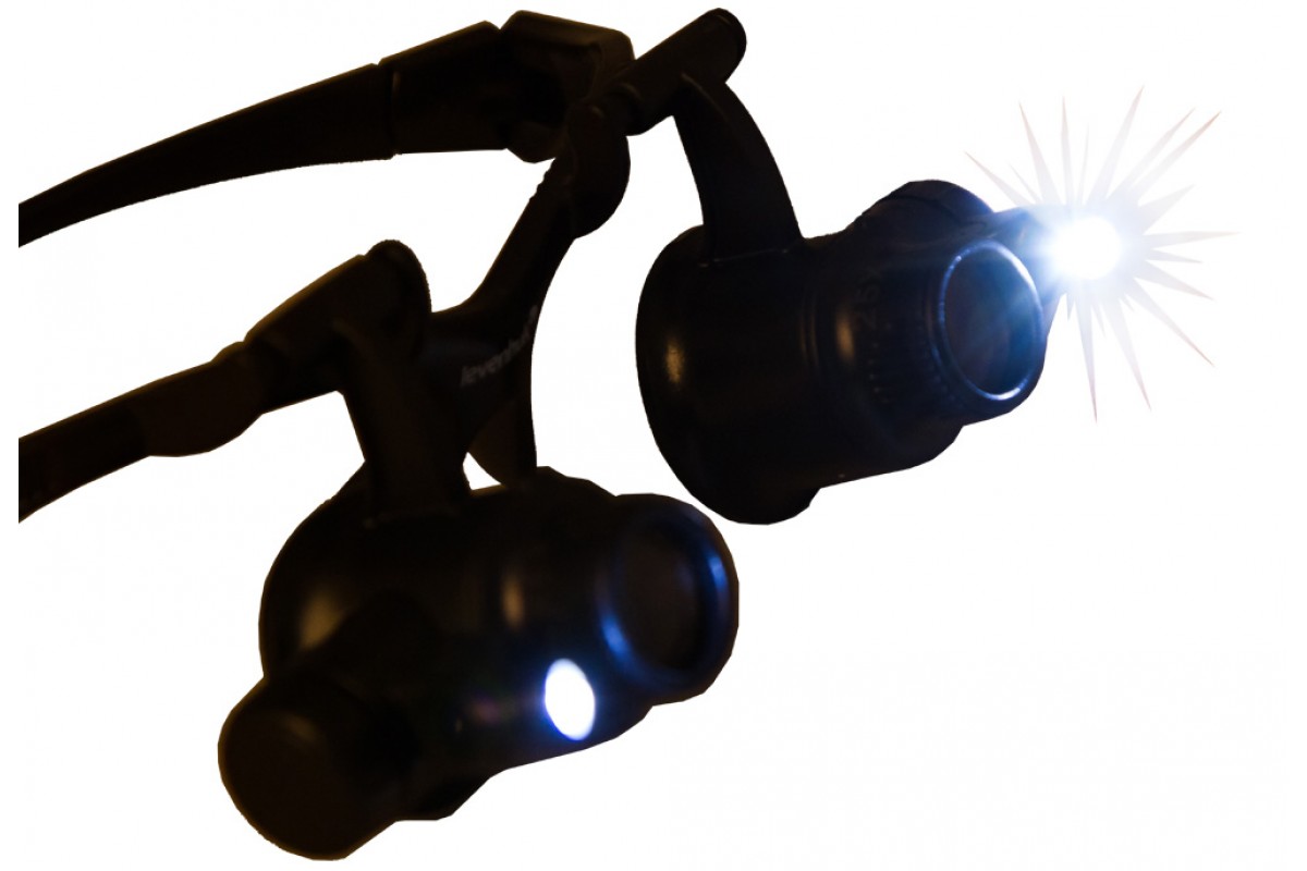 Лупа комплектуется сменными линзами для обоих глаз. Прямо «из коробки» вы получите диапазон увеличений от 10 до 25 крат. Встроенная подсветка пригодится для работы при скудном освещении. Яркие светодиоды расположены по бокам оправы и позволяют равномерно освещать рабочую область. Направление подсветки можно регулировать вручную. При необходимости во время работы любую из линз можно отвернуть наверх, чтобы посмотреть на рабочую область невооруженным глазом.