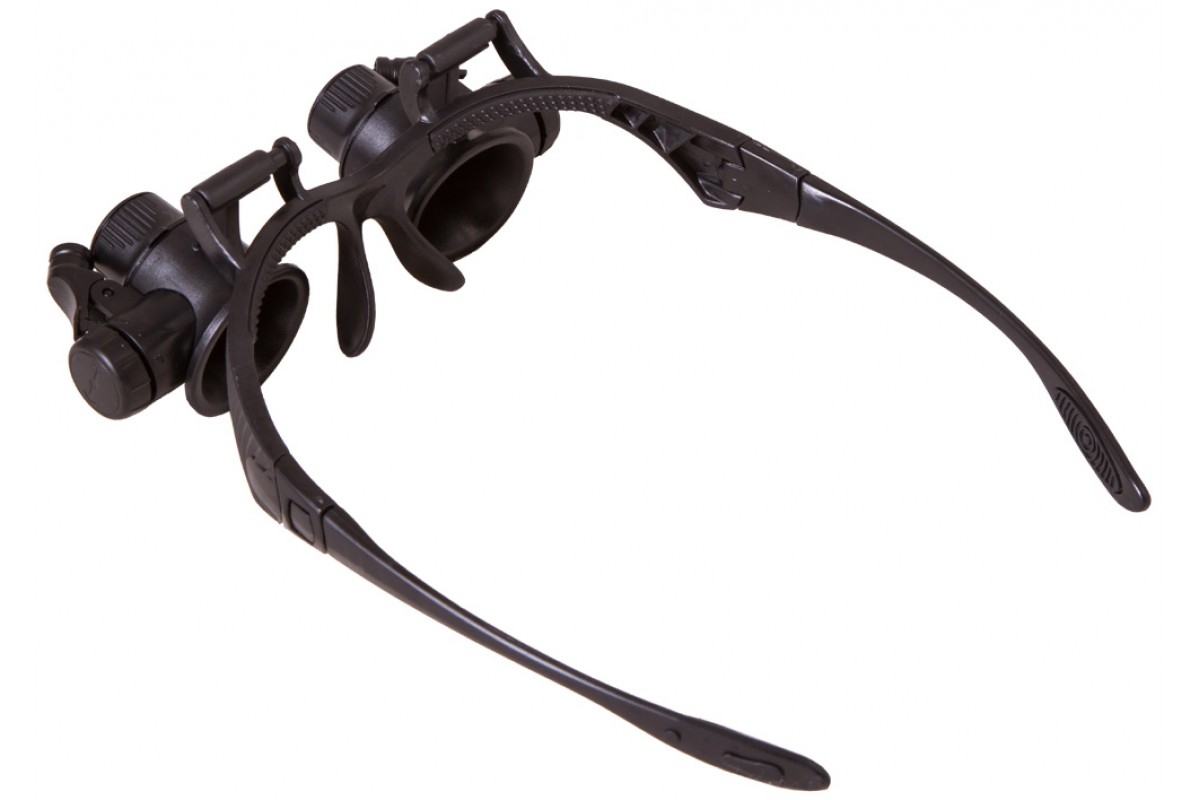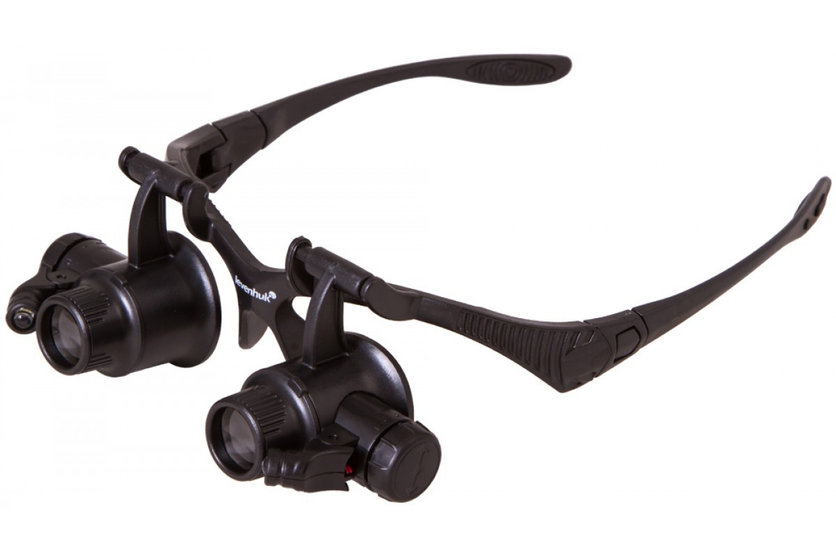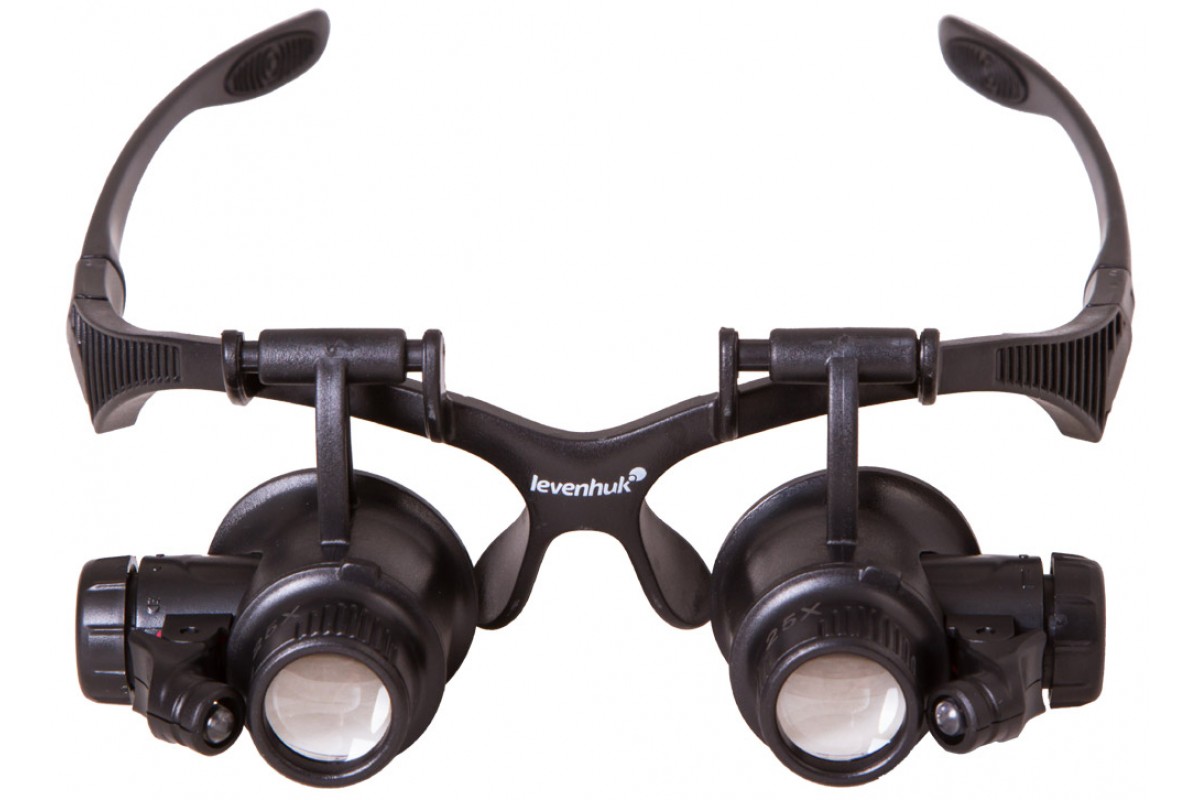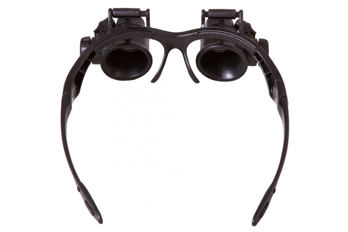 Лупа комплектуется сменными линзами для обоих глаз. Прямо «из коробки» вы получите диапазон увеличений от 10 до 25 крат. Встроенная подсветка пригодится для работы при скудном освещении. Яркие светодиоды расположены по бокам оправы и позволяют равномерно освещать рабочую область. Направление подсветки можно регулировать вручную. При необходимости во время работы любую из линз можно отвернуть наверх, чтобы посмотреть на рабочую область невооруженным глазом.