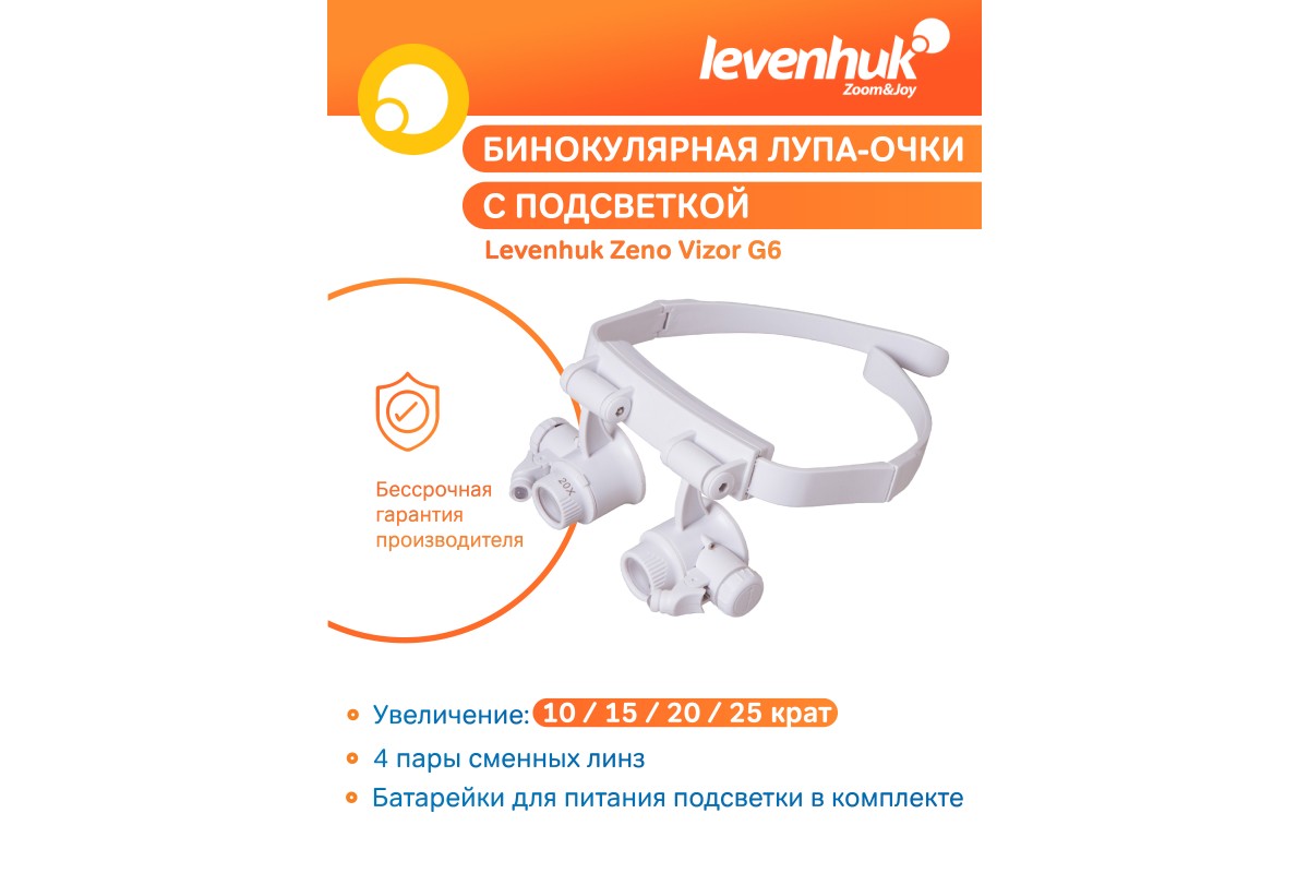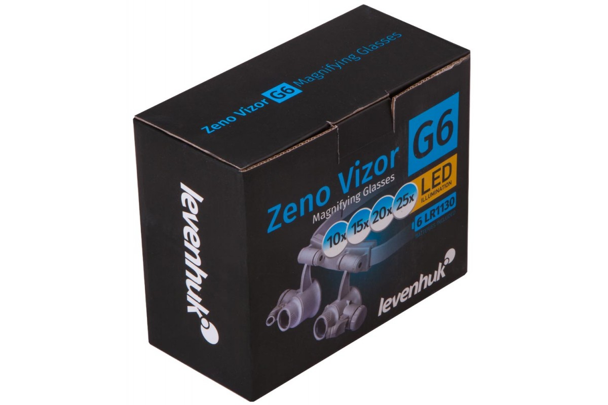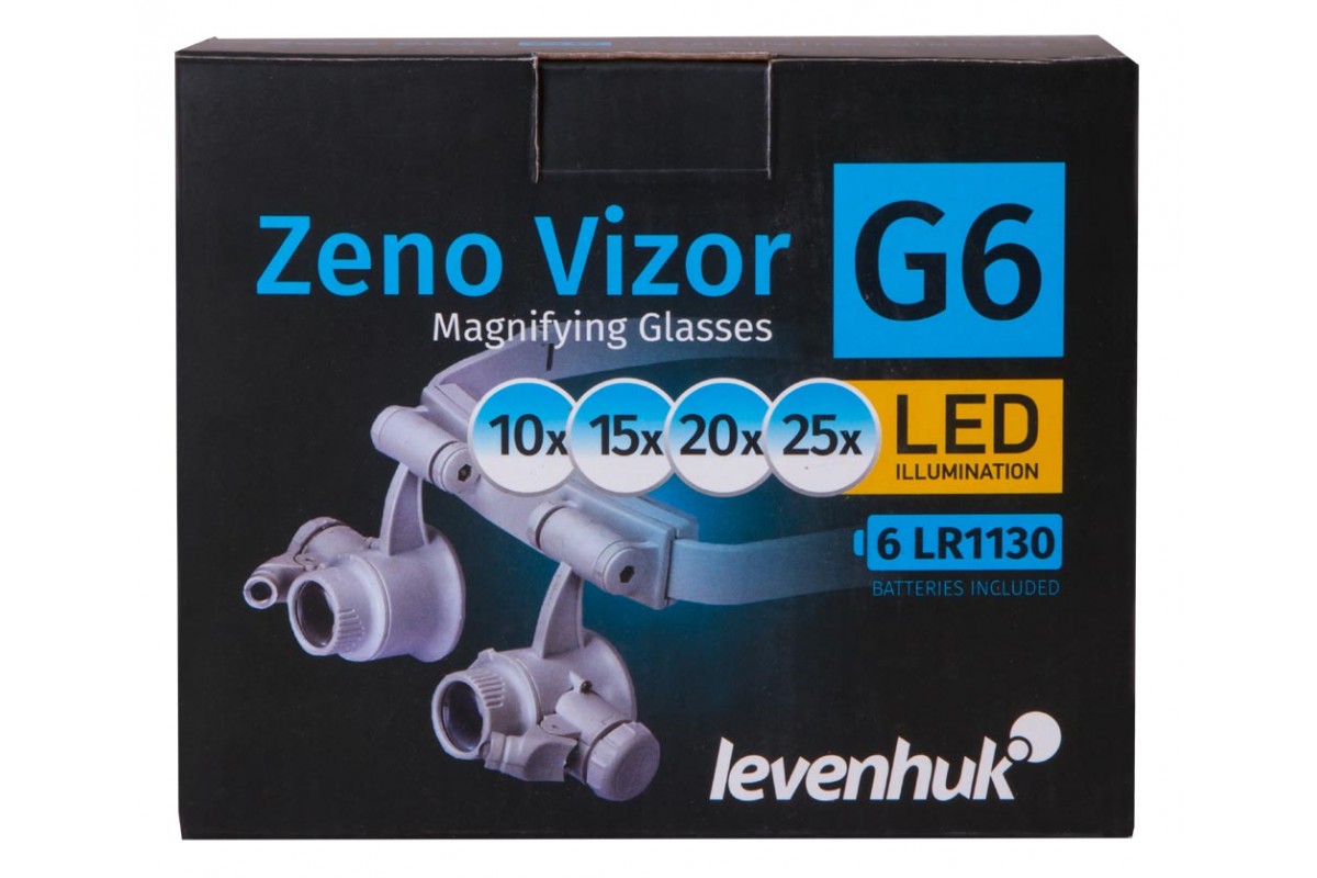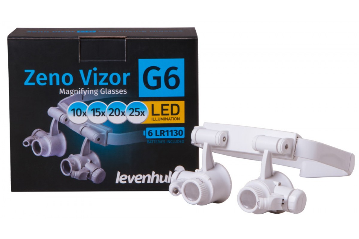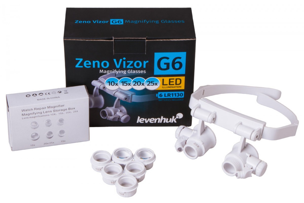 Бинокулярная лупа-очки Levenhuk Zeno Vizor G6 – оптический инструмент для тех, кто работает с мелкими предметами – электронными платами, часовыми механизмами, ювелирными изделиями. Лупа комплектуется четырьмя парными комплектами линз, дающими разное увеличение, поэтому настроить оптику под свои задачи не составит труда. Длину крепления лупы можно регулировать, поэтому Levenhuk Zeno Vizor G6 можно зафиксировать на голове максимально удобным образом. Руки при этом останутся полностью свободными.