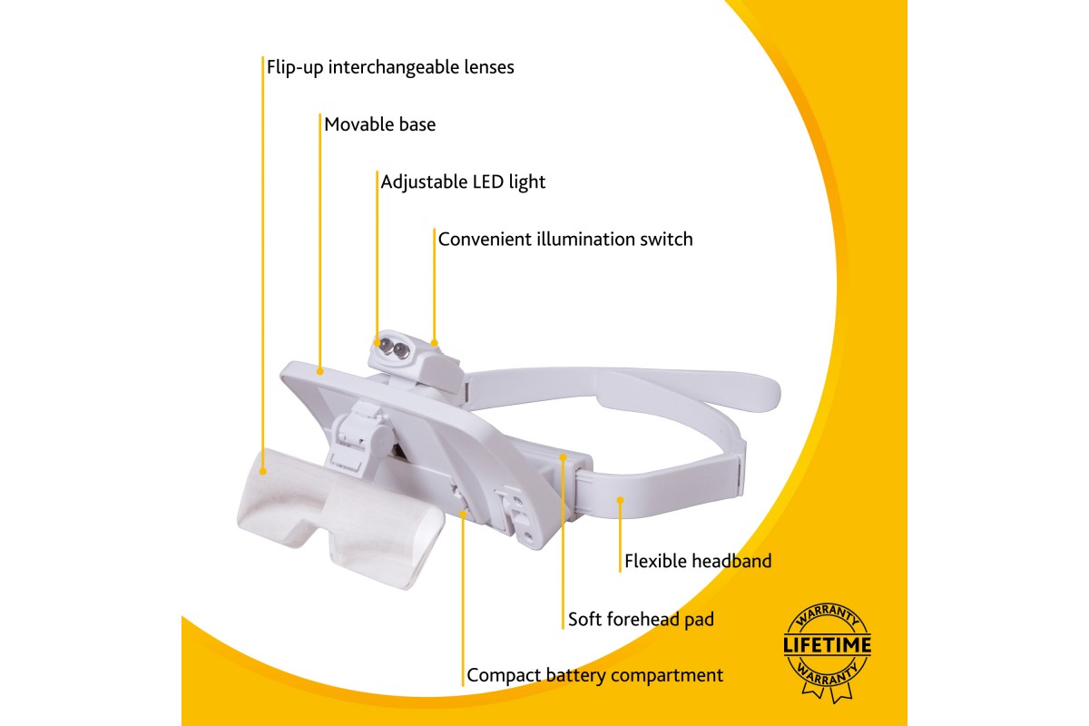 Благодаря головному креплению лупа не занимает руки во время работы, они остаются полностью свободными. Длину дужек крепления можно регулировать. Еще одна особенность – изменение положения установленной линзы. Ее можно отвернуть наверх, а после вернуть обратно на место.