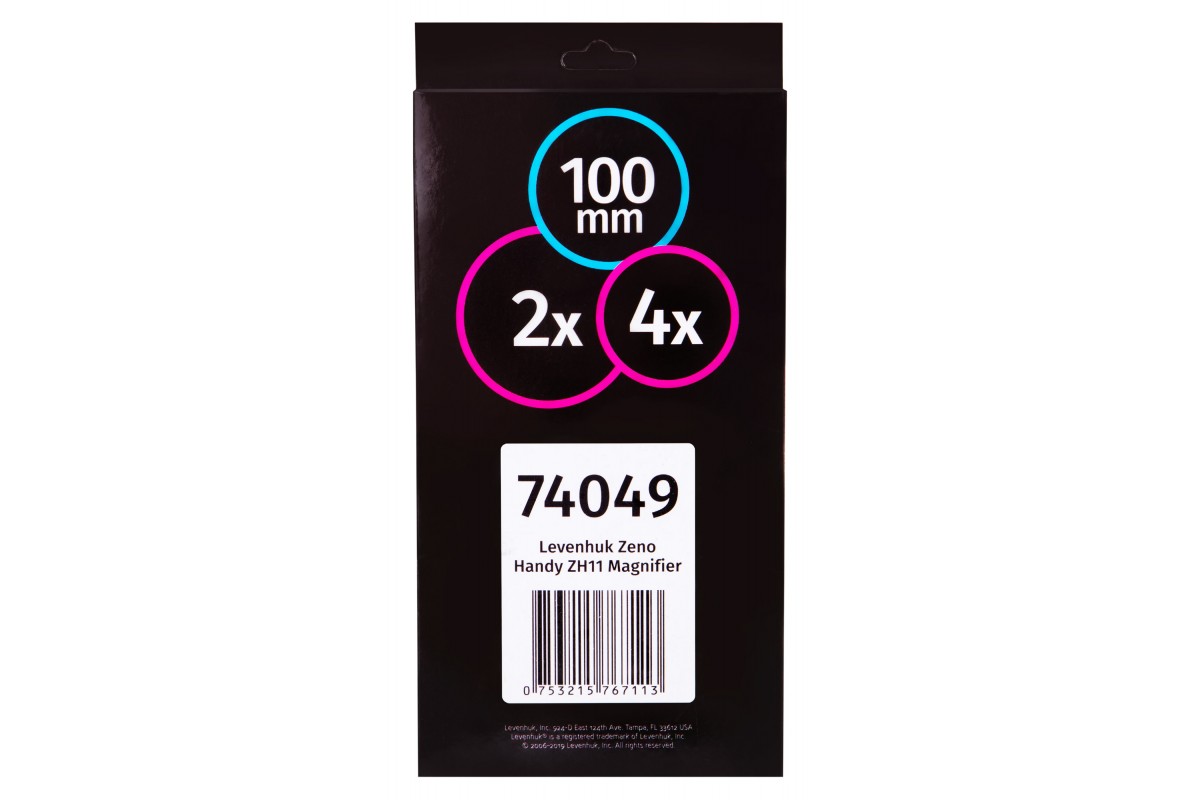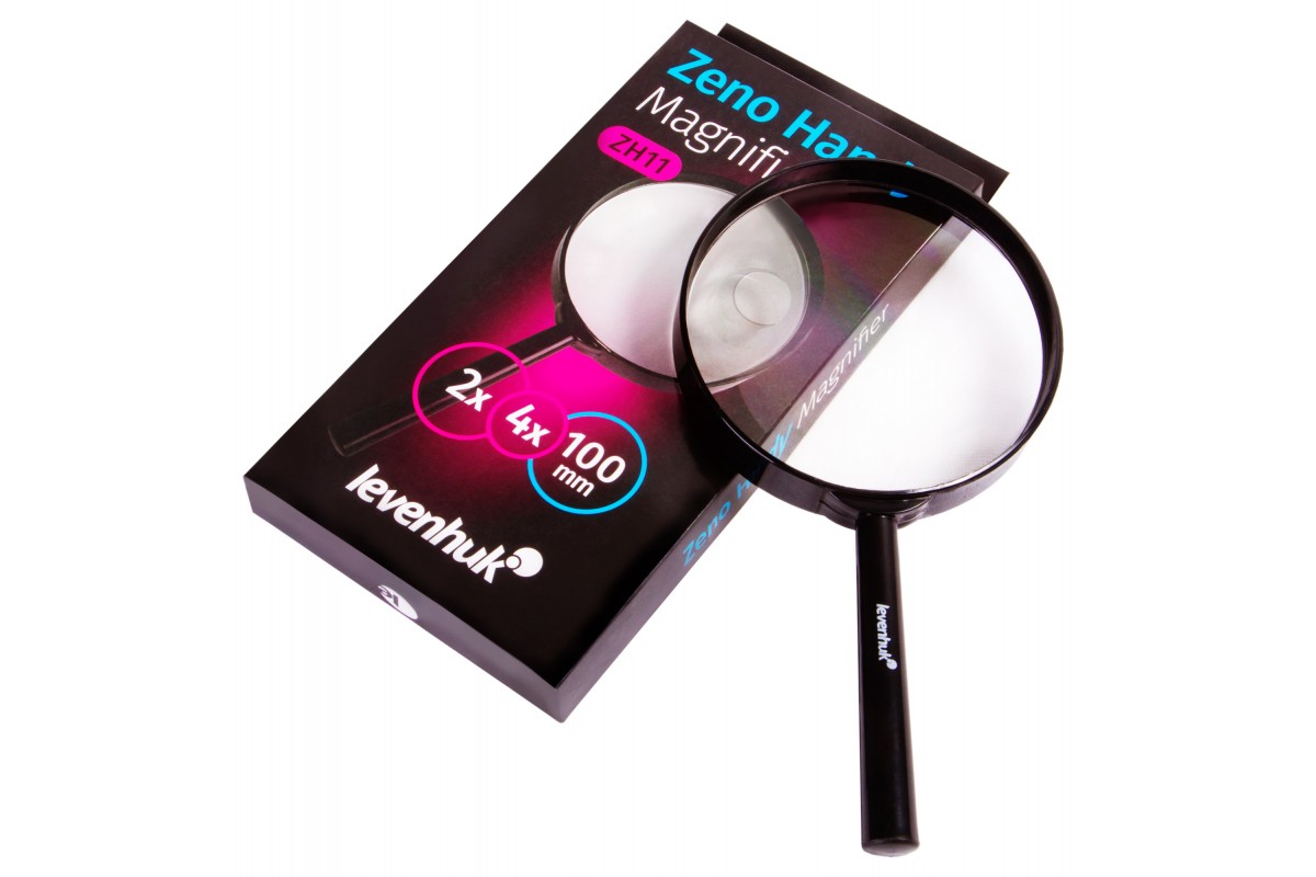Levenhuk Zeno Handy ZH11 – это просмотровая лупа диаметром 100 мм, обеспечивающая увеличение в 2 крата. Линза сделана из пластика, но качество изображения высокое – искажения или мутность в передаваемой картинке полностью отсутствуют. В основную линзу встроена линза меньшего диаметра (20 мм). Она дает увеличение в 4 крата, что позволяет детально изучать мелкие объекты.