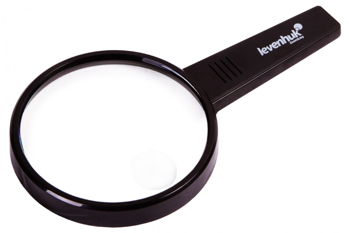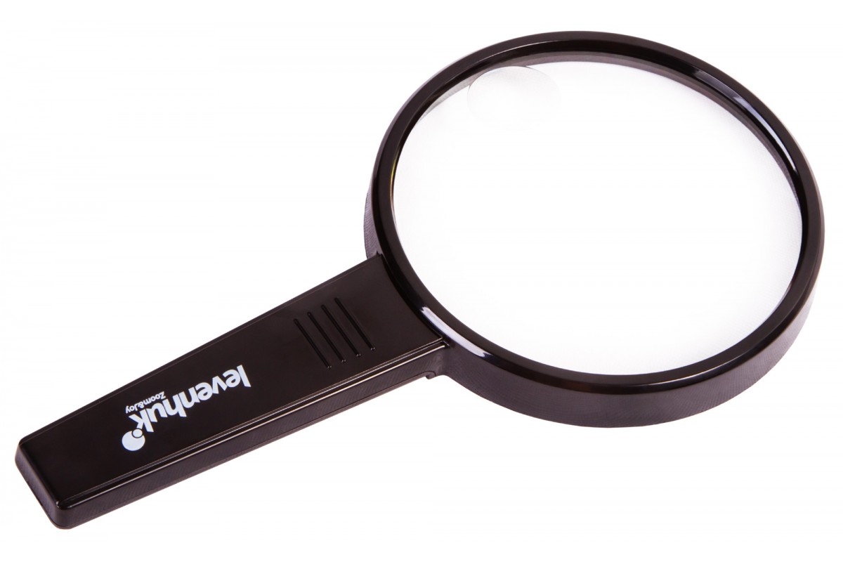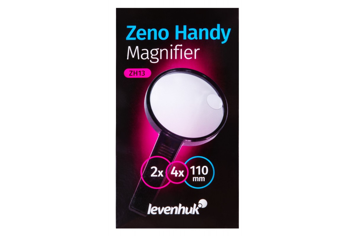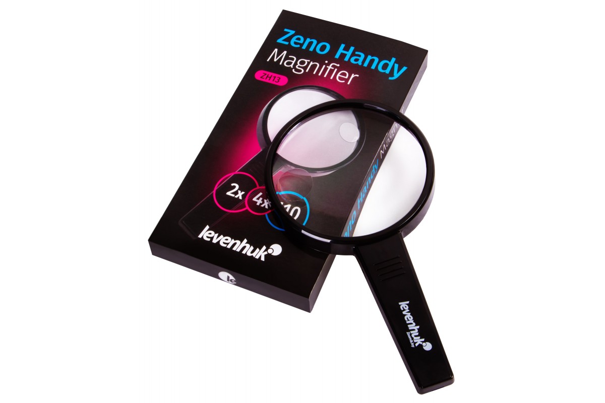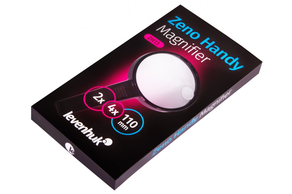 Levenhuk Zeno Handy ZH13 – лупа с линзой большого диаметра (110 мм), которая дает 2-кратное увеличение. В ней расположена малая линза диаметром 25 мм, которая дает большее увеличение – 4 крата. Лупа отлично подходит для рассматривания мелких объектов, чтения текста и изучения небольших деталей на поверхностях предметов.