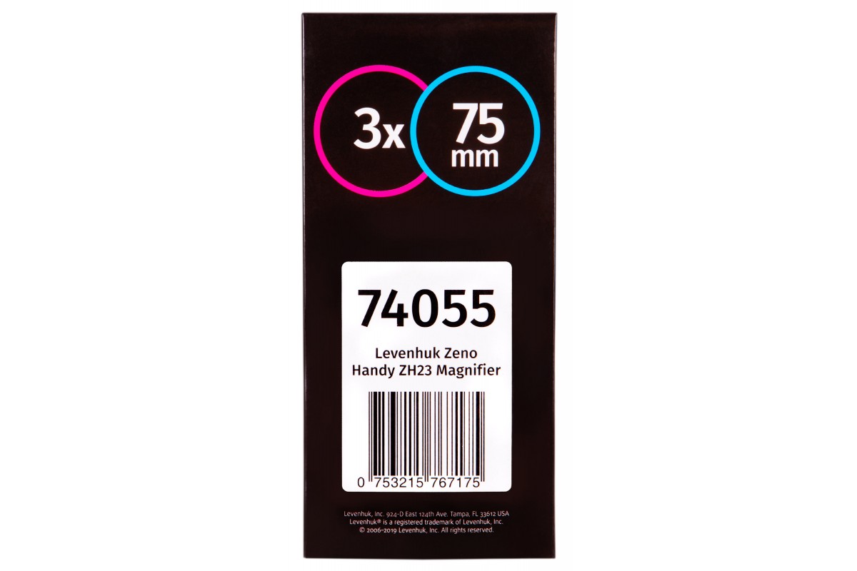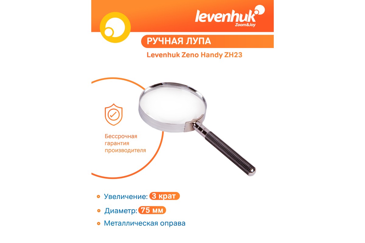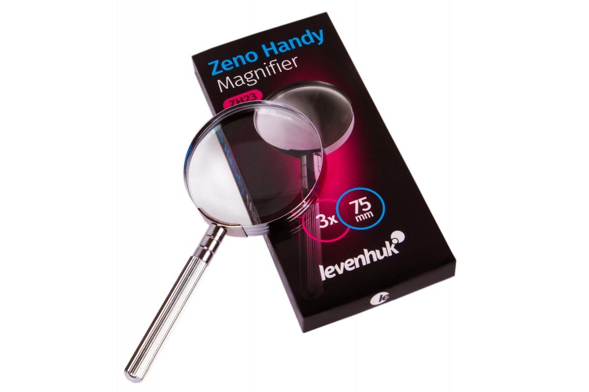 Levenhuk Zeno Handy ZH23 – лупа на ручке с 3-кратным увеличением. Линза сделана из пластика, но передает четкое изображение без искажений. Она защищена металлической оправой, поэтому прослужит долго. Ручка тоже сделана из металла, ее ребристая поверхность увеличивает надежность хвата.