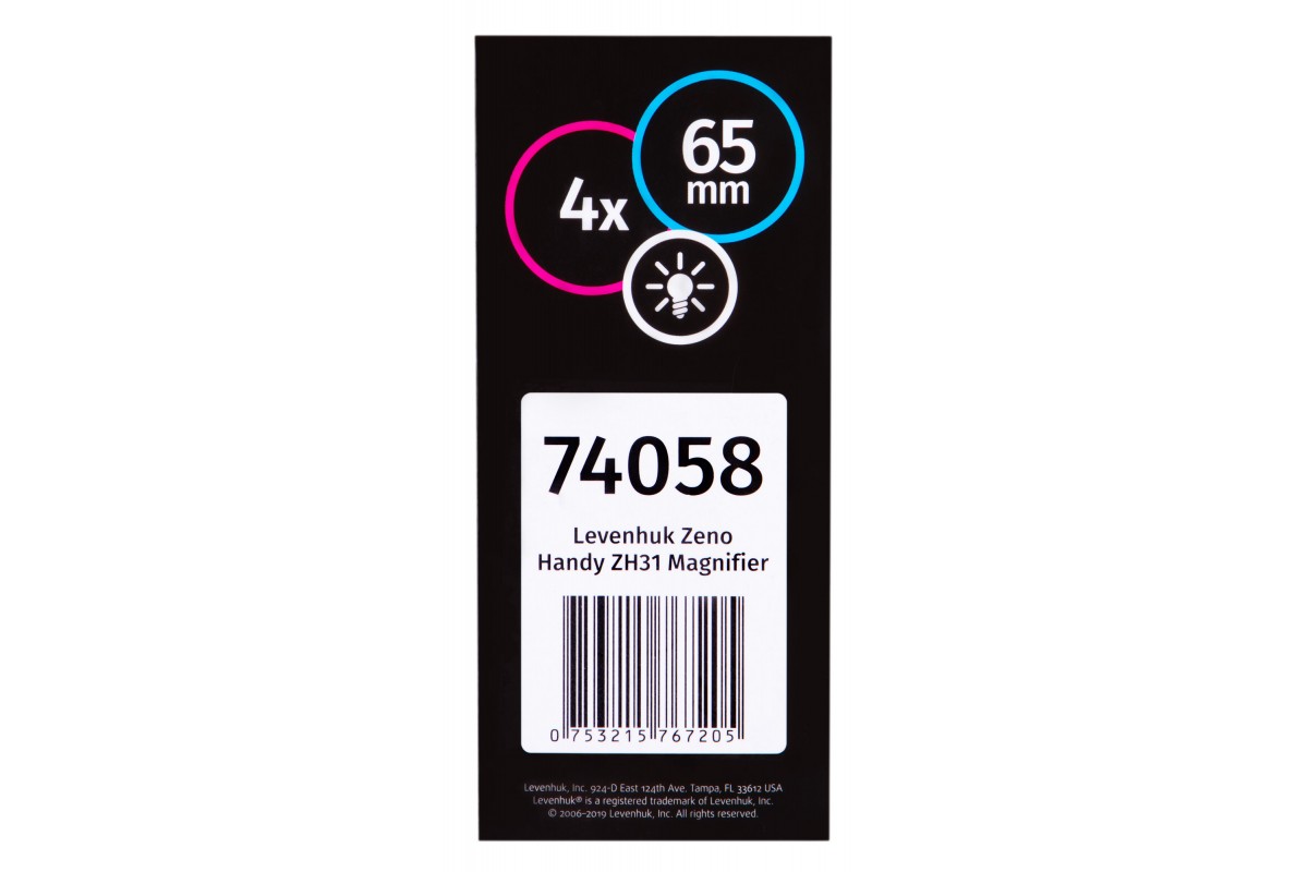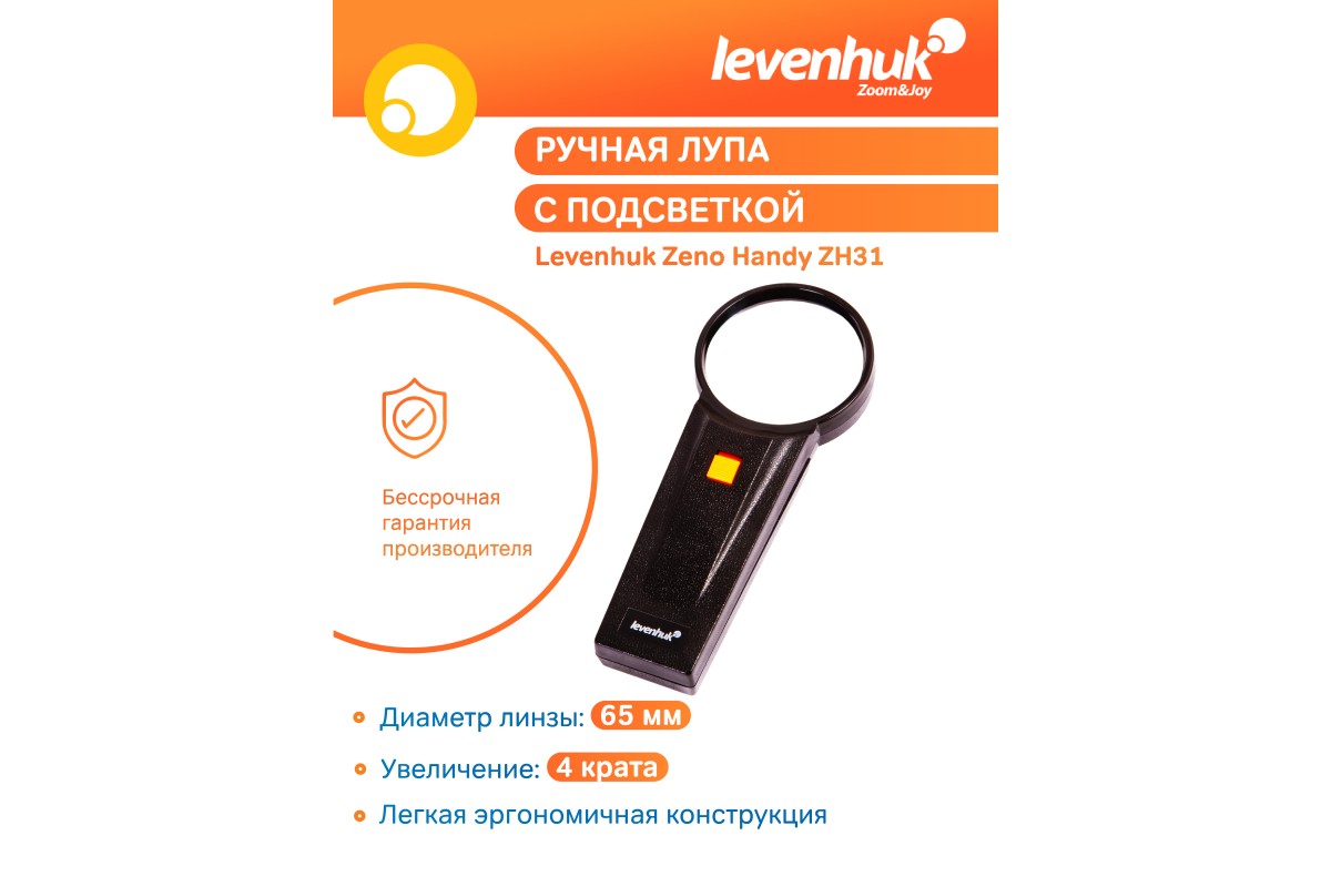 Просмотровая лупа Levenhuk Zeno Handy ZH31 удобна тем, что имеет подсветку. Благодаря этому ее можно использовать в ситуациях, когда внешнего освещения недостаточно. Лупа приближает в 4 раза, дает возможность изучать область диаметром до 65 мм, отлично подходит для рассматривания мелких деталей и объектов.