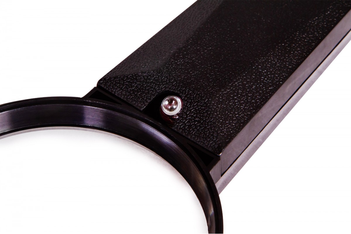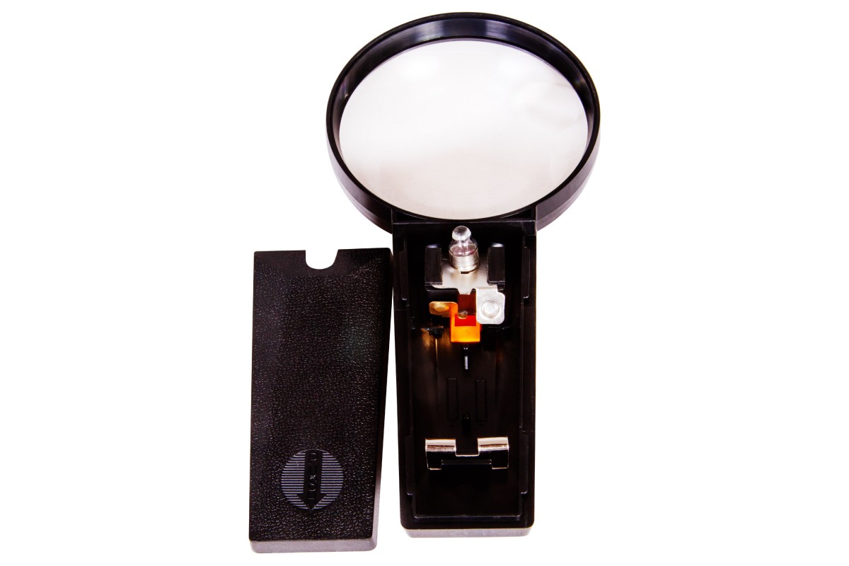 Диаметр лупы составляет 90 мм, доступны два увеличения – 2 и 6 крат. Все элементы оптики и корпуса сделаны из пластика. Для работы подсветки требуются батарейки (нет в комплекте).