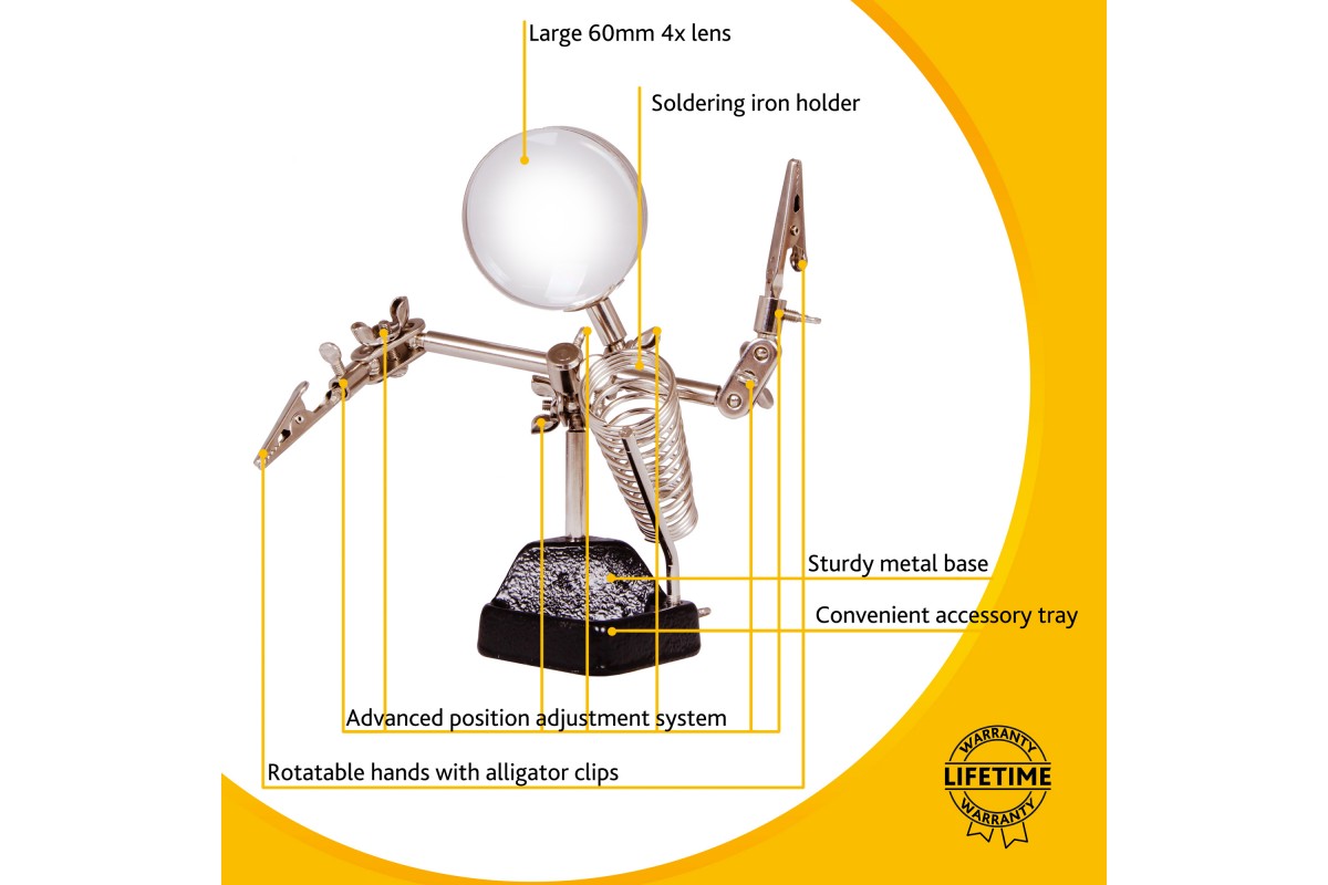 Линза штативной лупы Levenhuk Zeno Refit ZF11 дает 4-кратное увеличение. Она выполнена из оптического пластика, а оправа и корпус – из металла. Еще одно преимущество лупы – возможность перемещать линзу по горизонтали и наклонять под разными углами. В конструкции предусмотрен отдельный держатель для паяльника. В устойчивом основании лупы расположен лоток для размещения мелких деталей и инструментов.