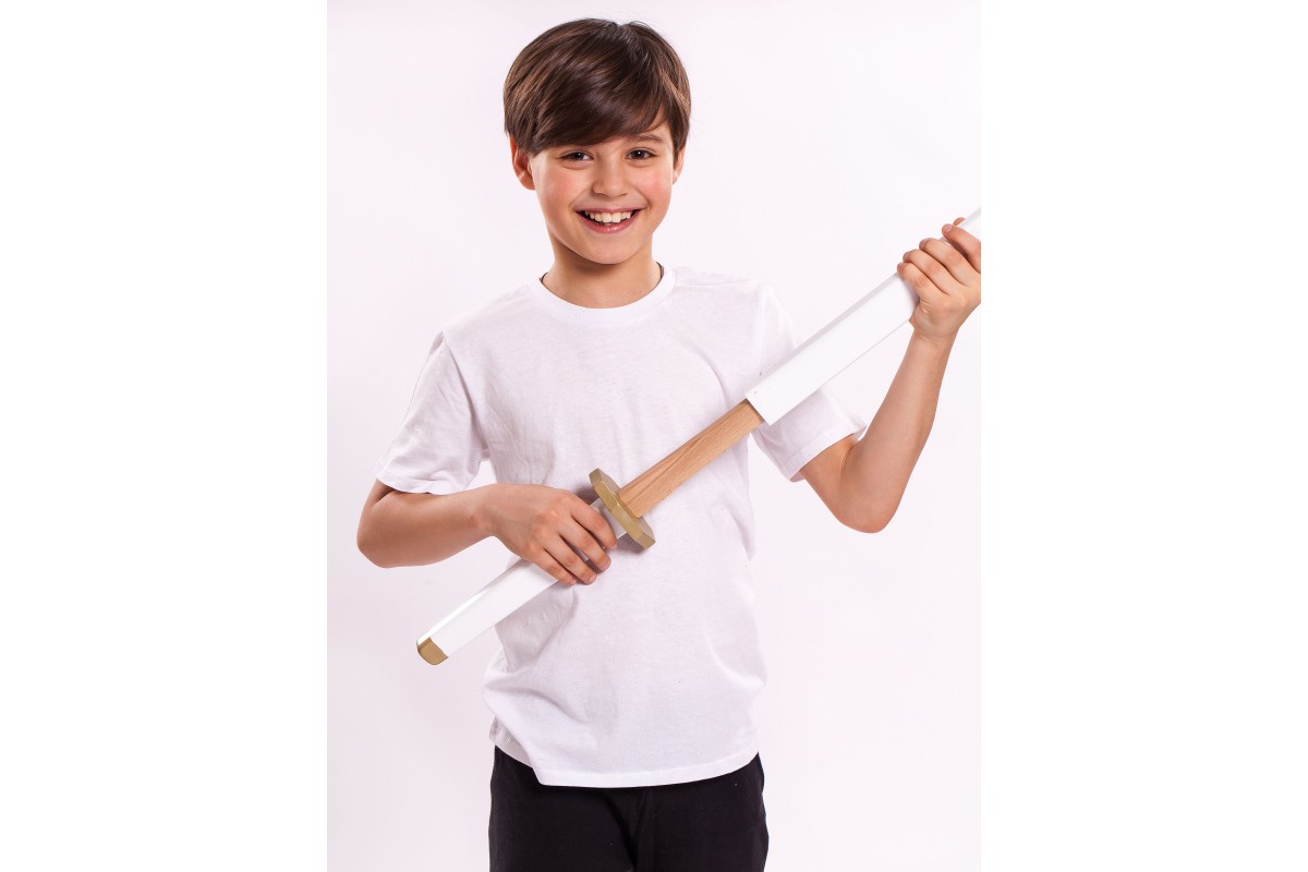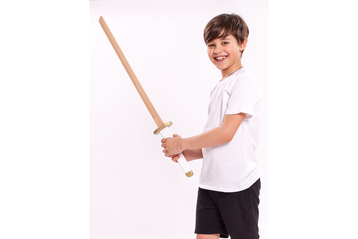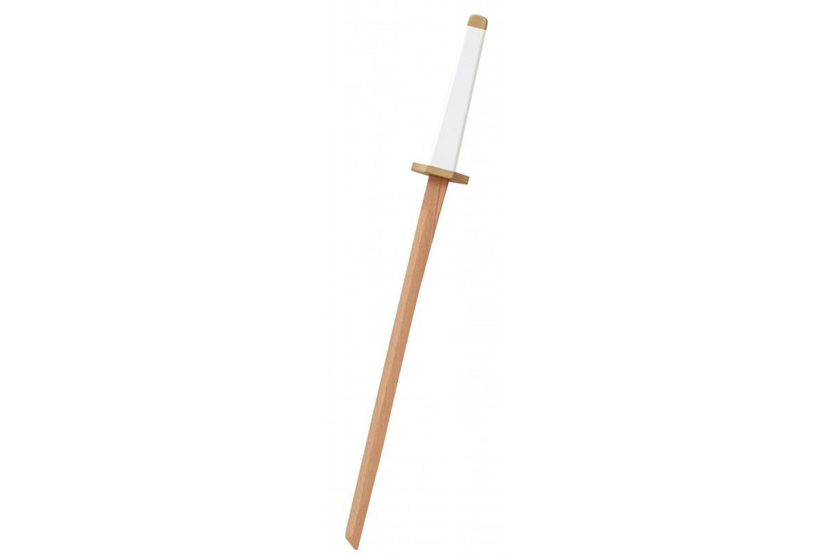 Клинок - это деревянная катана, как настоящая с деревянными ножнами, окрашенными безопасной золотой и белой краской. Будет отличным подарком вашим детям или как сувенир родным.