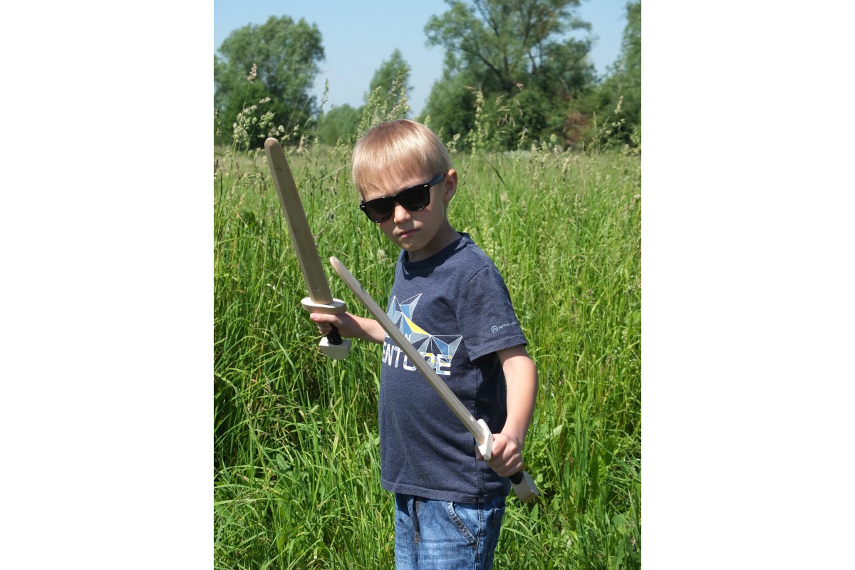 Детское деревянное оружие изготовлено из массива бука, отшлифовано. На рукоятках используется натуральная кожа, чтобы рука не скользила. Выдерживает самые сильные удары и готова к полноценной игре или занятиям в кружках, секциях.