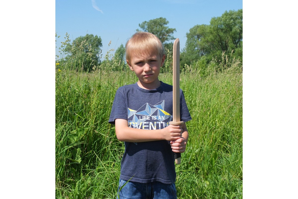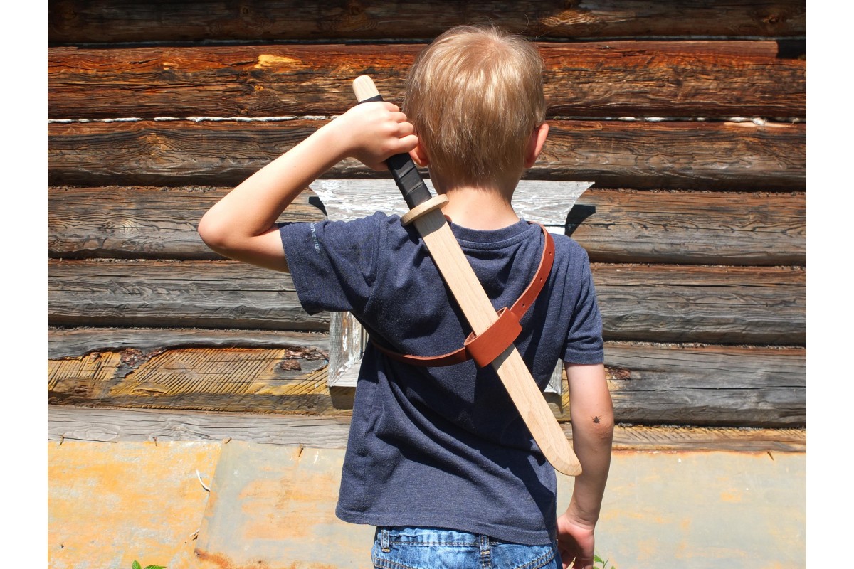 Детское деревянное оружие изготовлено из массива бука, отшлифовано. На рукоятках используется натуральная кожа, чтобы рука не скользила. Выдерживает самые сильные удары и готова к полноценной игре или занятиям в кружках, секциях.