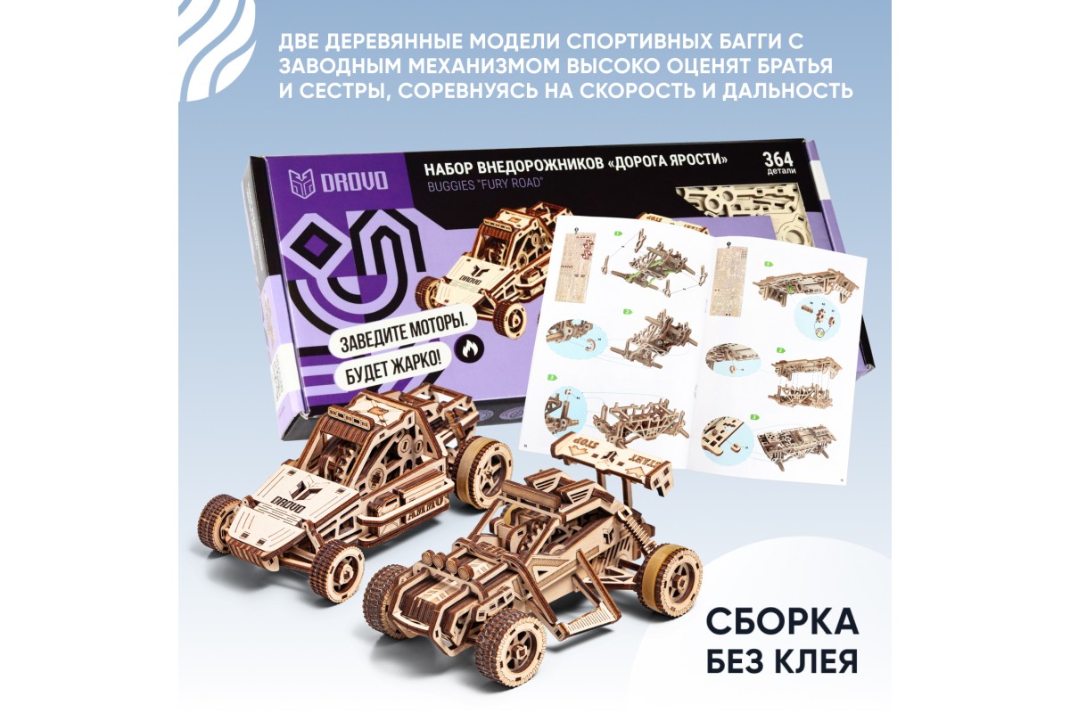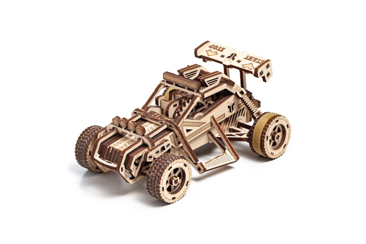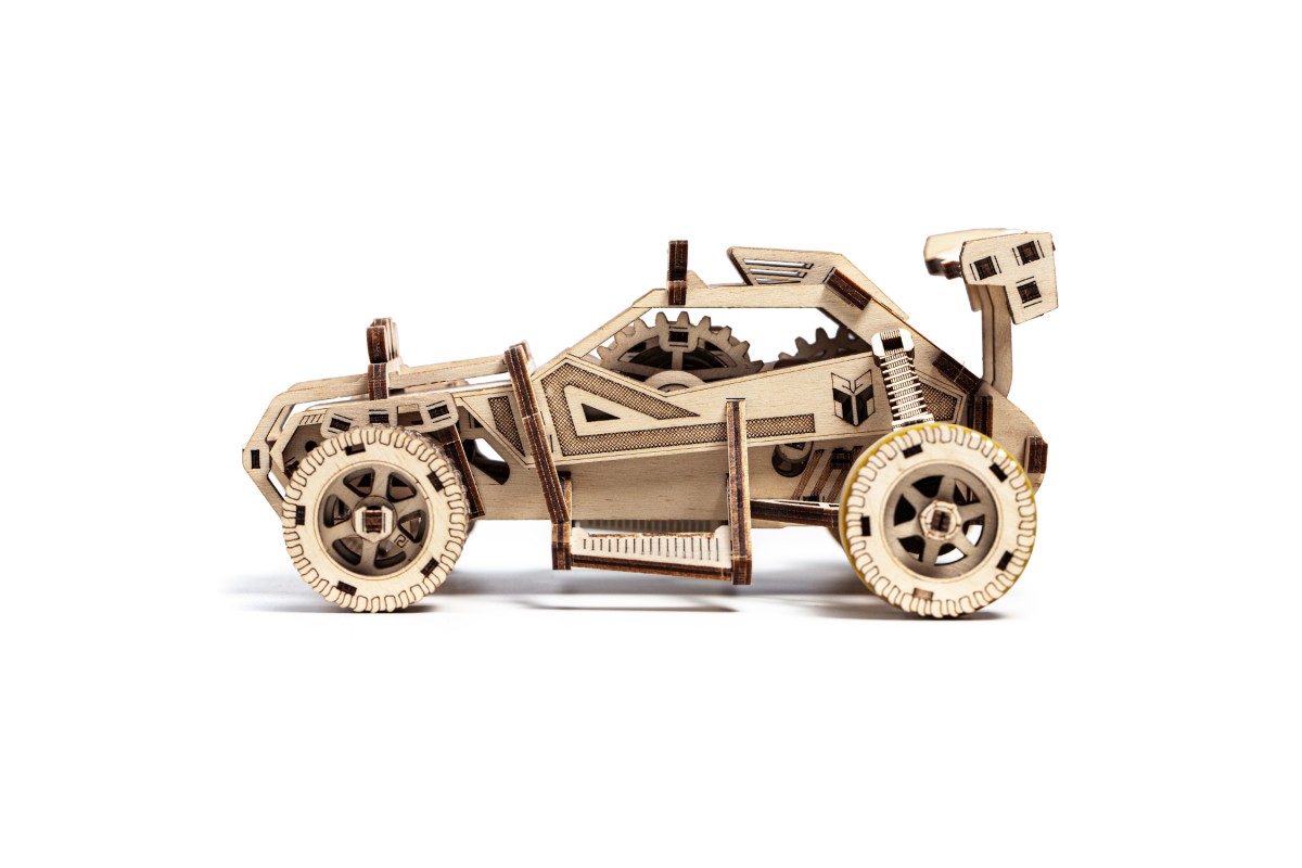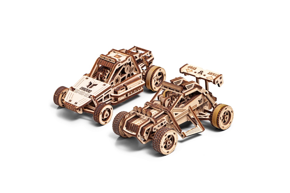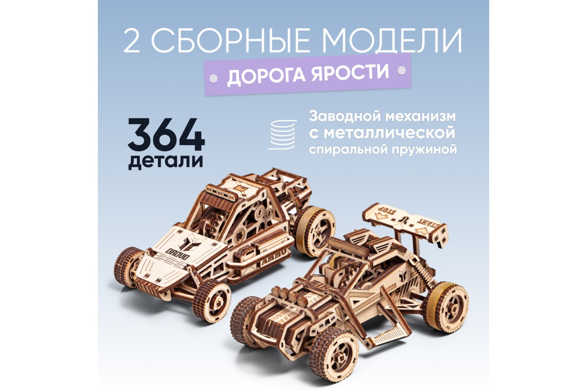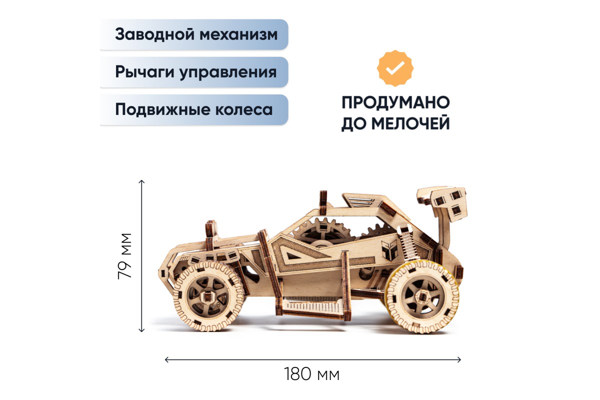 Две деревянные модели спортивных багги с заводным механизмом высоко оценят братья и сестры соревнуясь на скорость и дальность. С деревянным 3D пазлом с заводным механизмом можно играть вместе даже взрослым. В качестве мотора используется металлическая спиральная пружина, которая не высыхает, не растягивается и служит дольше.