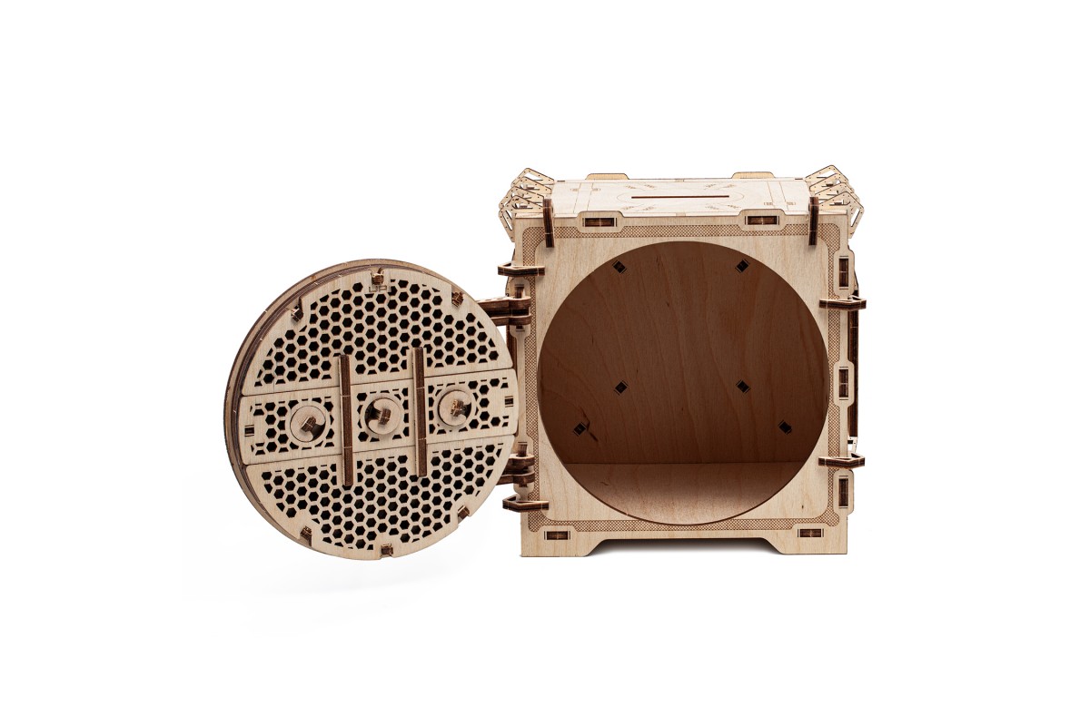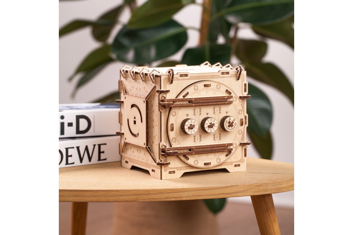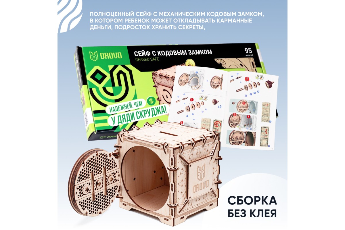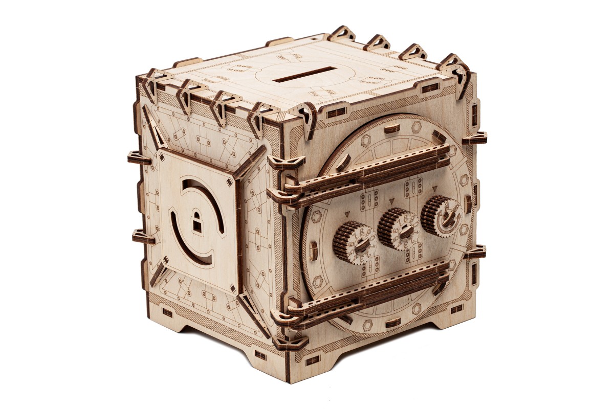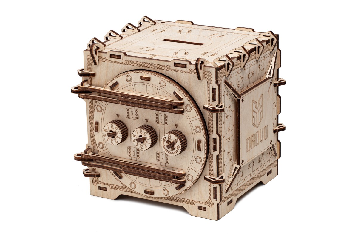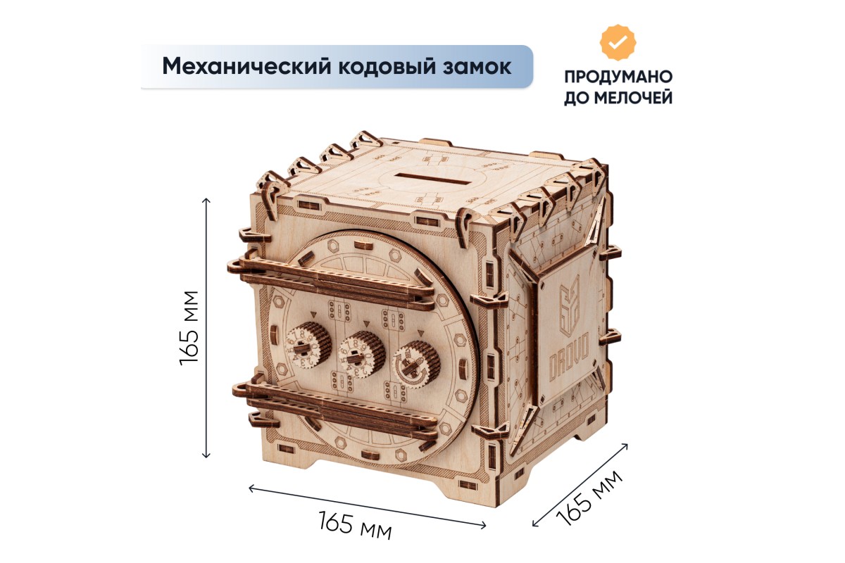 Сборная модель из дерева представляет собой полноценный сейф с механическим кодовым замком, в котором ребенок может откладывать карманные деньги, подросток хранить секреты, а взрослый спрятать дополнительный подарок в сейфе – получатель будет в восторге от сюрприза!