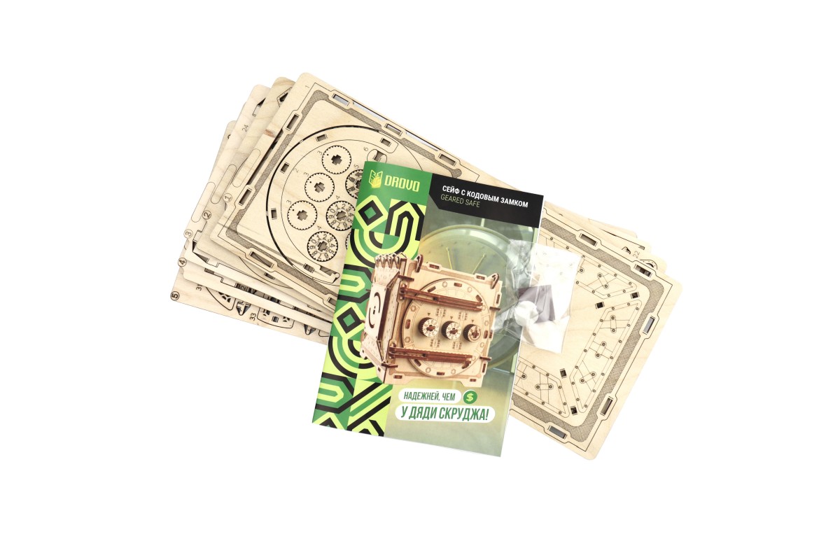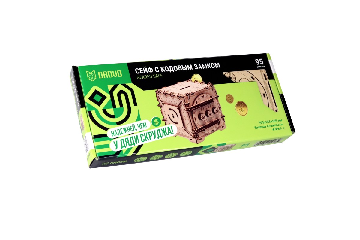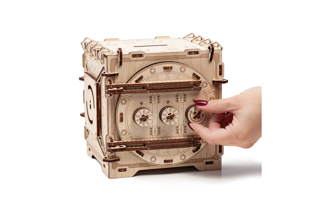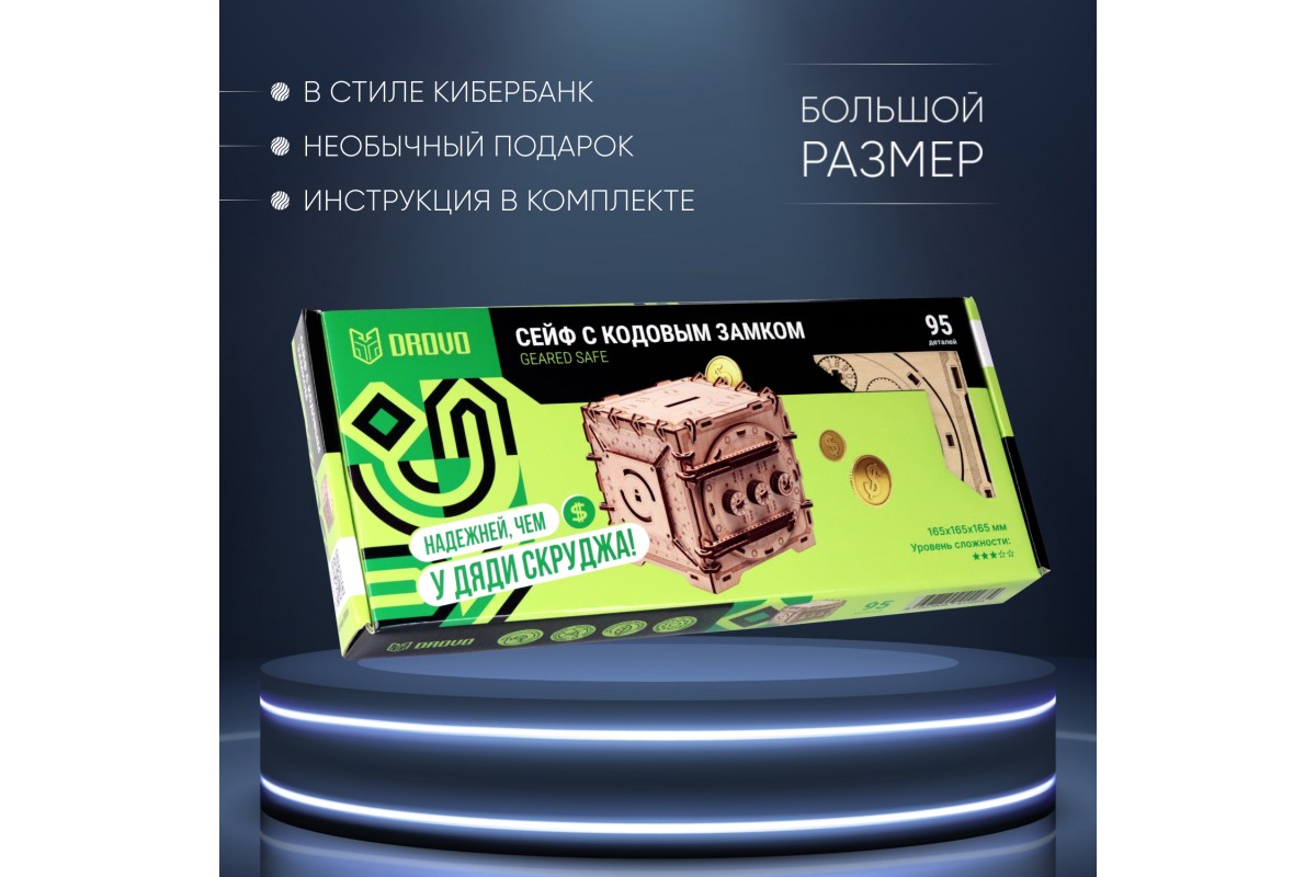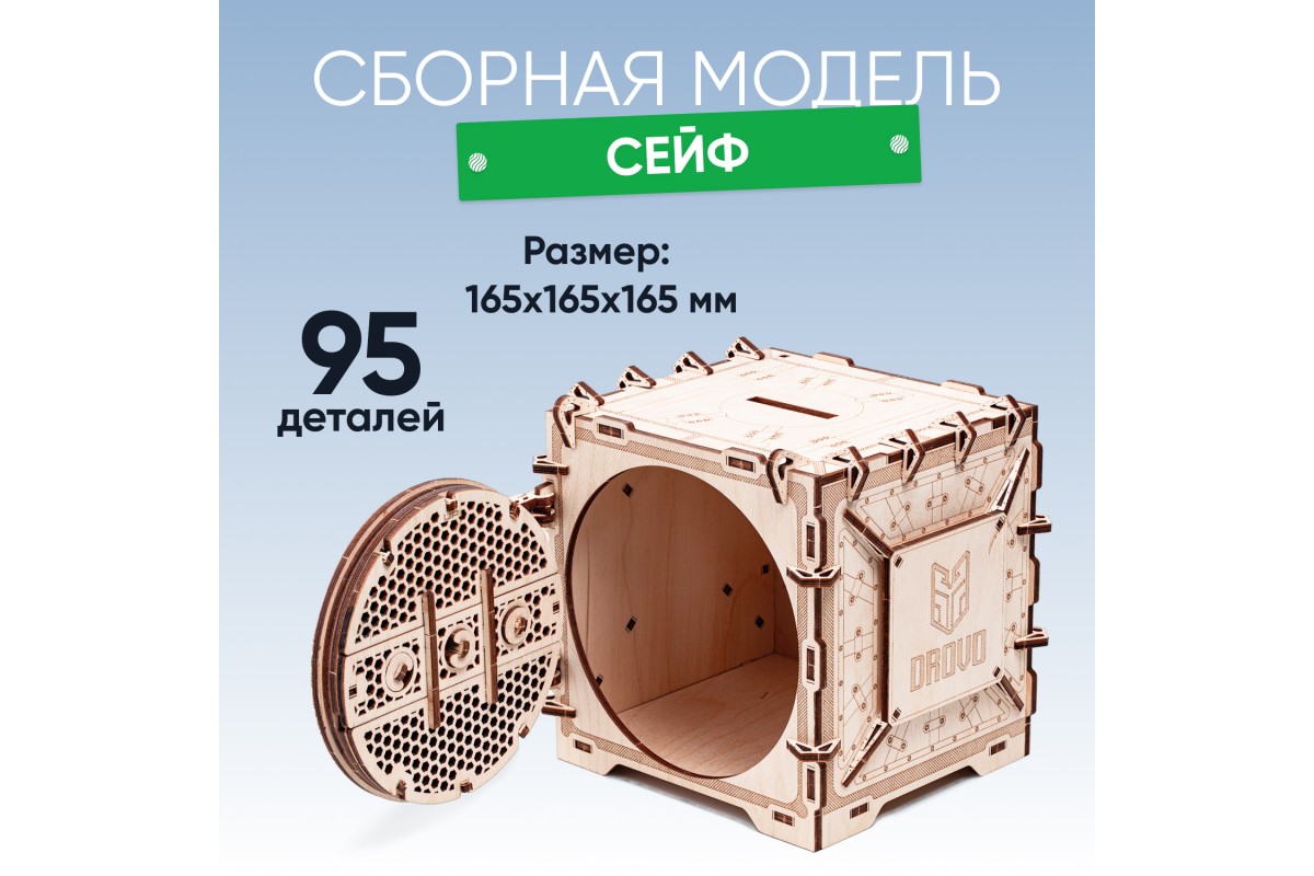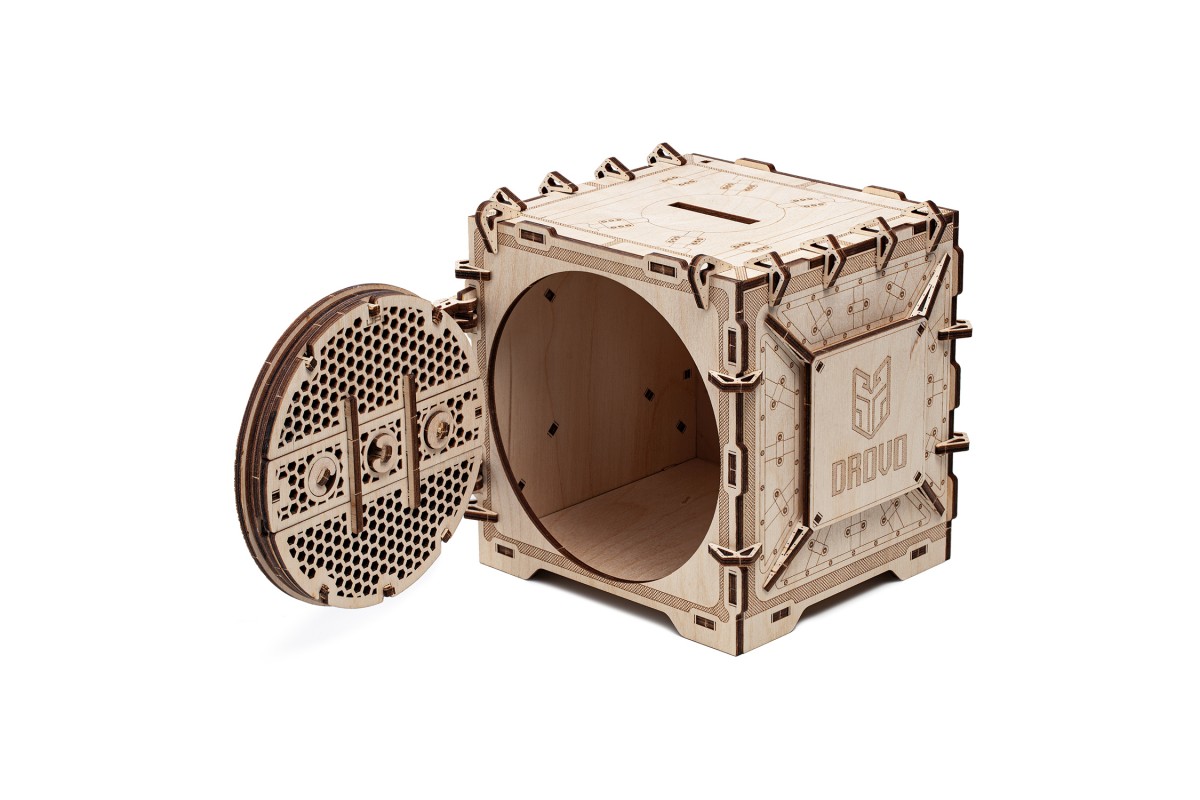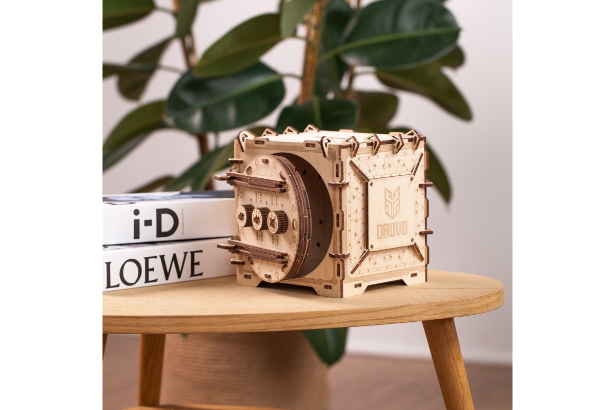 Сборная модель из дерева представляет собой полноценный сейф с механическим кодовым замком, в котором ребенок может откладывать карманные деньги, подросток хранить секреты, а взрослый спрятать дополнительный подарок в сейфе – получатель будет в восторге от сюрприза!