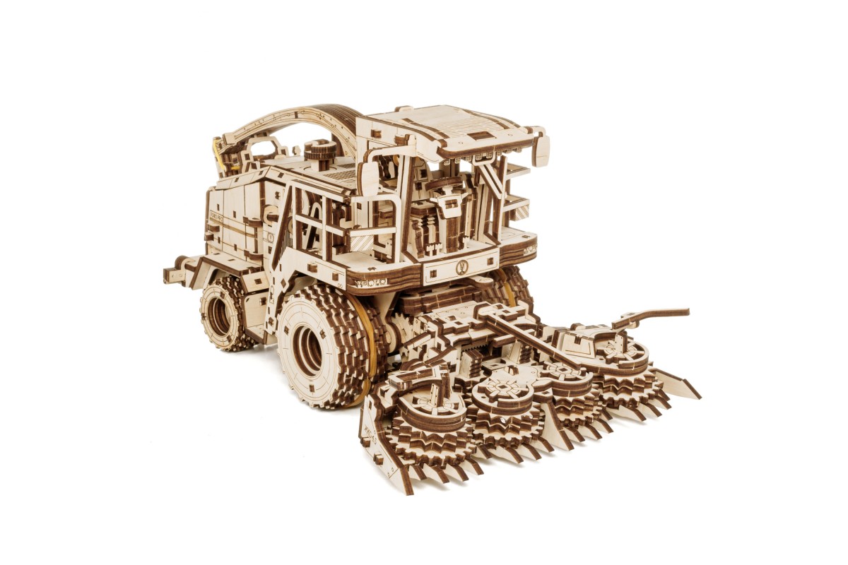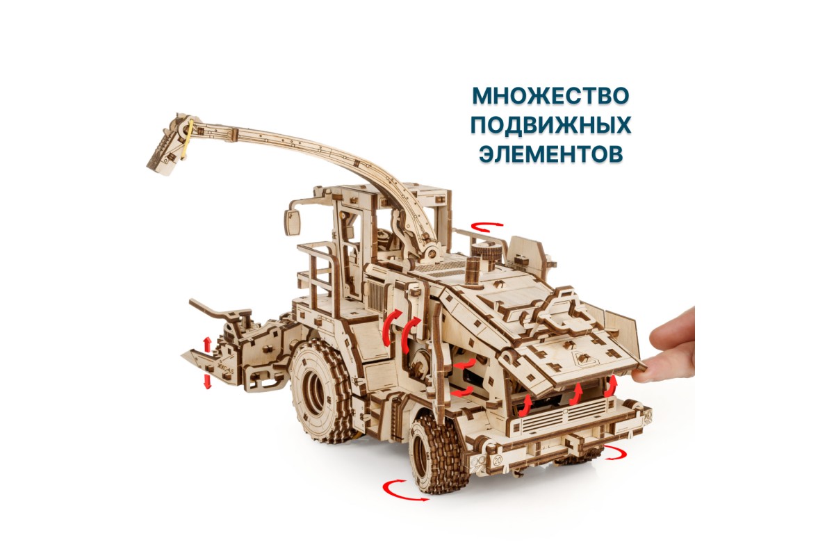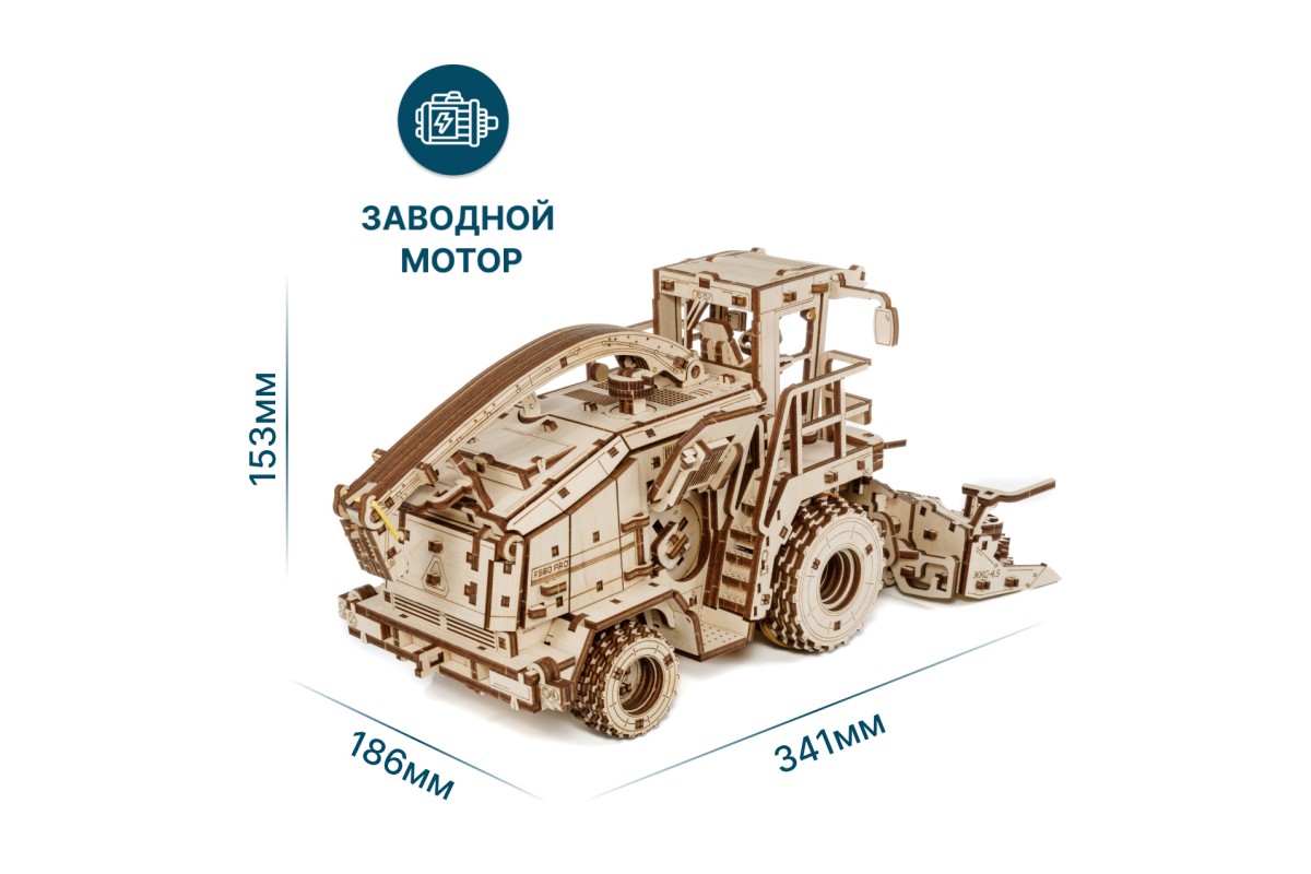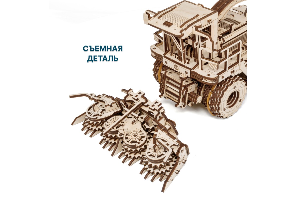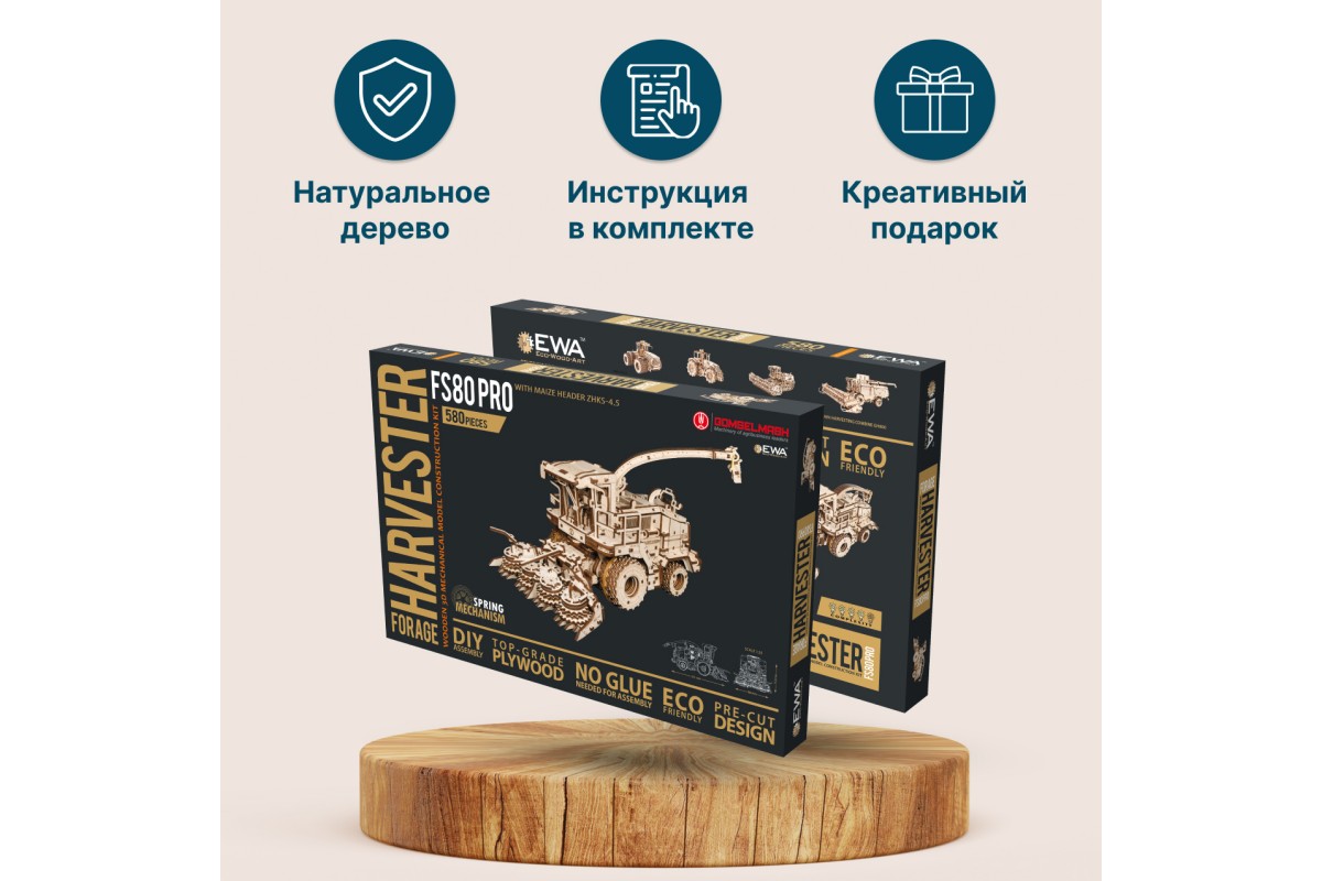 Деревянная механическая сборная модель EWA Комбайн с жаткой FS80 PRO для грубостебельных культур с мотором - отличный подарок на любой праздник для ребенка, и для взрослого человека, который увлекается конструированием и моделированием.