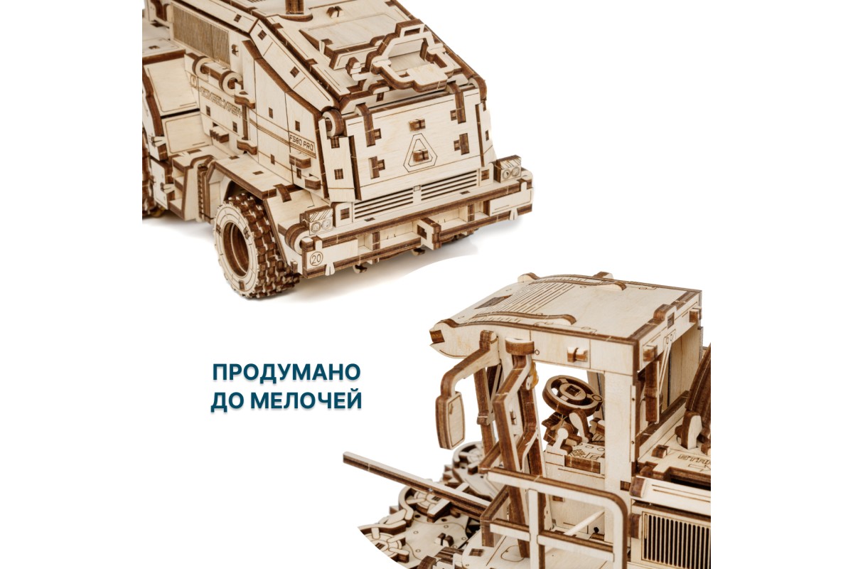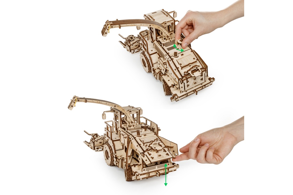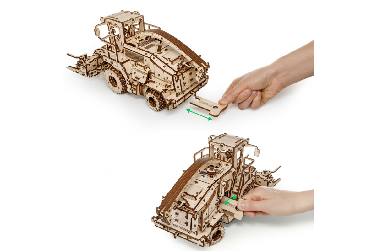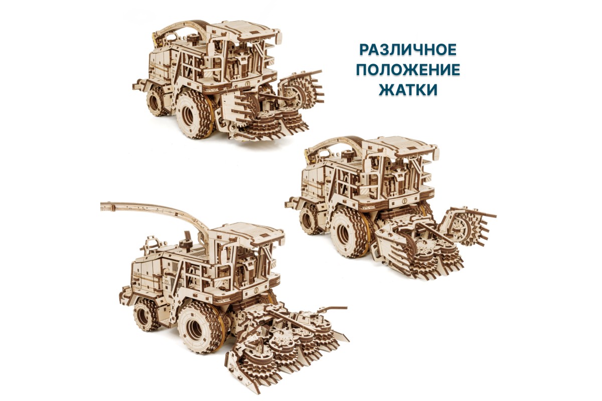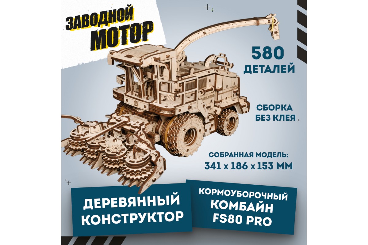 Деревянная механическая сборная модель EWA Комбайн с жаткой FS80 PRO для грубостебельных культур с мотором - отличный подарок на любой праздник для ребенка, и для взрослого человека, который увлекается конструированием и моделированием.