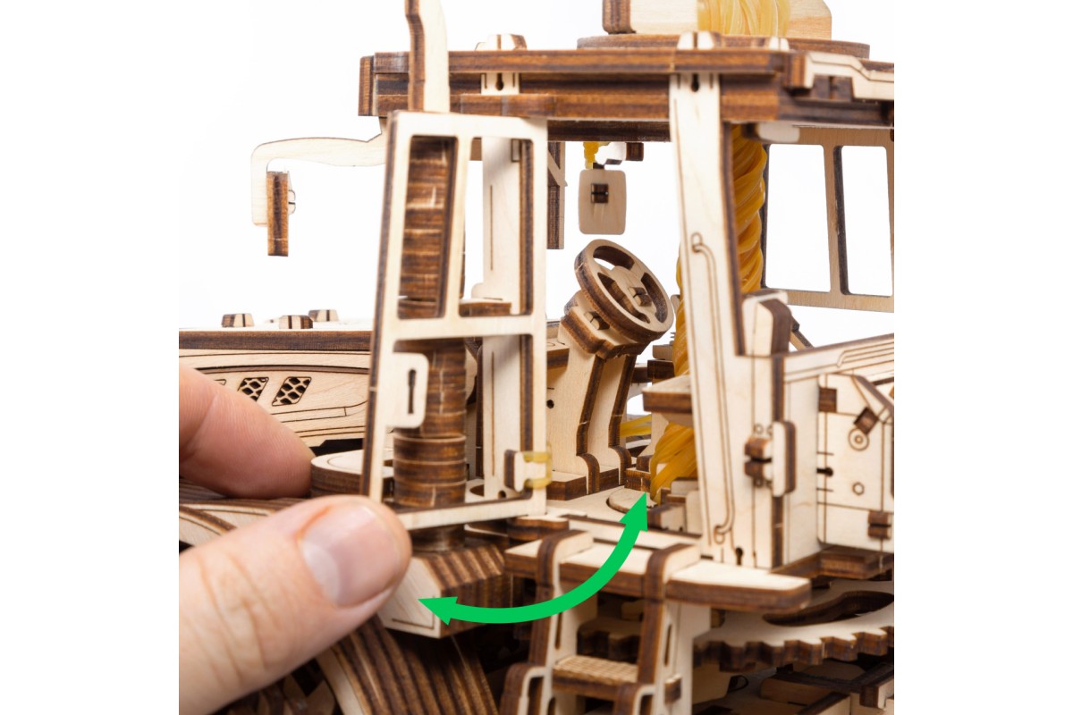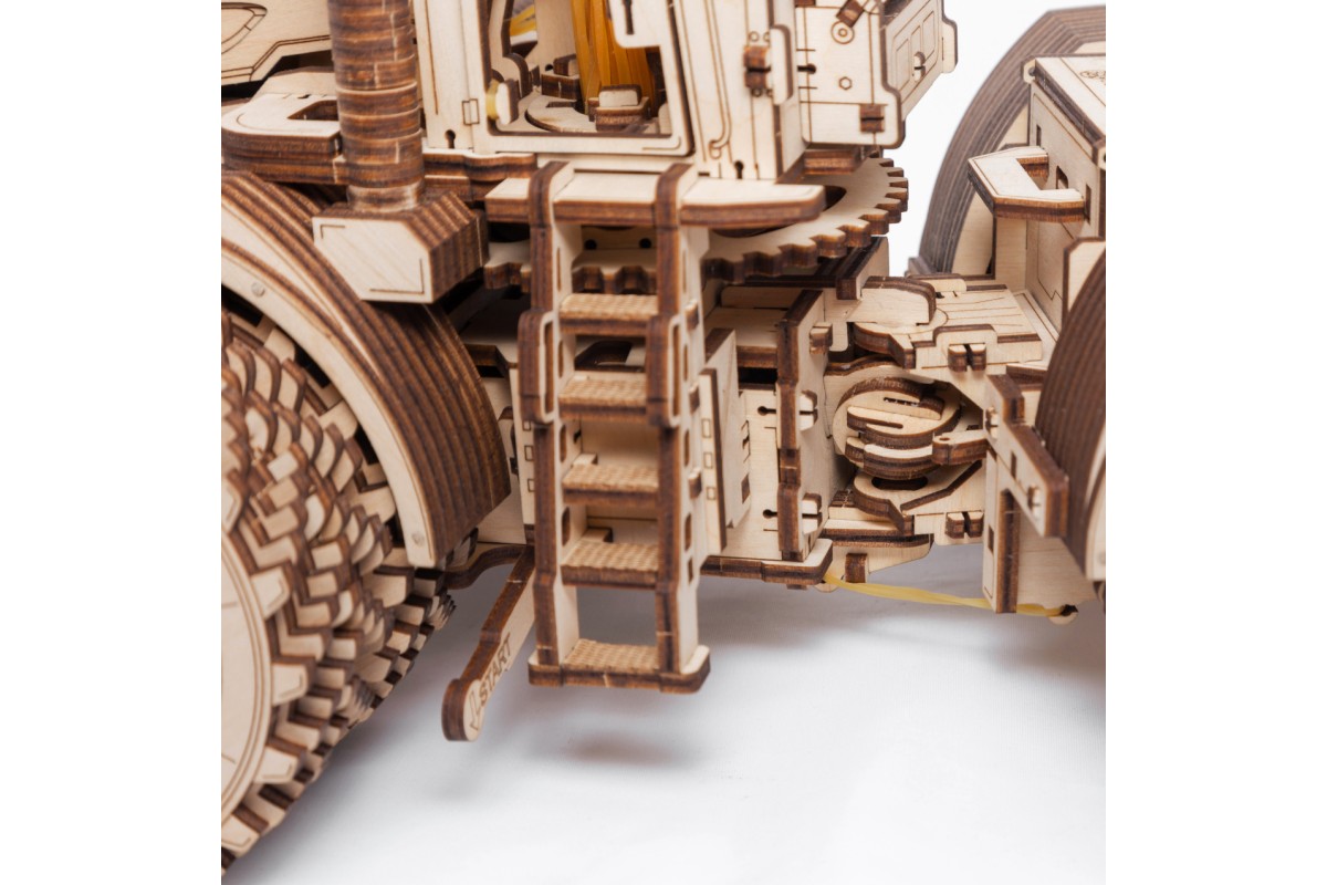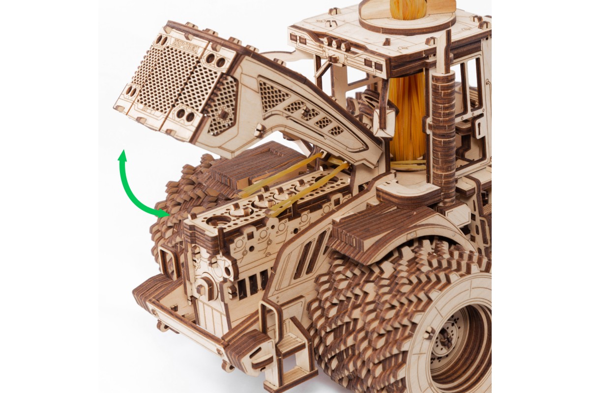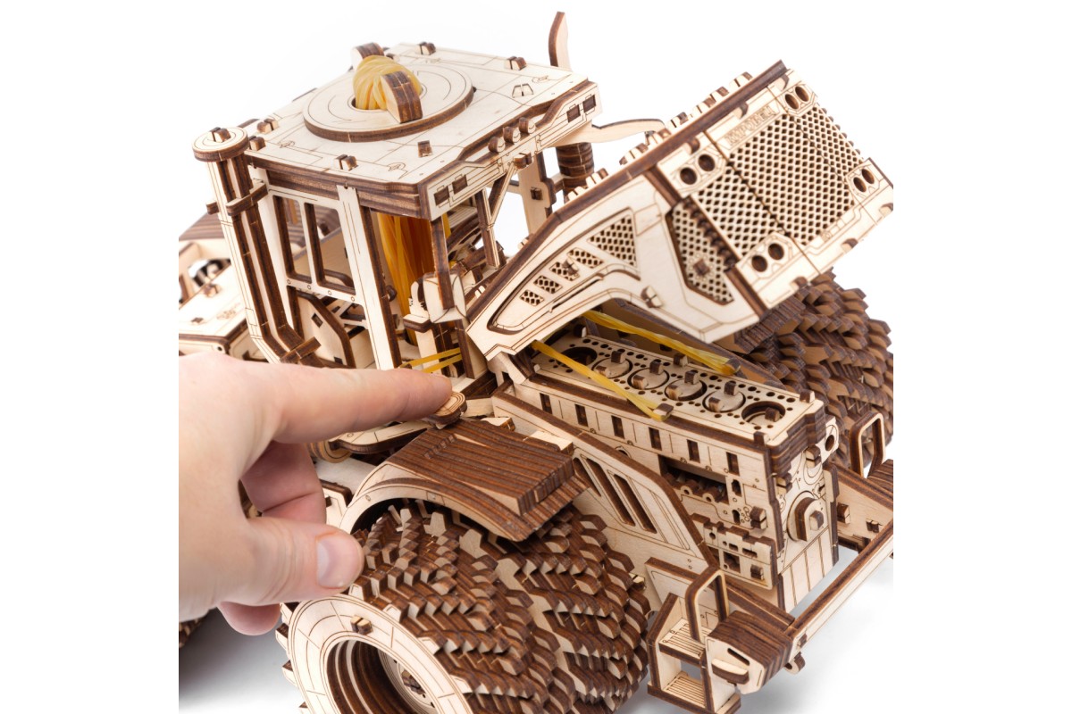 Механический конструктор Кировец имеет резиномотор, с помощью которого машина может двигаться вперед и назад, также имеет нейтральный режим и систему Старт-Стоп. Поднимите капот и увидите настоящий двигатель с шестью цилиндрами. Так же у модели из дерева открываются двери и крутятся колеса.