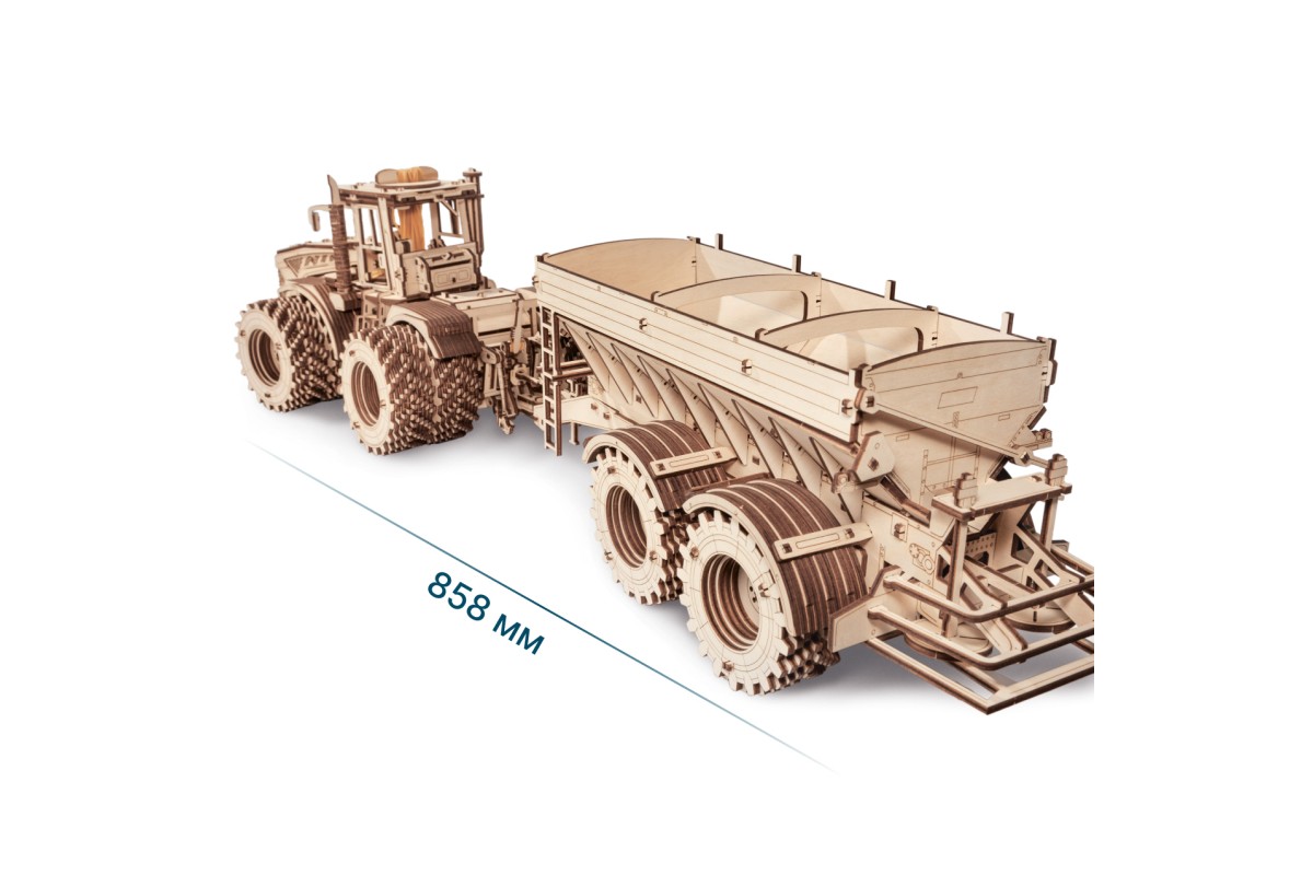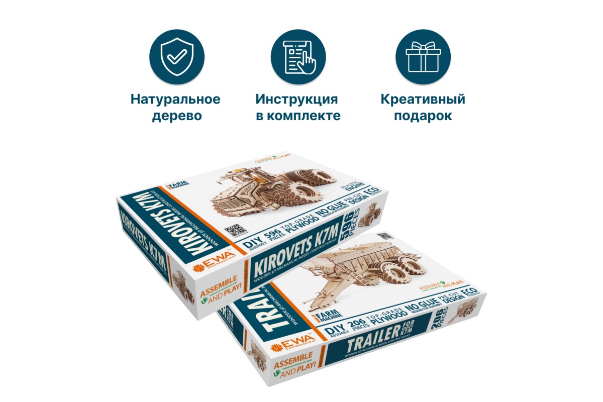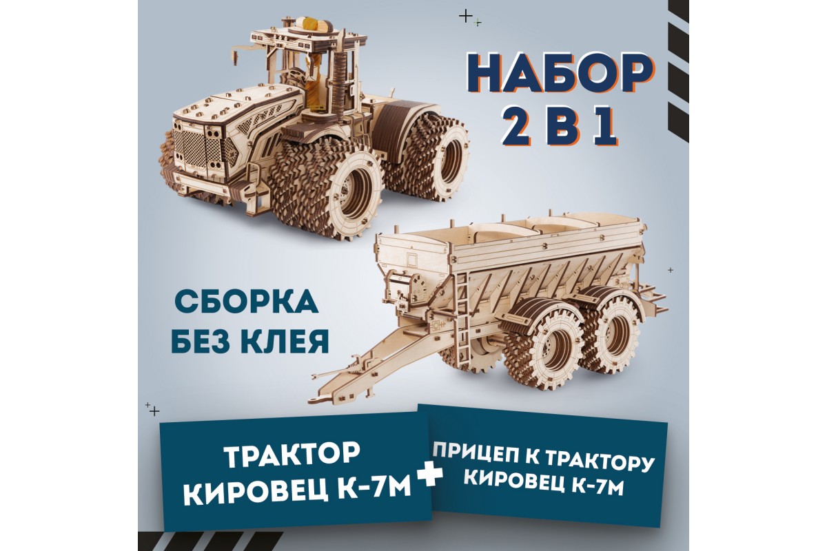 Набор конструкторов 2 в 1. Механическая сборная модель Трактор КИРОВЕЦ К-7М с мотором и Прицеп к трактору от бренда EWA Eco-Wood-Art - выгодный и отличный подарок как для ребенка, так и для взрослого человека, который увлекается конструированием и моделированием.
