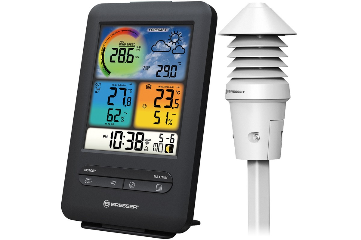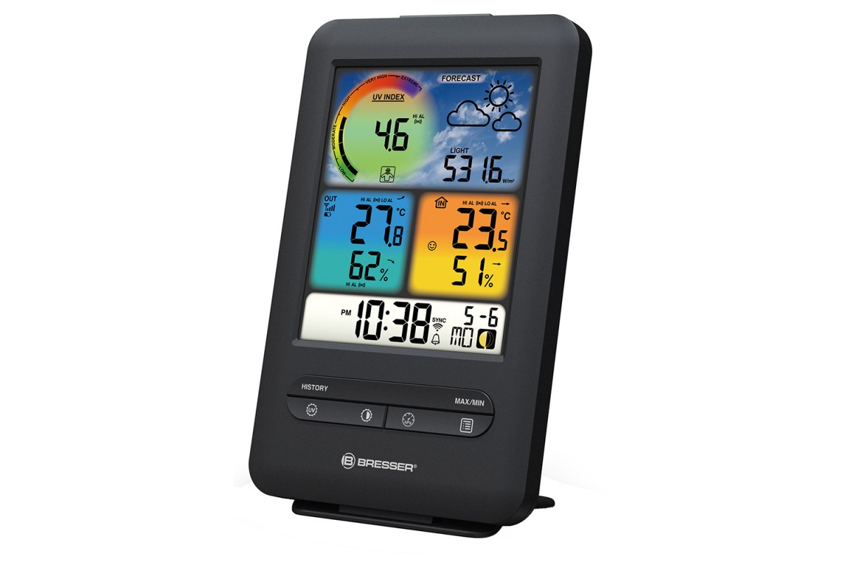 Метеостанция Bresser «4 в 1» Wi-Fi – многофункциональный метеоприбор с внешним датчиком «4 в 1». Она измеряет температуру и влажность воздуха в помещении и на улице, определяет атмосферное давление и УФ-индекс, составляет прогноз погоды на ближайшие 12–24 часа. Также с ее помощью можно узнать уровень освещенности, точку росы, тепловой индекс и фазу Луны. Вся информация представлена наглядно на контрастном и ярком ЖК-экране.