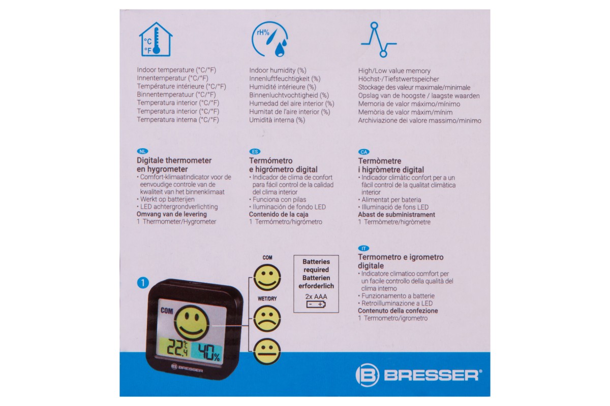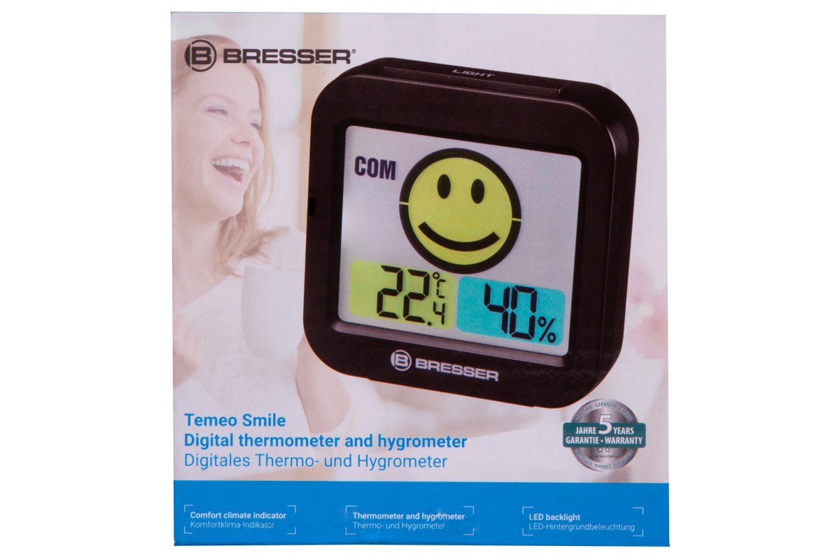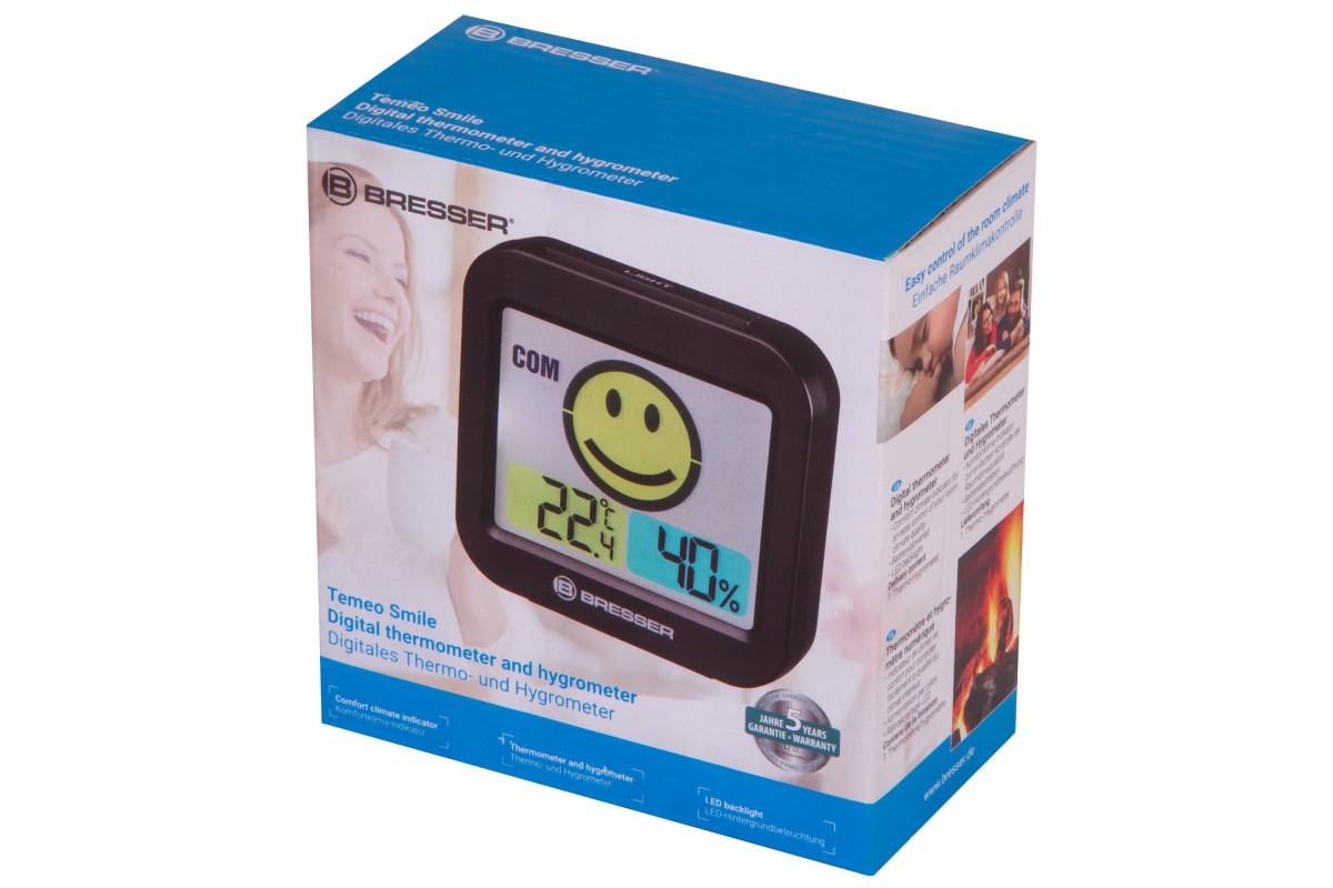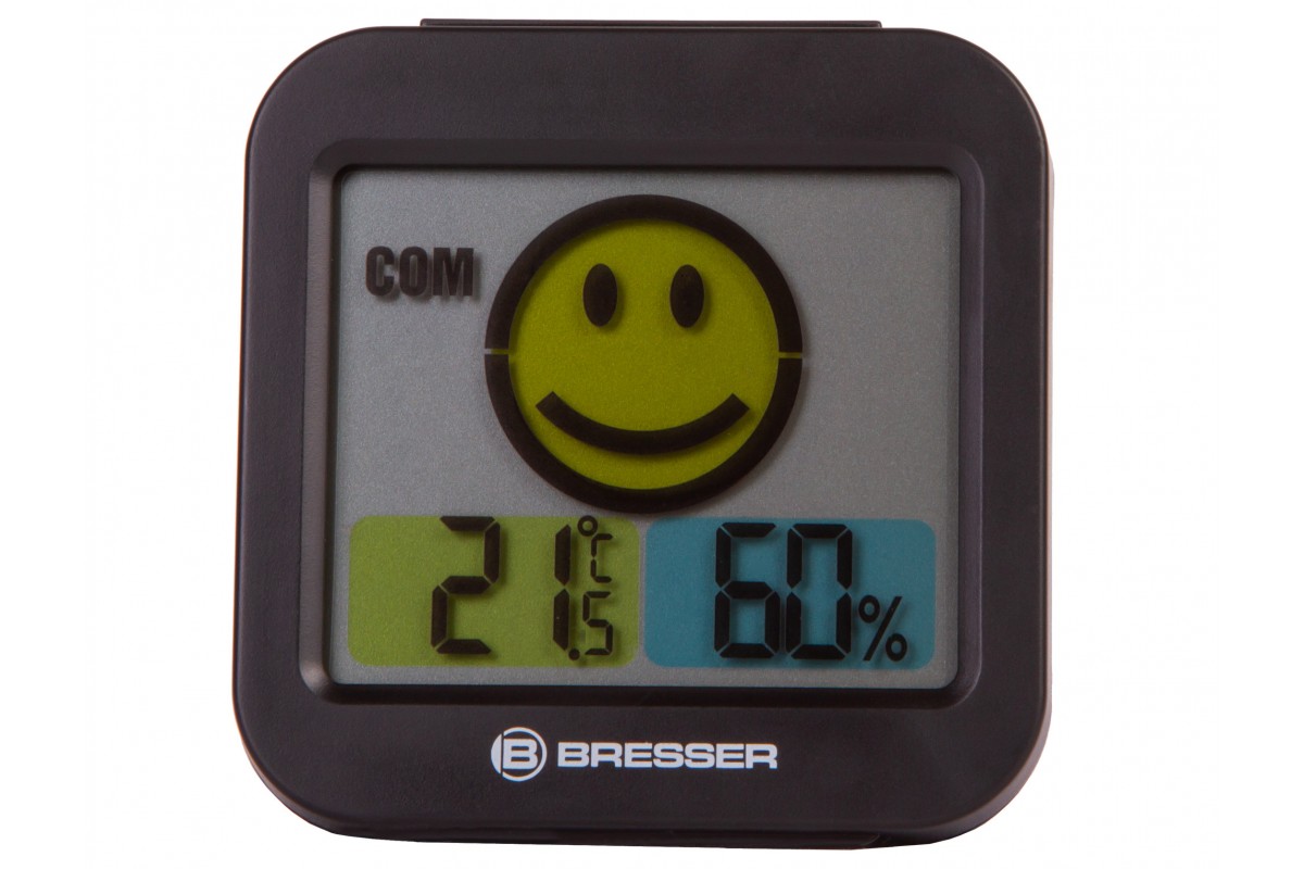 Компактная метеостанция Bresser MyTime Smile измеряет температуру и влажность воздуха и показывает, насколько комфортны условия в помещении. Смайлик на экране улыбается, если все хорошо, и становится несчастным, если воздух слишком влажный или, наоборот, сухой. Благодаря этому метеостанция помогает оберегать дом от возникновения плесени – она заранее предупреждает о неправильных метеоусловиях в комнате.