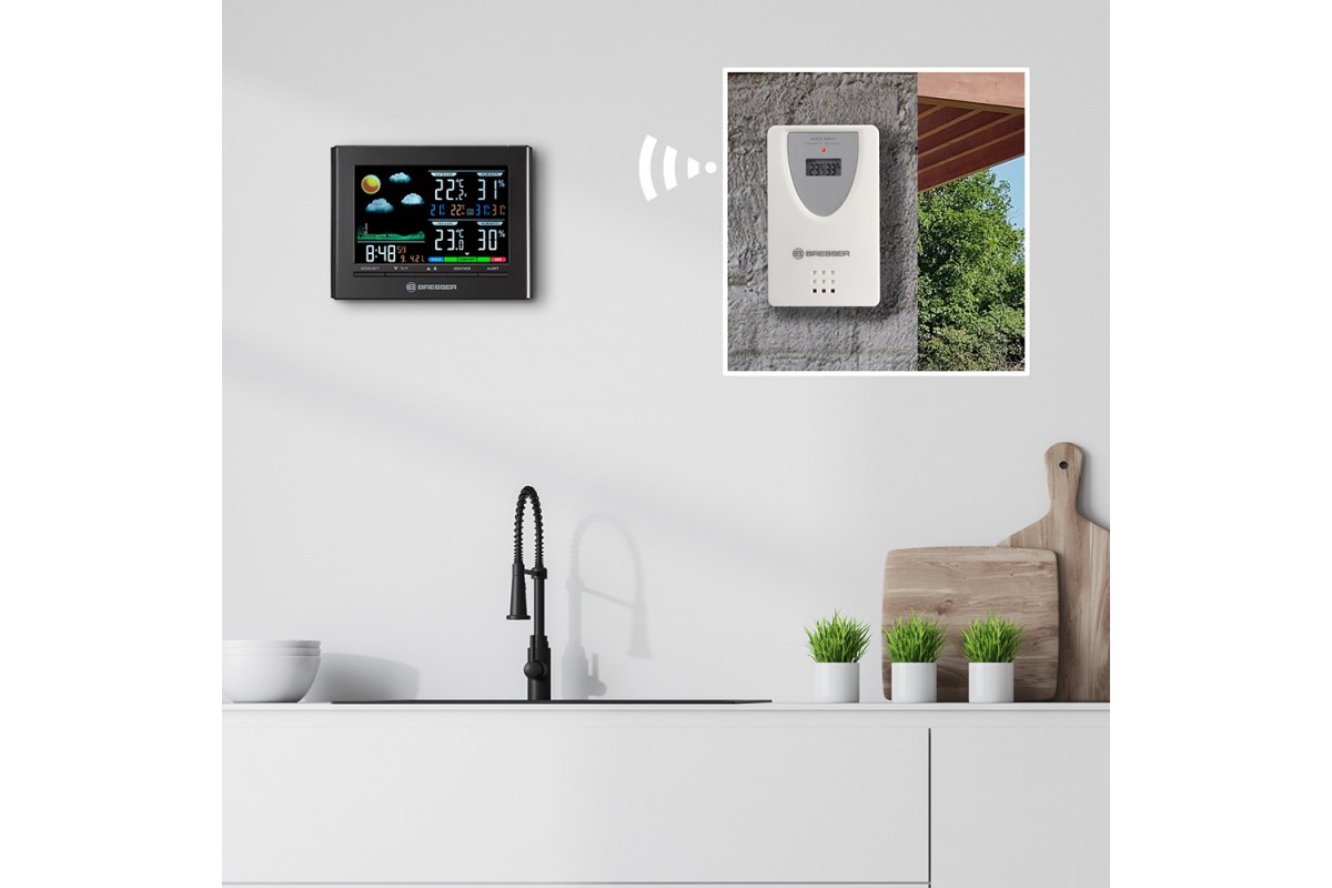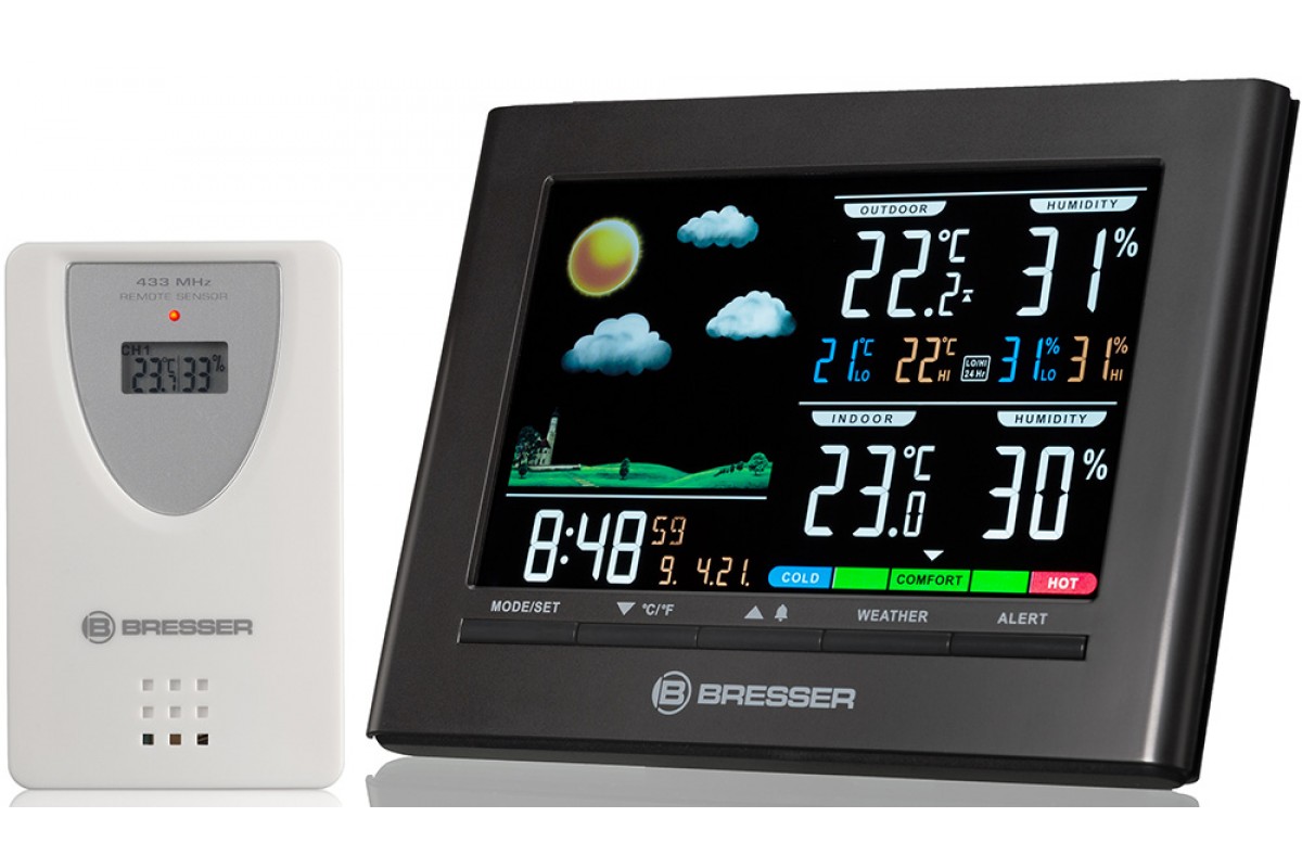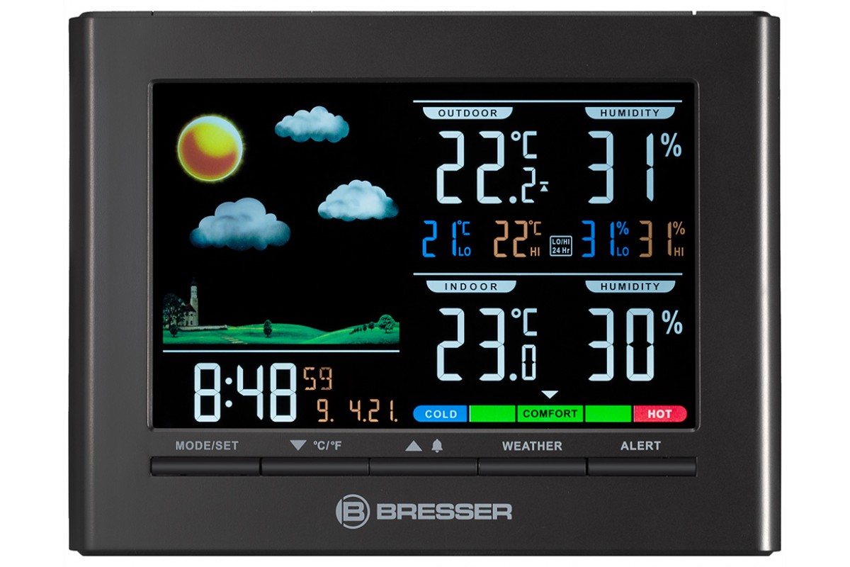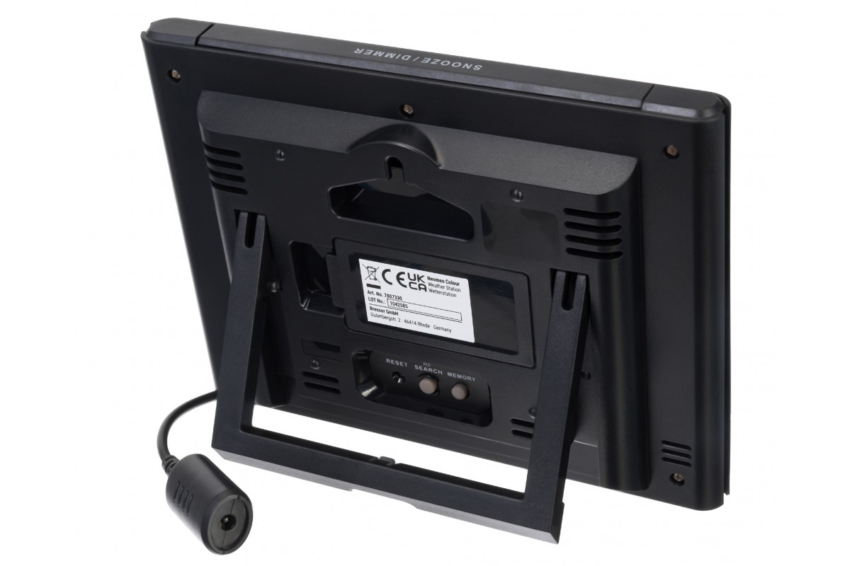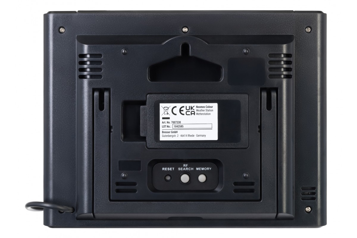 Метеостанция Bresser Neomeo с цветным дисплеем – это прекрасный подарок человеку, которому важна не только функциональность, но и внешний вид гаджета. Строгая и лаконичная, она прекрасно впишется в интерьер офиса, городской квартиры или загородного дома, оформленного в современном стиле. Метеостанцию можно устанавливать на откидную подставку или вешать на стену.