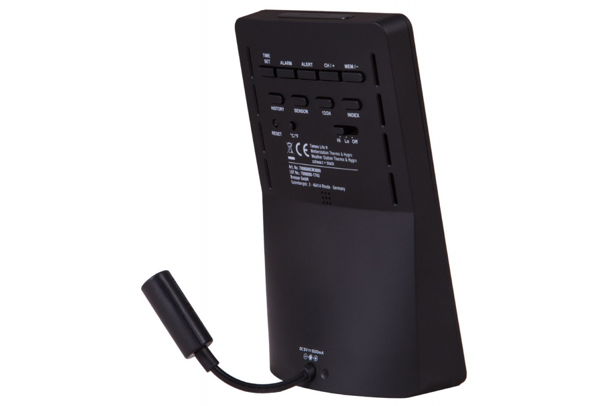 - Технические характеристики|Подсветка: есть|Диапазон рабочих температур наружного датчика: от –20 °C до +60 °C|Цвет корпуса: черный|Диапазон измерения: от 1% до 99%|Место использования: внутри помещения