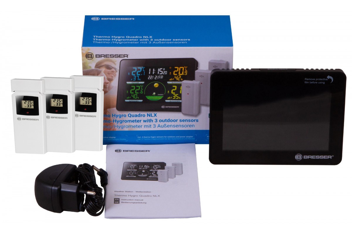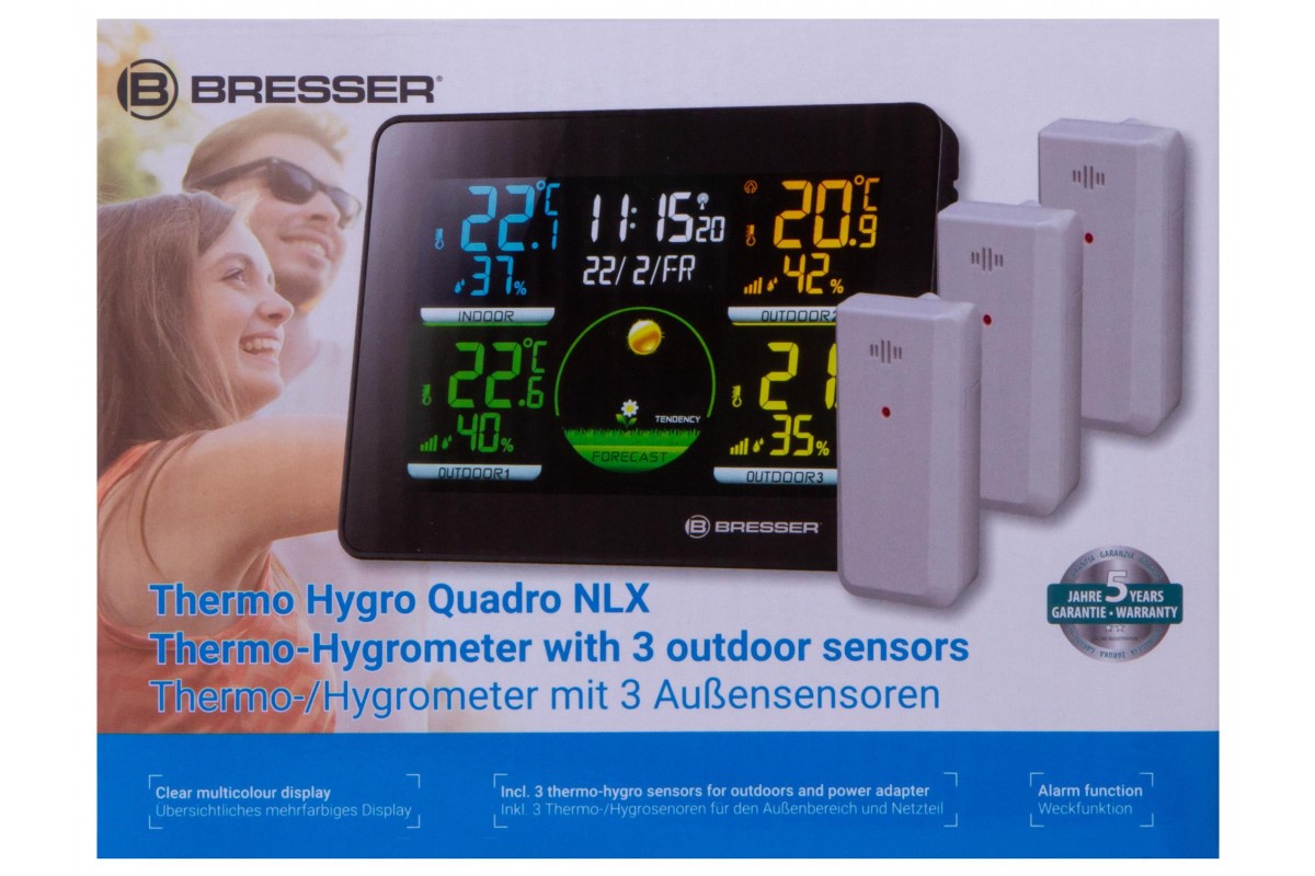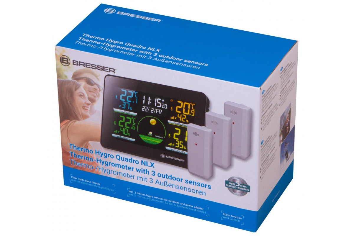 Метеостанция Bresser Thermo Hygro Quadro NLX позволяет проводить измерения температуры и влажности воздуха в четырех местах одновременно. В комплекте с ней идут три радиодатчика, которые передают данные на расстояние до 30 метров. Благодаря этому с помощью метеостанции можно проводить мониторинг микроклимата в загородных домах, просторных квартирах и производственных помещениях. Возможности этого прибора особенно пригодятся, если в помещении высока вероятность появления плесени.