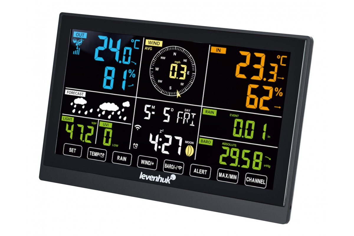 Погодная станция Levenhuk Wezzer PLUS LP140 разработана для использования в квартире, на даче или на производстве, которое зависит от метеоусловий. Станция состоит из 2 устройств: основного модуля с цветным ЖК-дисплеем и внешнего датчика для замеров атмосферного давления, влажности, температуры, скорости и направления ветра, уровня осадков и их интенсивности. На дисплее отображаются измеренные значения, минимумы и максимумы, выводятся предупреждения о превышении комфортных показателей. Для некоторых параметров есть выбор единиц измерения. Можно настроить запись истории показаний за день, час, месяц, год.