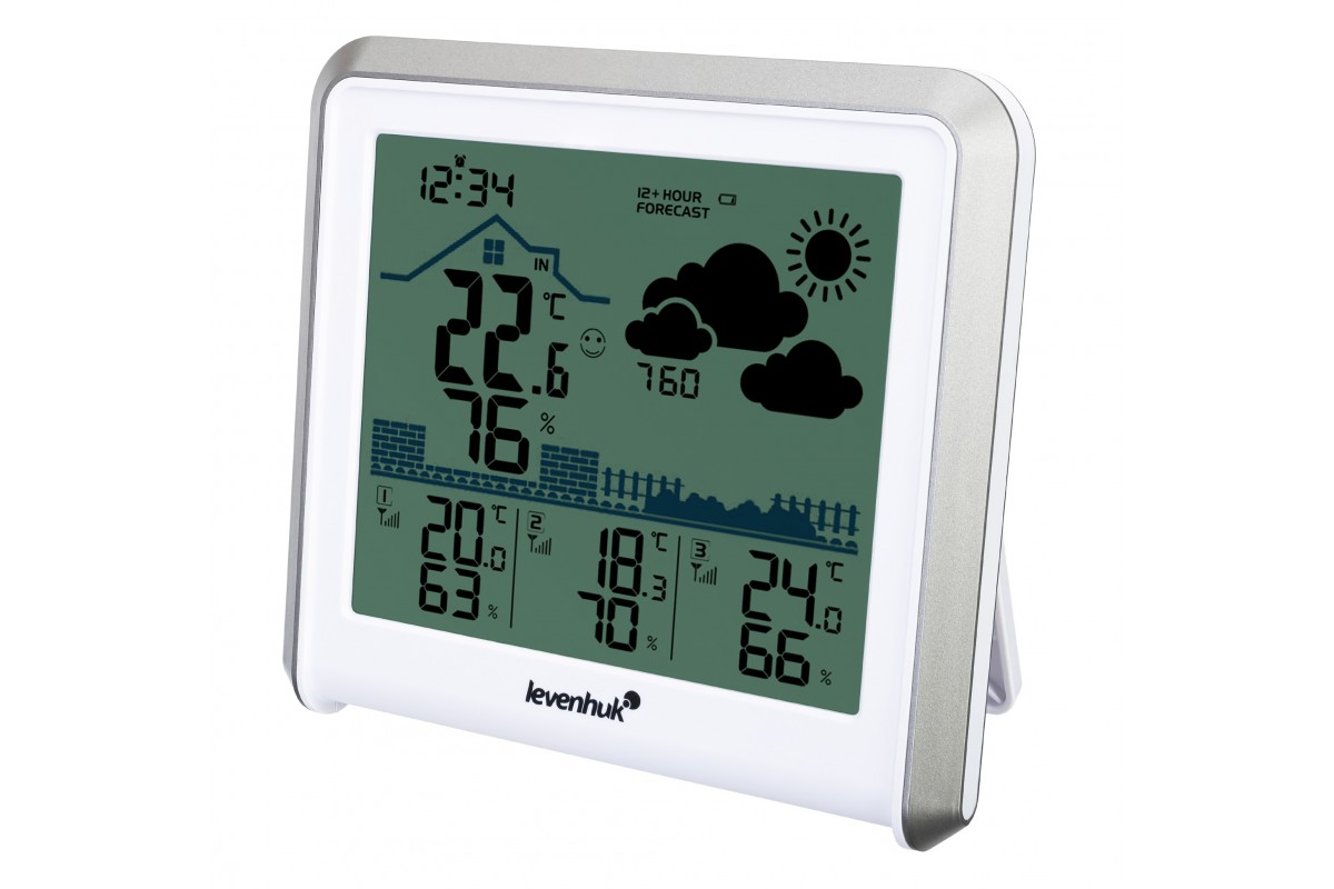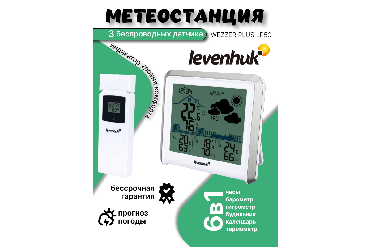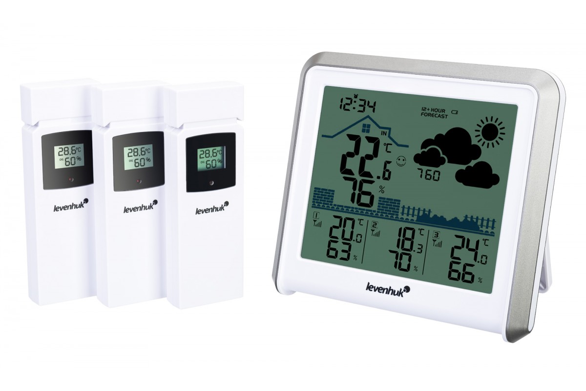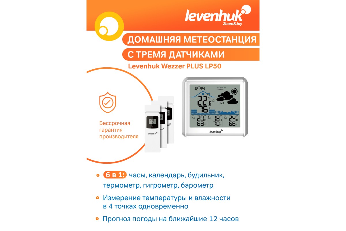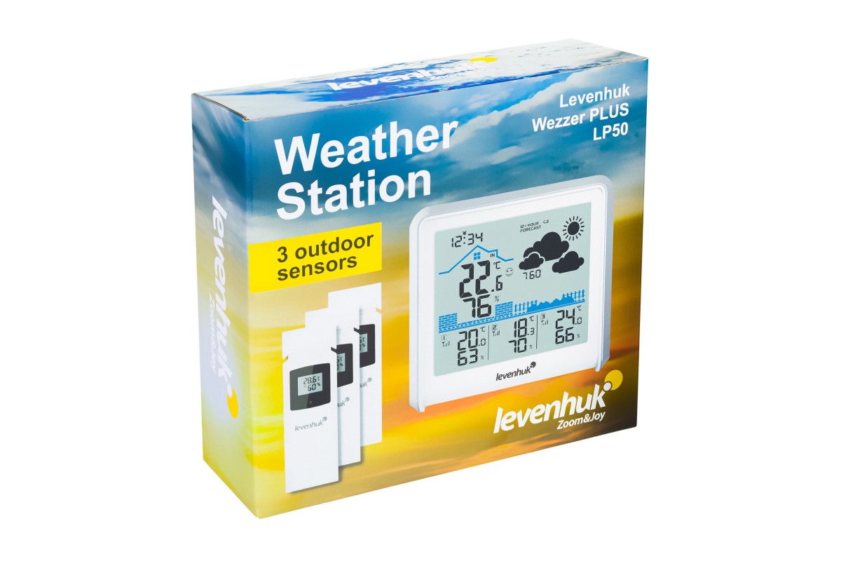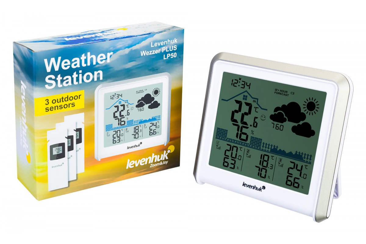 Погодная станция Levenhuk Wezzer PLUS LP50 проводит измерения ключевых метеопараметров в четырех местах одновременно. Вместе с основным блоком поставляются три беспроводных термогигродатчика. Их можно разместить в разных помещениях и на улице на расстоянии до 100 метров от самой станции. Прибор отлично проявит себя в приусадебном хозяйстве, где нужно контролировать микроклимат в местах хранения урожая и хозяйственных постройках. Пригодится метеостанция и в большой квартире или общественном пространстве.