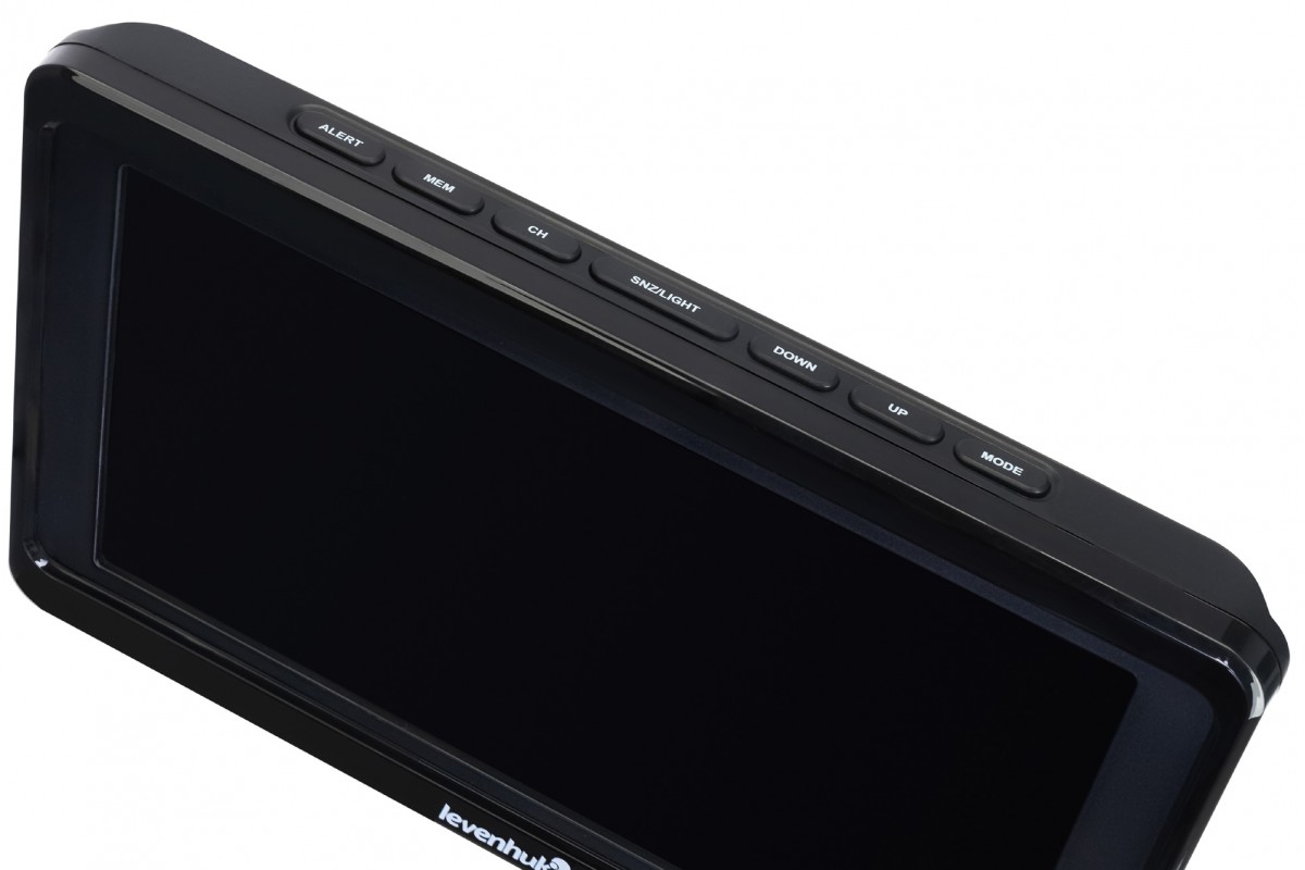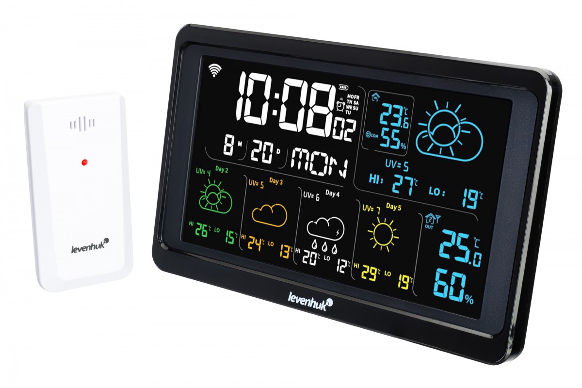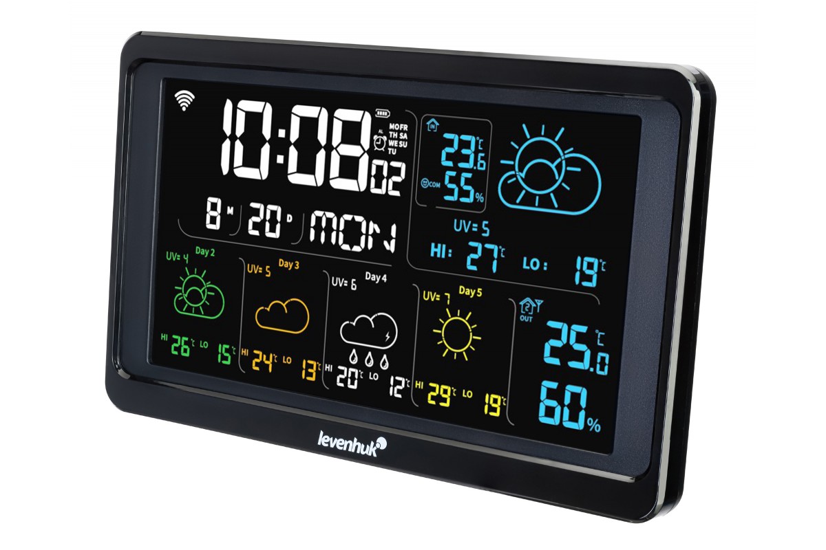 Ключевое преимущество Levenhuk Wezzer PLUS LP80 – прогноз погоды на 5 дней, который выводится на большой цветной ЖК-экран в виде блоков с пиктограммами. На экране также отображаются метеоданные, собранные основным блоком и датчиком, время, дата и день недели. Максимальные и минимальные значения температуры сохраняются в памяти прибора. Есть возможность устанавливать будильник и сигналы оповещения о некомфортной температуре на улице и дома. Удобно, что предельные значения пользователь может задать самостоятельно.