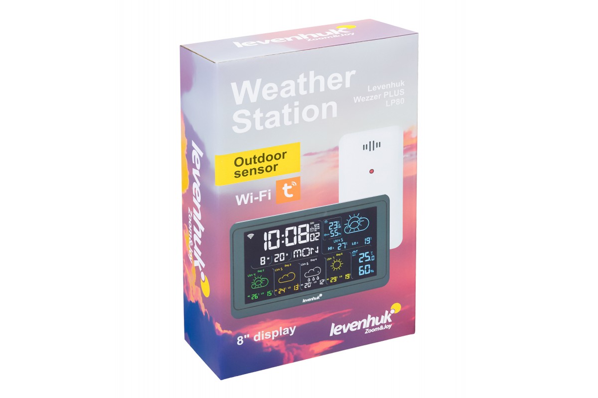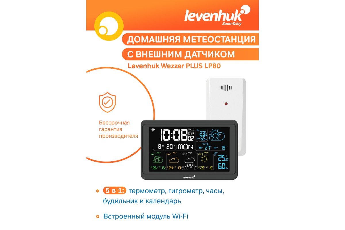 Метеостанция Levenhuk Wezzer PLUS LP80 – прибор, который поддерживает дистанционное управление с мобильных устройств по Wi-Fi и Bluetooth. В комплекте с погодной станцией поставляется беспроводной внешний датчик, что позволяет следить за изменениями как микроклимата в помещении, так и погоды на улице. Основной блок можно разместить на прикроватной тумбочке или подоконнике, датчик – повесить на стену. Расстояние между устройствами может достигать 100 метров.