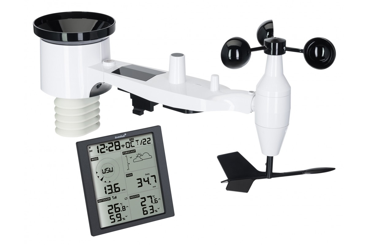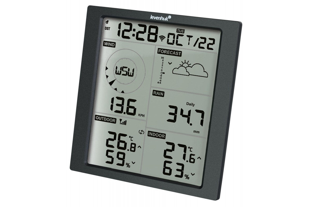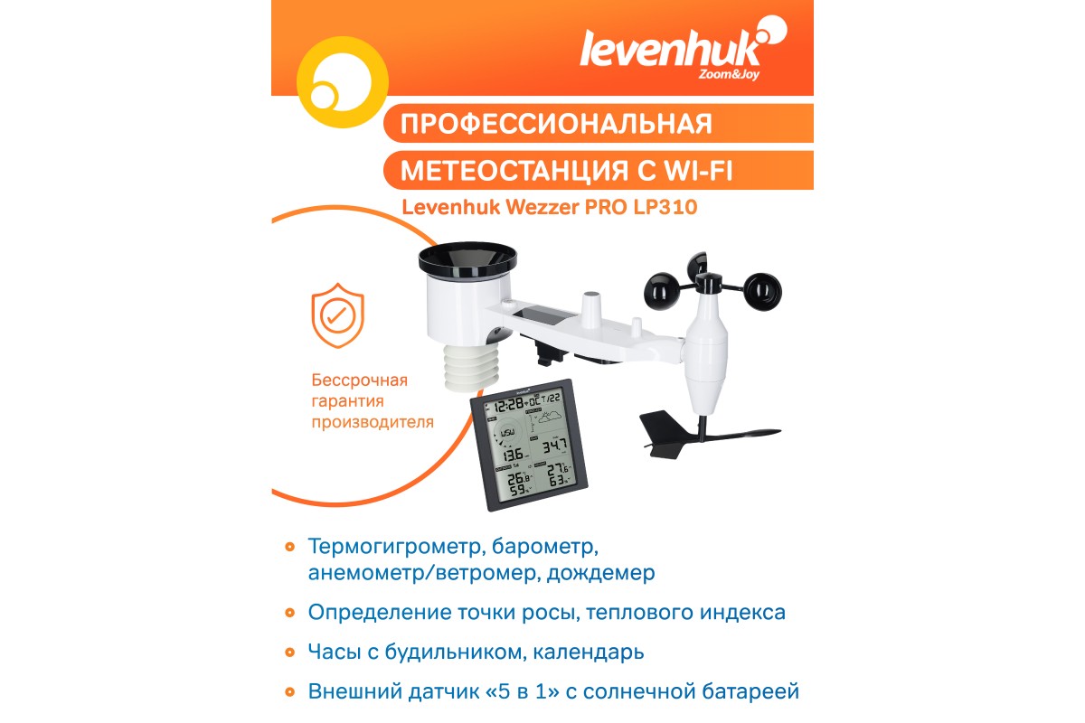Метеостанция Levenhuk Wezzer PRO LP310 – это прибор профессионального уровня, который позволит с высокой точностью наблюдать и фиксировать погодные данные, а также температуру и уровень влажности в помещении. Он измеряет атмосферное давление, силу и скорость ветра, уровень выпавших осадков, информирует о точке росы и тепловом индексе. Кроме этого станция запоминает абсолютные минимумы и максимумы показаний и оповещает о высоких и низких показателях относительно референсов, установленных пользователем.