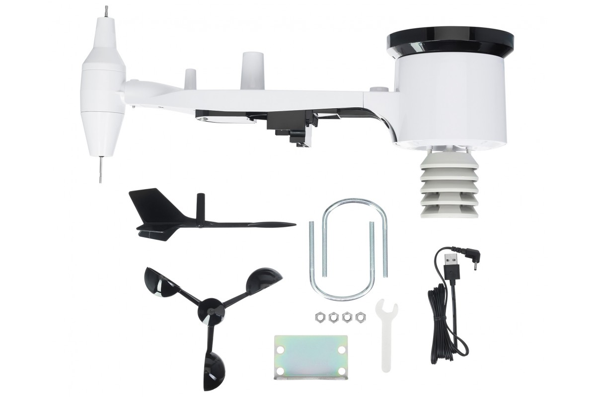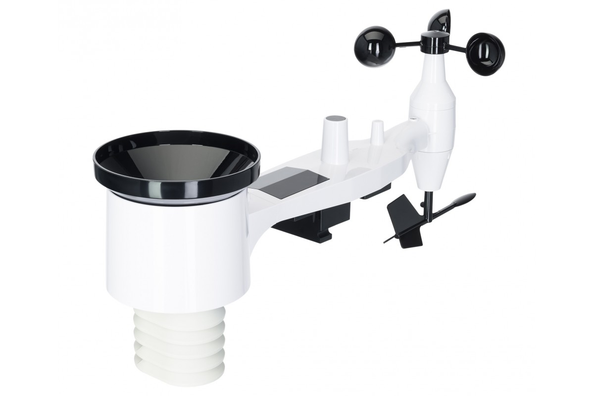 Для уличных замеров используется выносной радиодатчик «5 в 1». Он способен работать на расстоянии до 100 метров от станции (в прямой видимости, оптимальная дистанция – до 50 метров). Датчик работает от батареек и оснащен солнечной панелью. Солнечная батарея используется только для питания, не заряжает элементы питания (аккумуляторы). Станция поддерживает подключение до 8 датчиков одновременно. База станции может как питаться от батареек, так и работать от сети (элементы питания в комплект не входят).