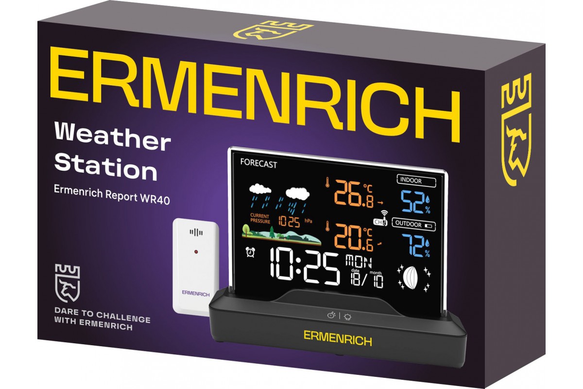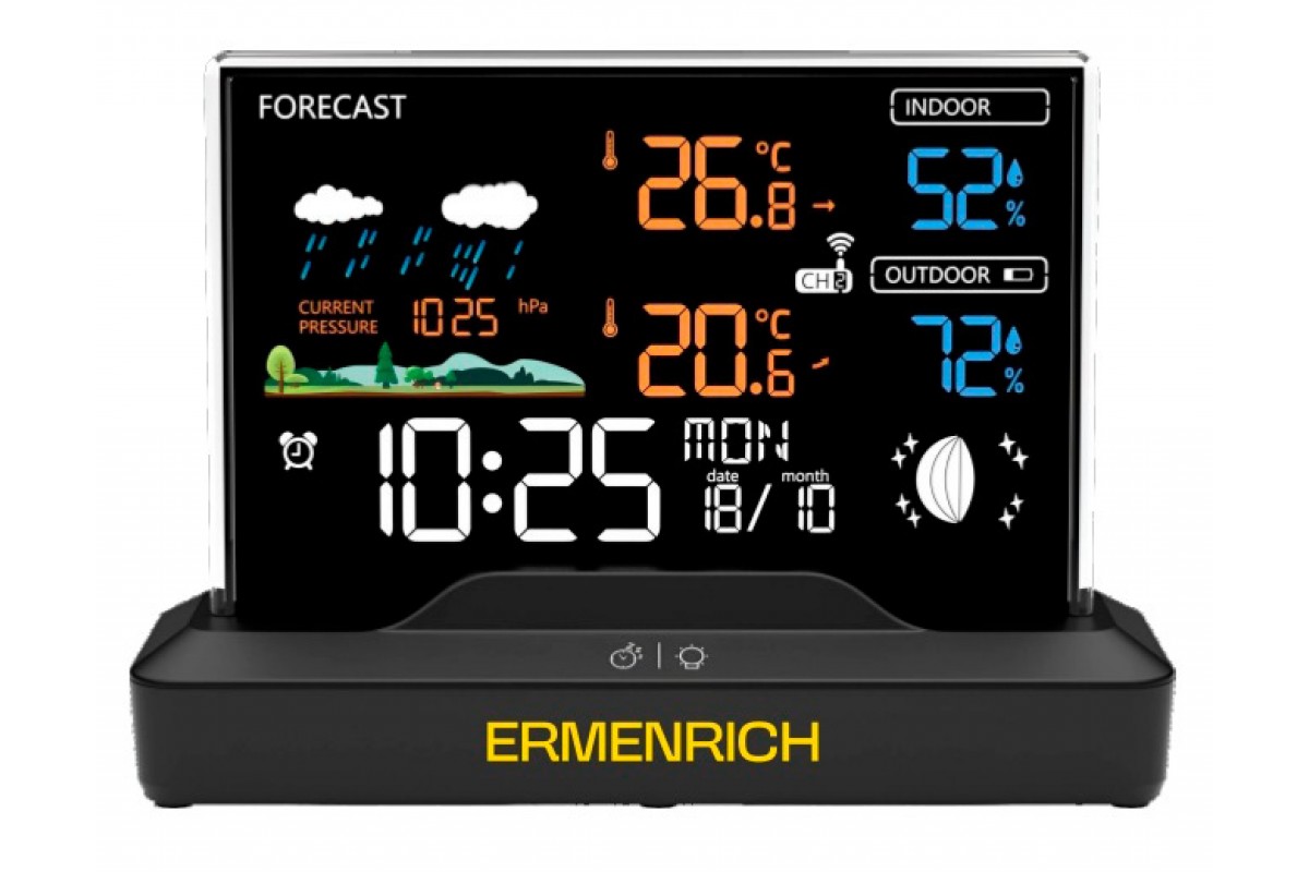 Метеостанция от бренда Ermenrich модели Report WR40 – это домашний прибор, предназначенный для использования всей семьей, когда необходимо узнать текущую погоду, уровень влажности воздуха, время или день недели. Он оснащен ярким цветным экраном, работающим на основе жидкокристаллической VA-матрицы с высокой контрастностью, на котором отображается информация о всех наиболее важных показателях окружающей среды: температуре и влажности на улице и дома, текущем атмосферном давлении, прогнозе погоды и даже фазе Луны. Метеостанцию можно поставить на прикроватную тумбу и использовать в качестве будильника – встроенные часы имеют и эту функцию.