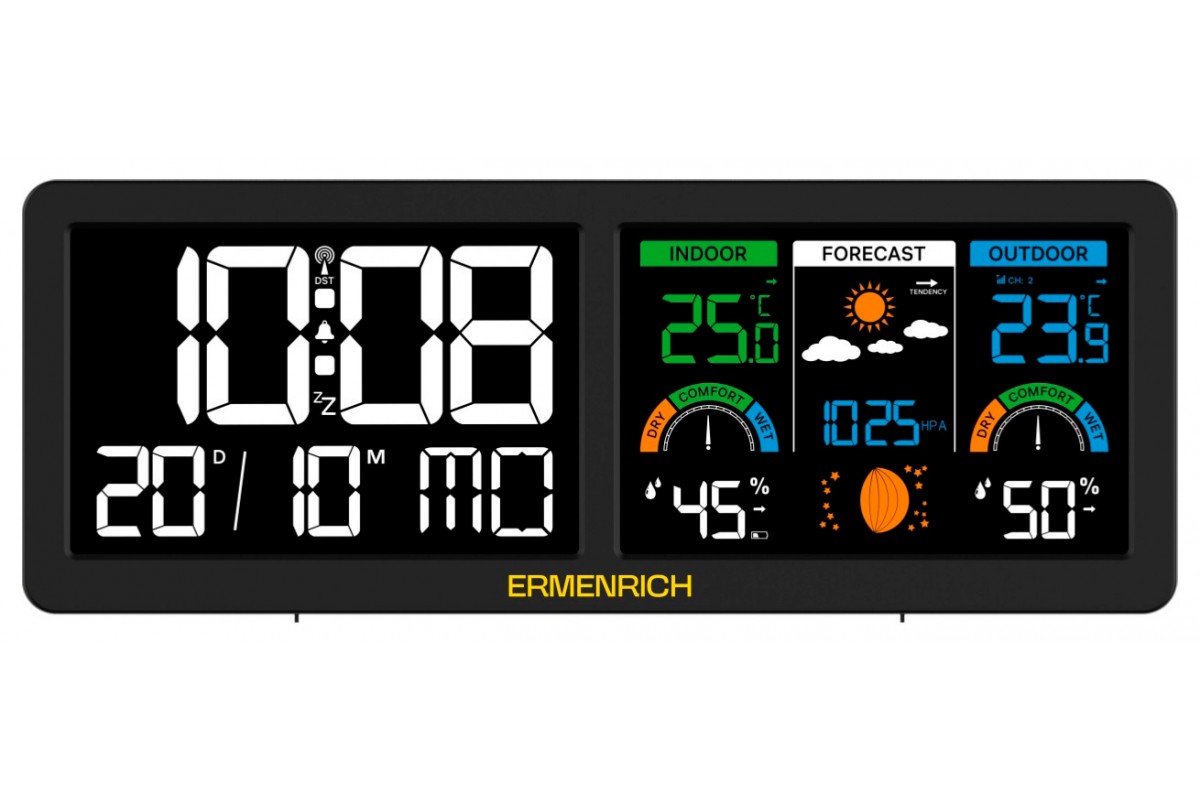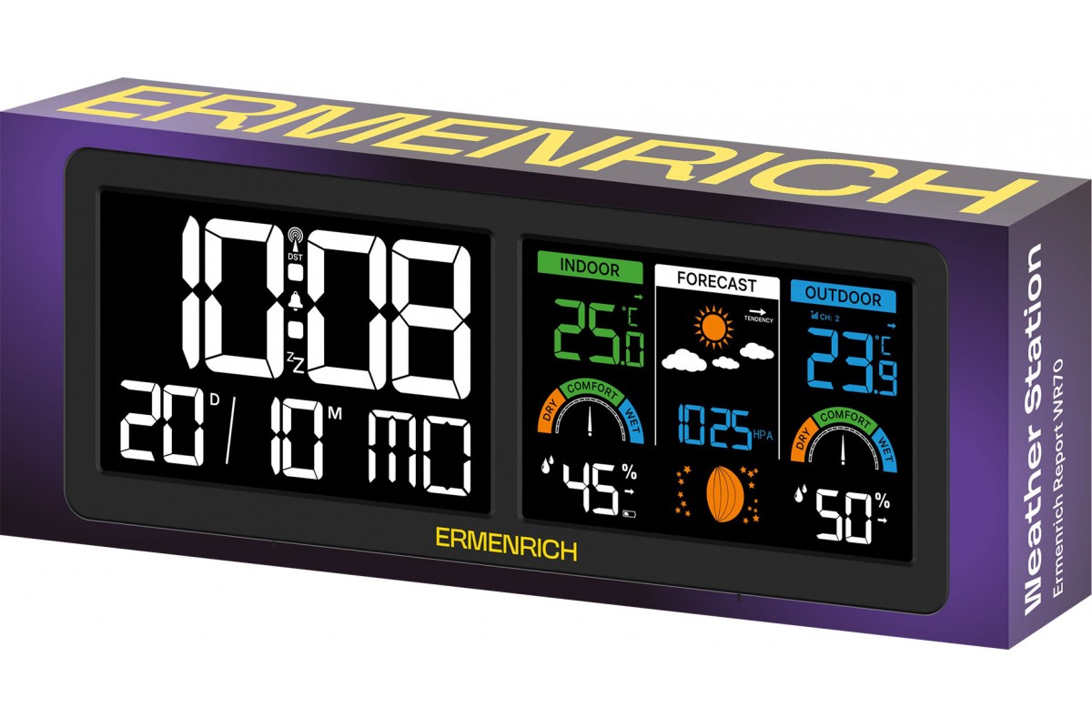 Домашняя метеостанция Ermenrich Report WR70 с двумя яркими экранами – это современное устройство, которое пригодится в любом городском жилище, загородном доме и даже офисе. Его можно поставить на обеденный стол, прикроватную тумбу или повесить на стену, чтобы всегда иметь доступ к актуальной информации о состоянии погоды за окном и микроклимате дома. Два цветных экрана с подсветкой легко читаются, крупный шрифт можно разобрать даже издалека, а пиктограммы с фазой Луны и прогнозом погоды будут понятны любому пользователю с первого взгляда. Тонкий черный корпус без излишеств впишется как в скромный, так и в богатый интерьер, и будет выглядеть органично и аккуратно.