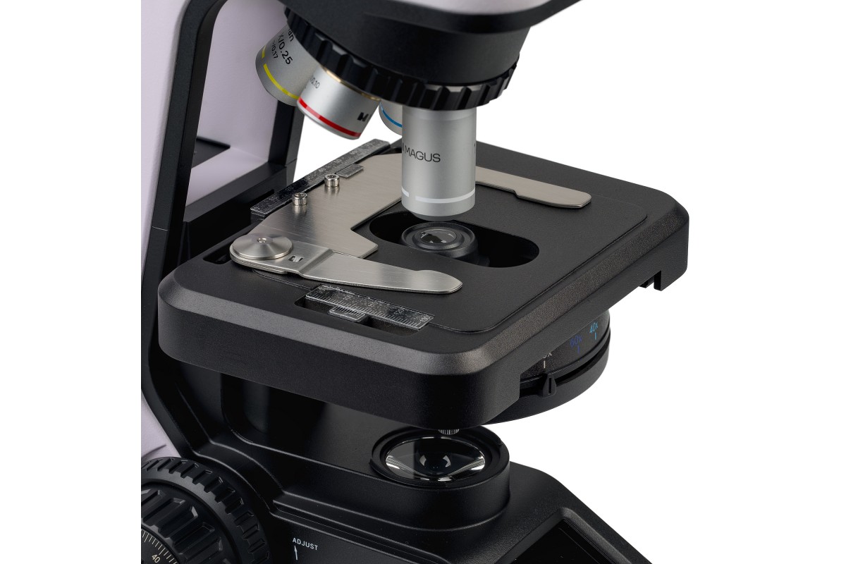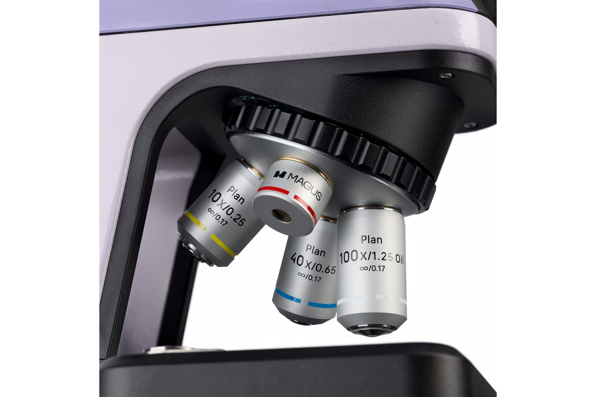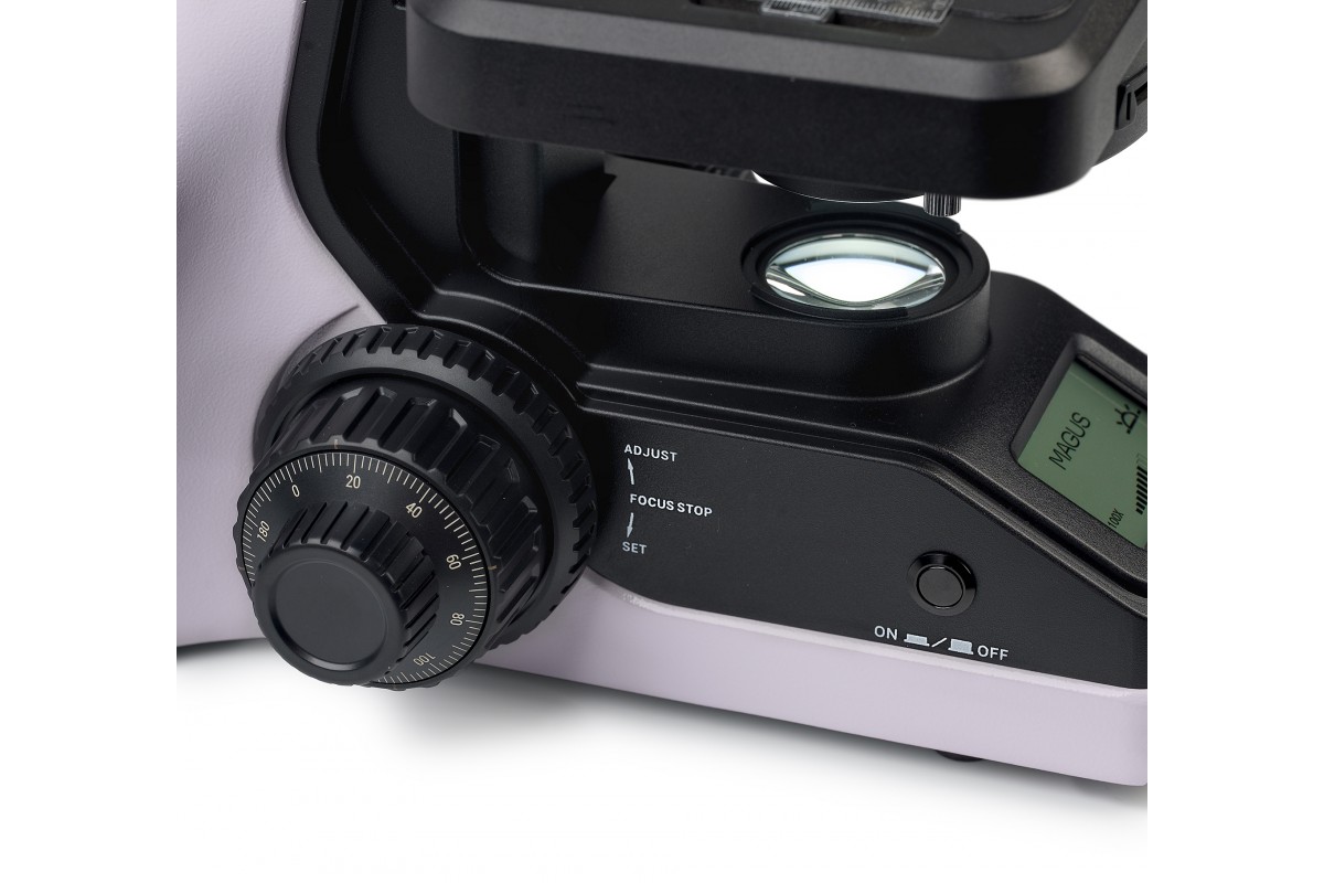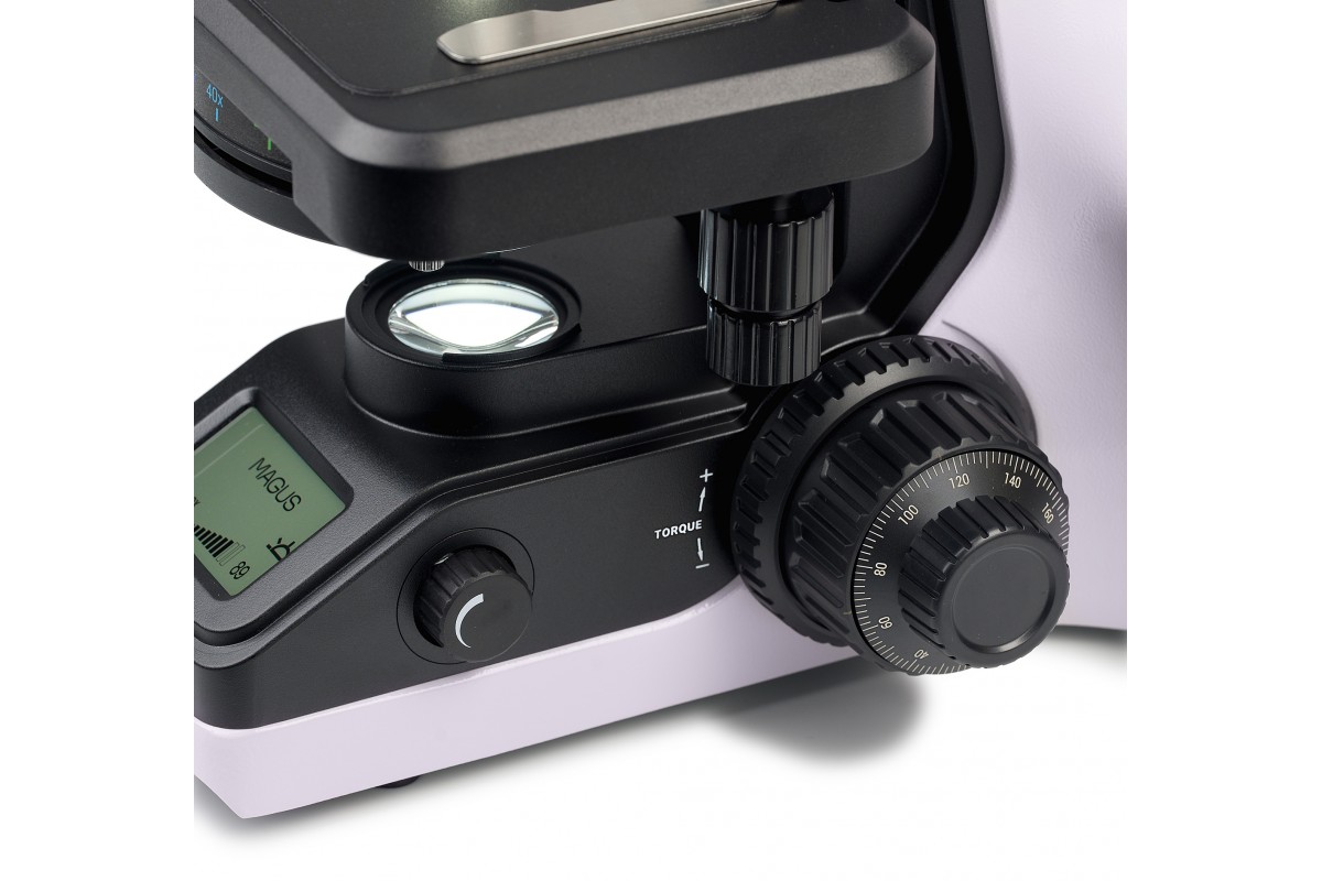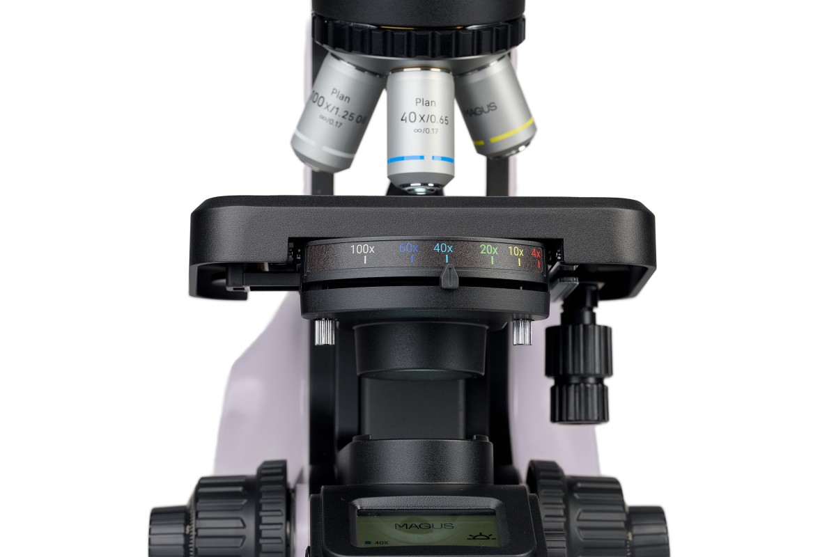 Револьвер рассчитан на установку 4 объективов. Система интеллектуального освещения регулирует яркость света в зависимости от рабочего объектива. Показатели светопропускания изменяются в соответствии с выбранным увеличением, и в окуляре стандартного микроскопа при смене объектива происходят перепады интенсивности света. Модель MAGUS Bio DH240 с системой «умного» освещения позволяет настроить параметры освещения под каждый объектив в револьвере, и затем при их смене освещение будет меняться автоматически. Пользователям не придется тратить время на подстройку, это особенно ценно, когда в процессе работы приходится часто менять увеличение. Само револьверное устройство развернуто в направлении «от пользователя». Такая конструкция создает большое свободное пространство для работы с микроскопом и манипуляций с препаратом.