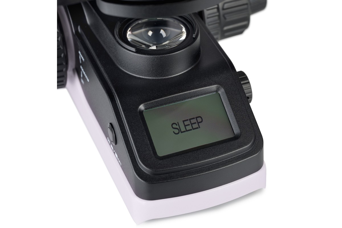 Еще одно важное добавление к конструкции микроскопа – ЖК-экран. На нем можно отслеживать выбранные параметры освещения (яркость и цветовую температуру), увеличение объектива, режим работы (спящий или эко), а также выставить таймер на автоотключение устройства.