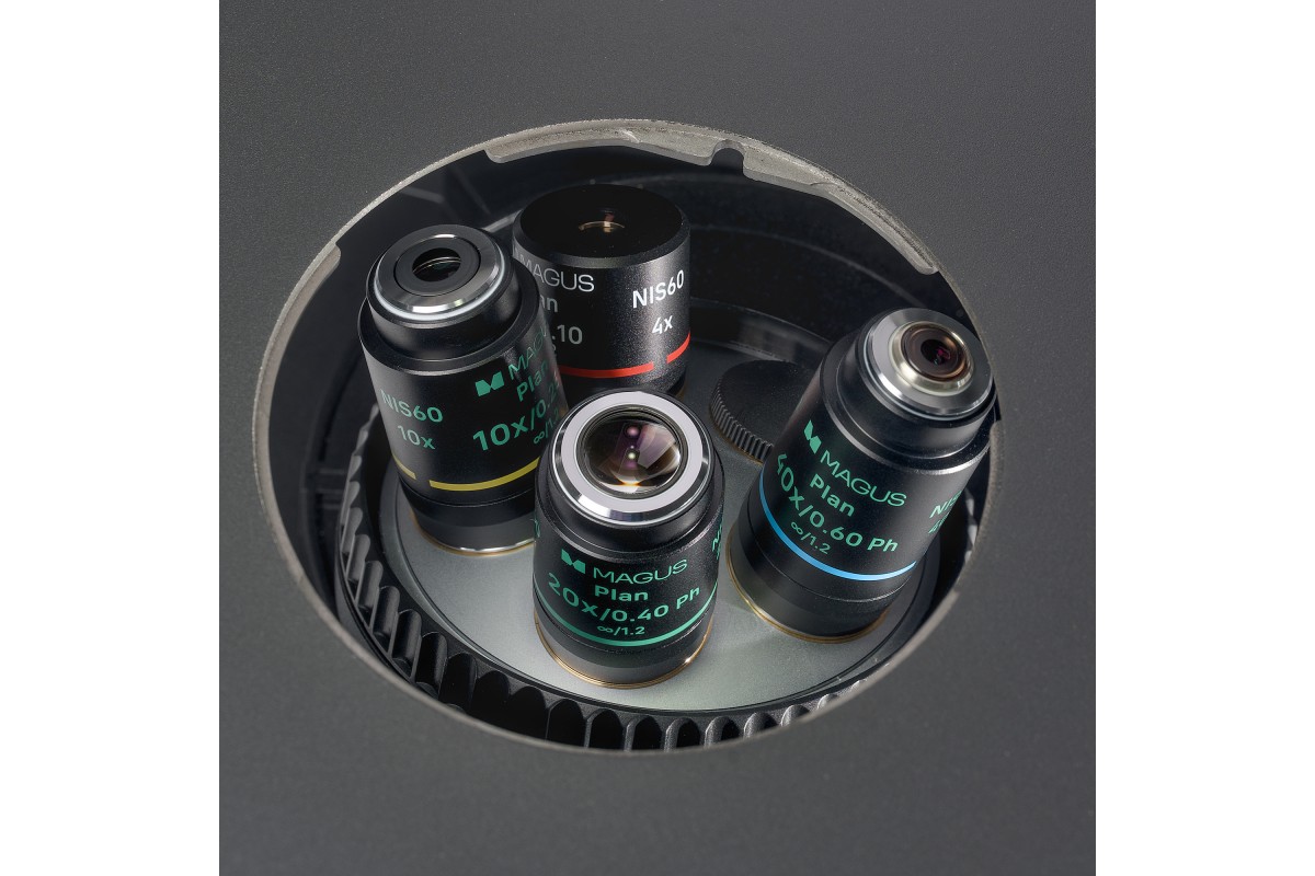 • Объектив-планахромат, рассчитанный на бесконечность: 20х/0,40 фазовый WD 12 мм, парфокальная высота 60 мм