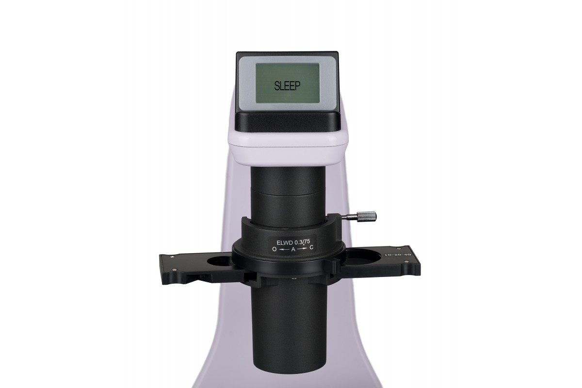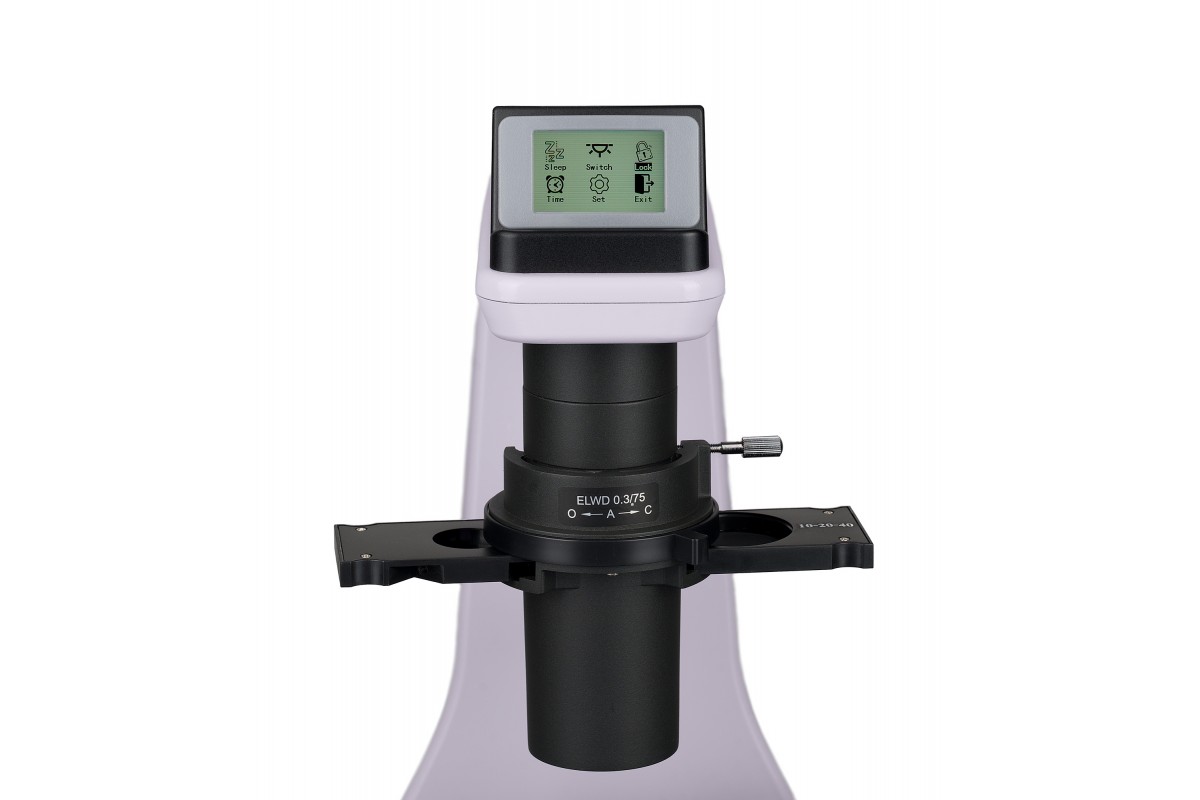 ЖК-экран на основании микроскопа отображает увеличение объектива, яркость источника света, режим работы («сон», «эко»).
