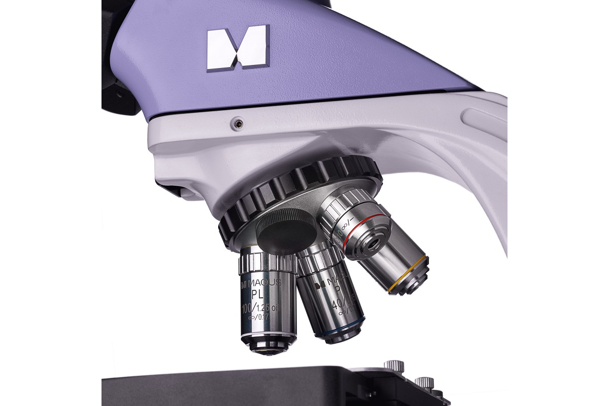 5-гнездное револьверное устройство вмещает не только комплектные объективы, но и один дополнительный. Благодаря тому, что револьвер находится в положении «от наблюдателя», хорошо виден используемый объектив, а пространство над столиком свободно. Все входящие в комплект объективы являются планахроматами, что позволяет получать четкое и контрастное изображение с минимумом искажений. Диапазон увеличения оптики: от 40 до 1000 крат, верхний предел можно повысить, если оснастить микроскоп дополнительными окулярами.