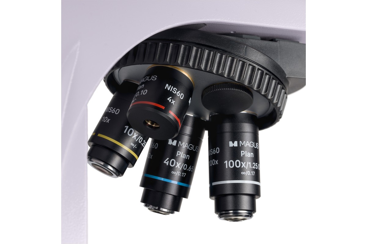 - Объективыпланахроматические, скорректированные на бесконечность: 4x/0,10; 10x/0,25; 40x/0,65; 100xs/1,25 ми (*опция: 20х/0,40); парфокальная высота 60 мм