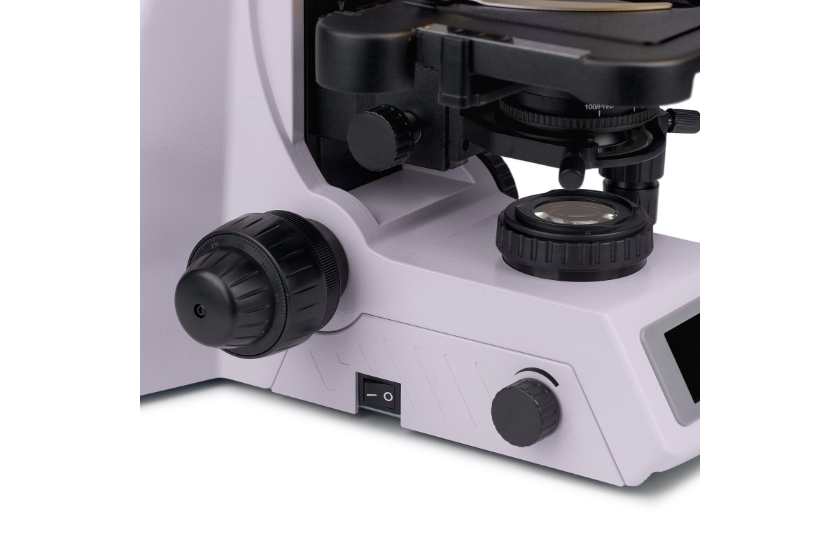 В микроскопе установлен осветитель проходящего света с трехваттным светодиодом. Яркость освещения регулируется, а система «умного» освещения переключает его интенсивность в зависимости от выбранного рабочего объектива. Каждый объектив пропускает разное количество света, и при смене рабочего объектива исследователь наблюдает в окуляре резкие изменения интенсивности освещения. Интеллектуальная система настройки света позволяет пользователю один раз установить интенсивность света для каждого положения револьвера (для каждого объектива) – и при их смене свет будет меняться автоматически. Цветовая температура при изменении яркости не меняется. На микроскопе можно настроить освещение по Кёлеру: с его помощью препарат подсвечивается равномерно, нет темных участков по краям поля зрения, а частички пыли или образ источника света не будут видны наблюдателю и не помешают в исследовании. Светодиод в осветителе рассчитан на 50 000 часов работы.