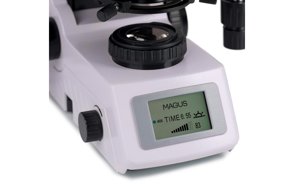 Проконтролировать все выбранные параметры работы можно на ЖК-экране у основания микроскопа: на нем отображаются кратность объектива, яркость, выбранный режим функционирования (есть режимы «сон», «эко») или запрограммированное время отключения.