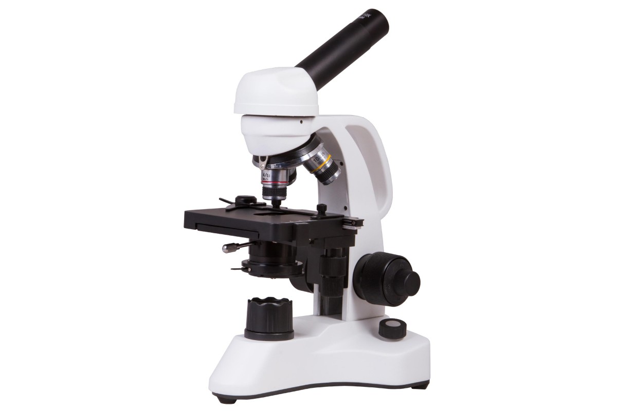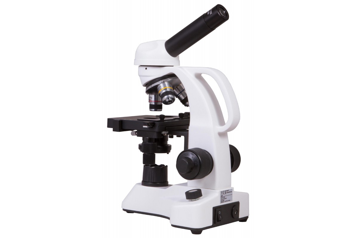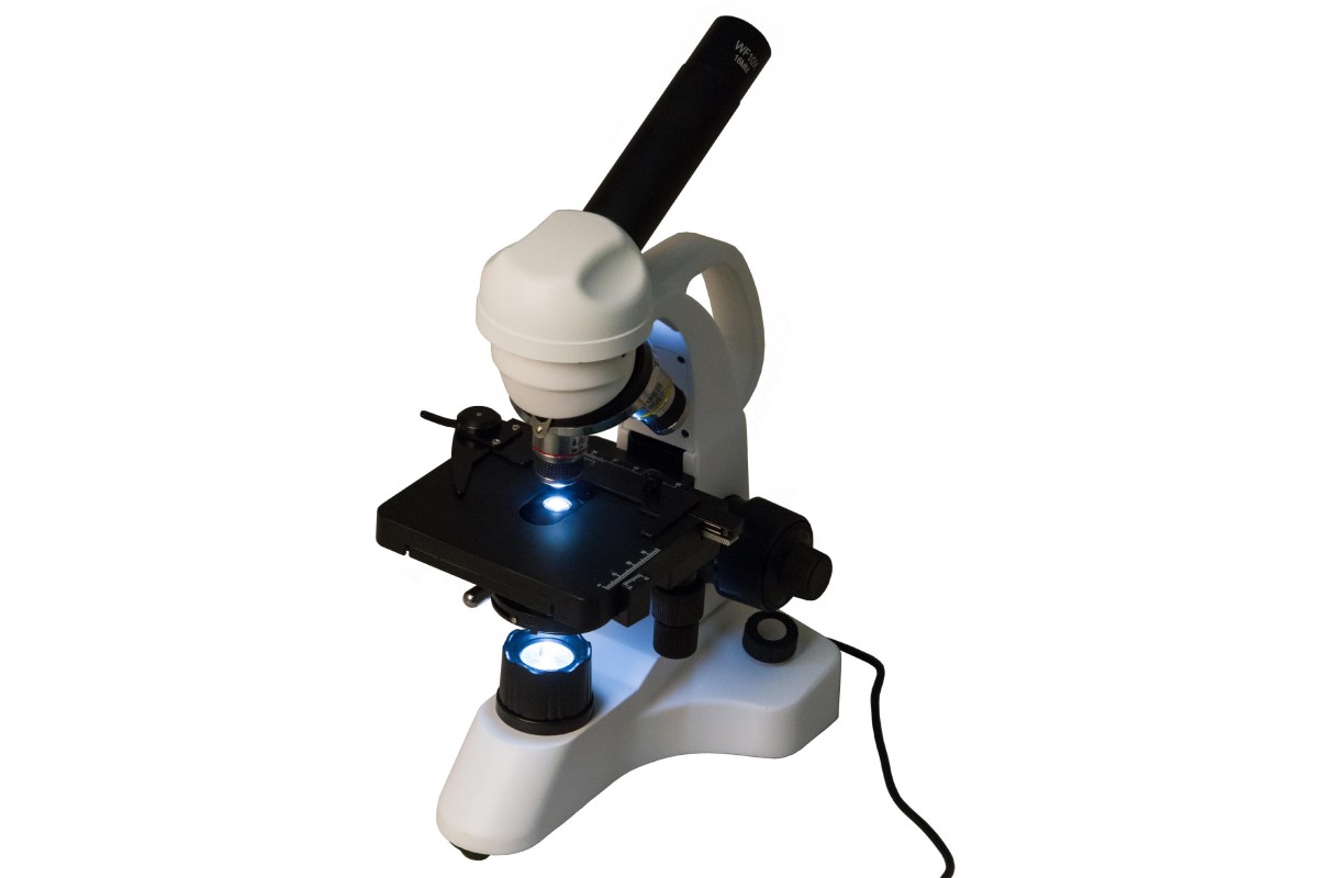 Монокулярная насадка позволяет проводить наблюдения одним глазом. Насадку можно вращать, поэтому модель удобно использовать при групповых исследованиях. В револьверное устройство установлено три ахроматических объектива, а общий диапазон увеличения оптики составляет от 40 до 400 крат. Микрообразцы фиксируются на предметном столике с препаратоводителем, прямо под которым расположены яркий светодиод и конденсор Аббе с ирисовой диафрагмой и держателем фильтра.