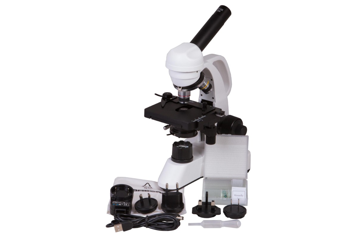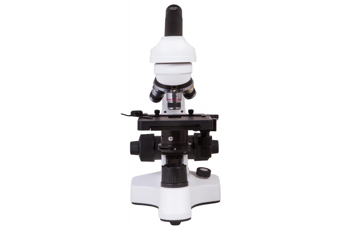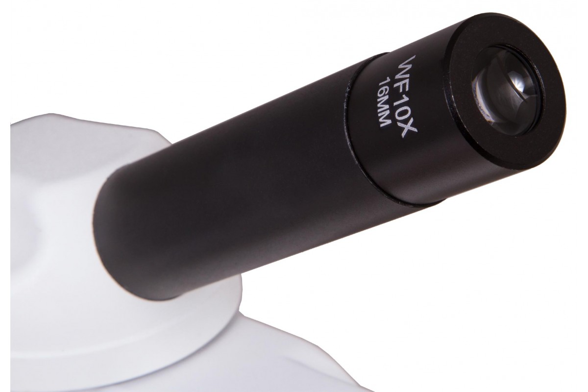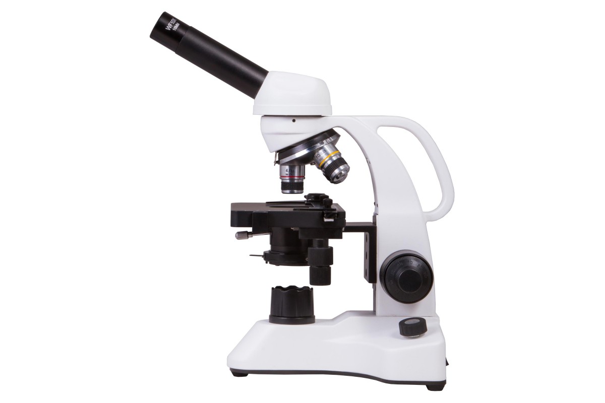 Монокулярная насадка позволяет проводить наблюдения одним глазом. Насадку можно вращать, поэтому модель удобно использовать при групповых исследованиях. В револьверное устройство установлено три ахроматических объектива, а общий диапазон увеличения оптики составляет от 40 до 400 крат. Микрообразцы фиксируются на предметном столике с препаратоводителем, прямо под которым расположены яркий светодиод и конденсор Аббе с ирисовой диафрагмой и держателем фильтра.