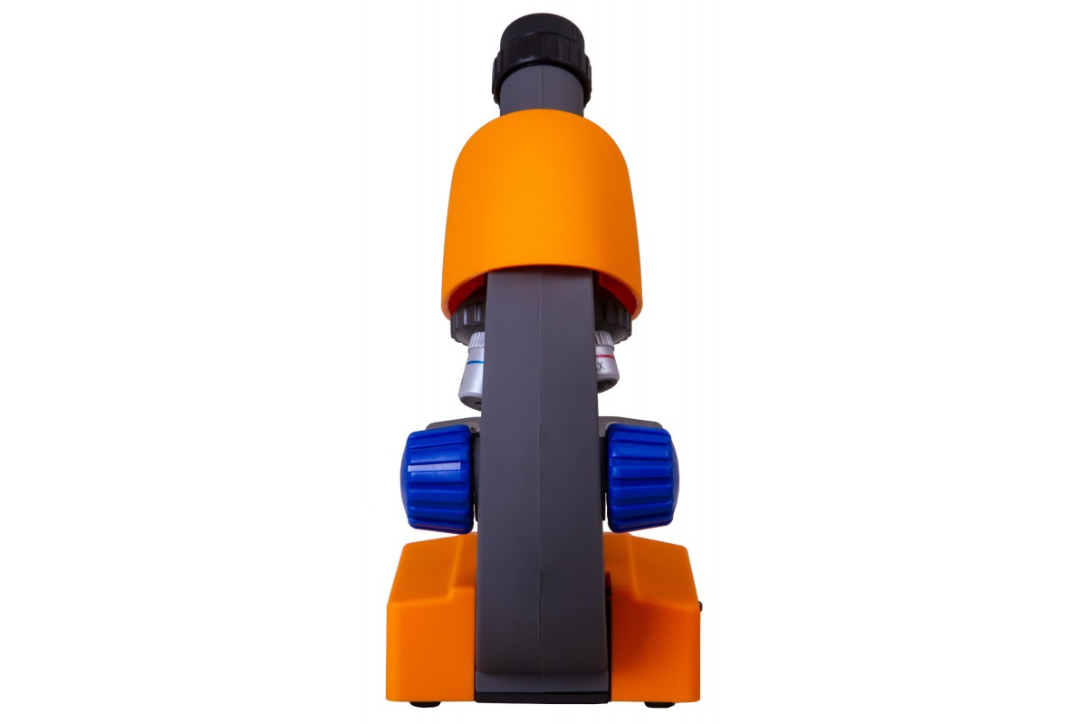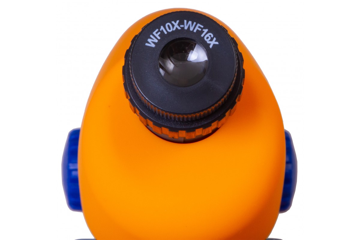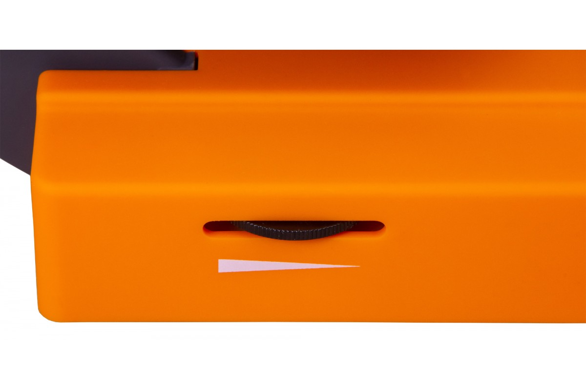 Для фиксирования микропрепаратов на предметном столике используются металлические зажимы. Источник освещения – светодиод, расположенный в нижней части микроскопа. Свет от него проходит через диск с диафрагмами, при помощи которого можно регулировать степень освещенности образца. Яркость подсветки тоже регулируется. Для работы подсветки используются батарейки (в комплекте).