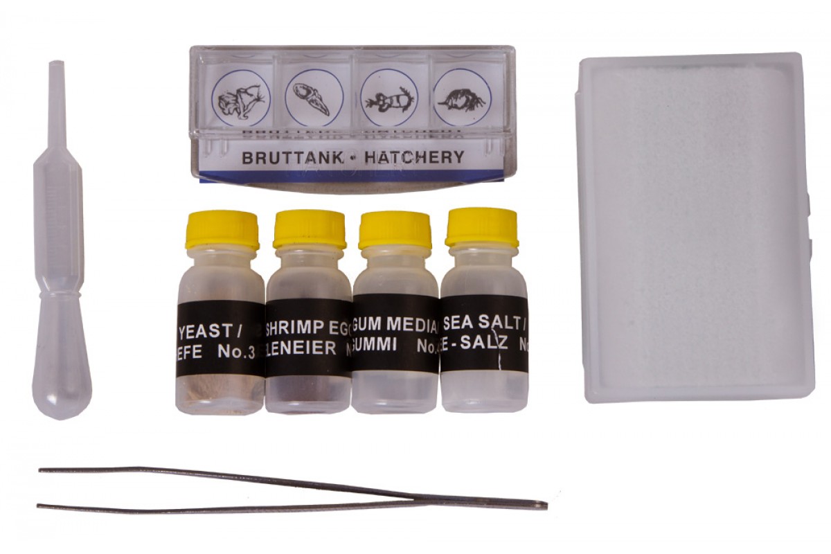 В комплект поставки входит большой набор для проведения опытов. Он включает инкубатор для разведения артемии, готовые микропрепараты, инструменты для работы с образцами и набор покровных и предметных стекол.