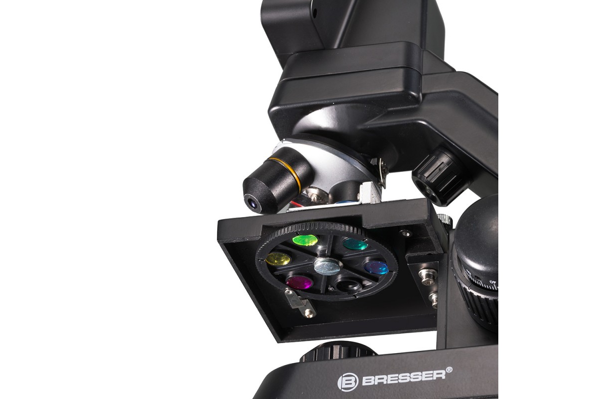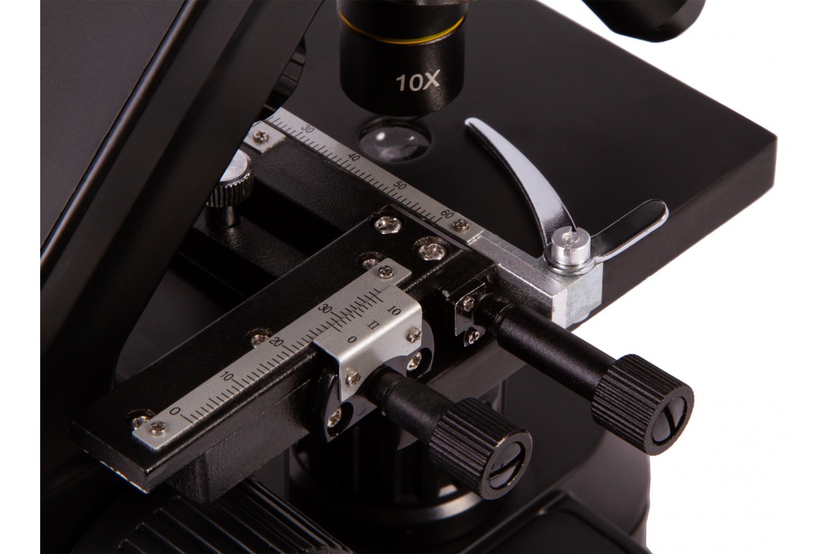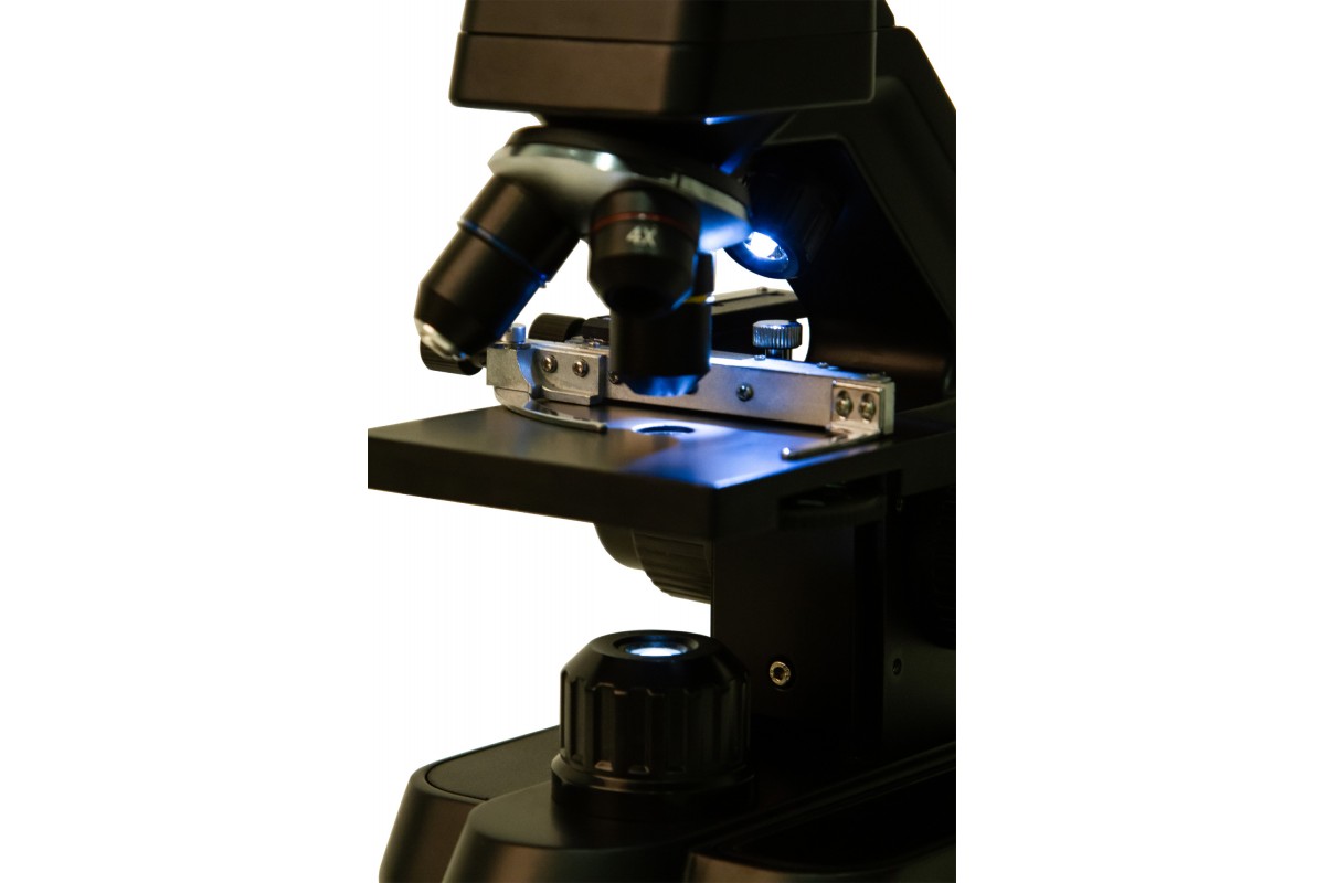 Оптическая часть микроскопа представлена тремя объективами разной кратности. Осветительная система – светодиоды по обеим сторонам предметного столика. Такое расположение подсветки позволяет изучать образцы любой степени прозрачности: бактерии, растительные и животные ткани, насекомых, крошечные организмы в капле воды и многое другое. Дополнительно в оптический путь включен диск с диафрагмами и светофильтрами. Чтобы настроить резкость, можно использовать грубую или точную фокусировку.