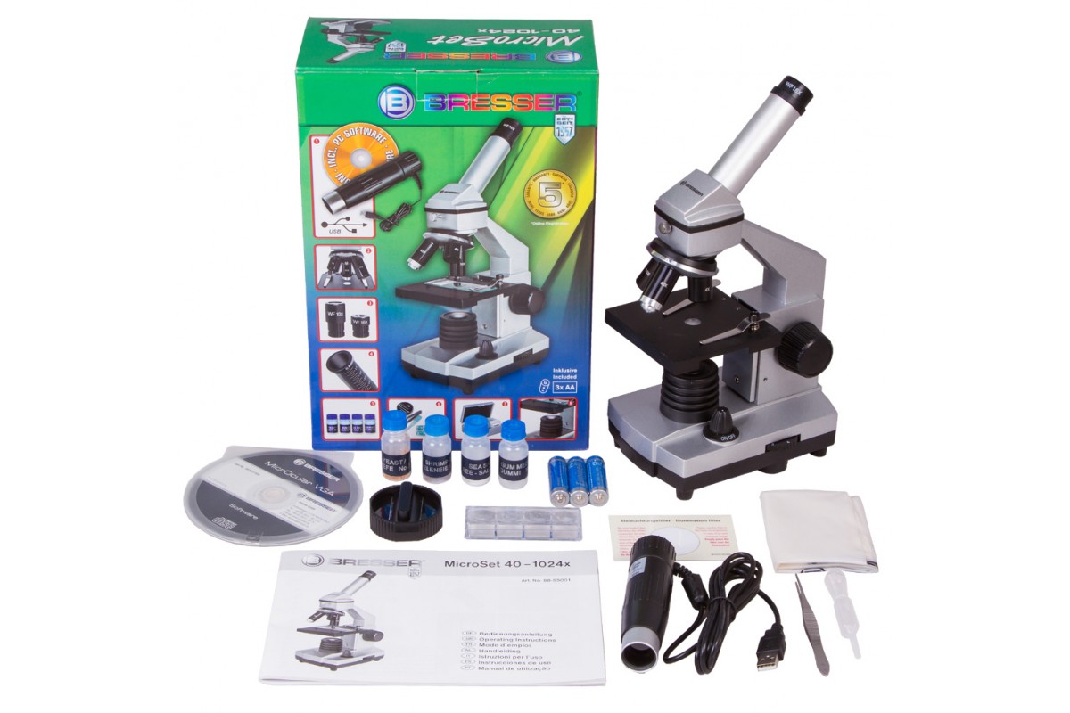 Увеличение: до 1024 крат. Набор готовых микропрепаратов в комплектеBresser Junior 40x–1024x – это качественный микроскоп, предназначенный для изучения прозрачных микропрепаратов в проходящем свете. Прибор отличается качественной оптикой. Расширенная комплектация позволяет приступить к изучению микромира сразу же после приобретения микроскопа. На оптические элементы нанесено многослойное просветляющее покрытие, поэтому картинка получается резкой и четкой. Прибор оснащен тремя объективами. В комплект входит два окуляра с увеличением 10 и 16 крат, а также окулярная камера. Оптическое увеличение модели составляет 40–640 крат, а при использовании цифровой камеры – 10–1024 крат. Механические части микроскопа отличаются прочностью и надежностью. Механизм фокусировки имеет плавный ход. Комплектация: