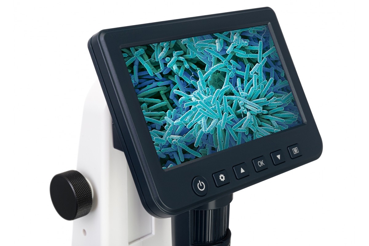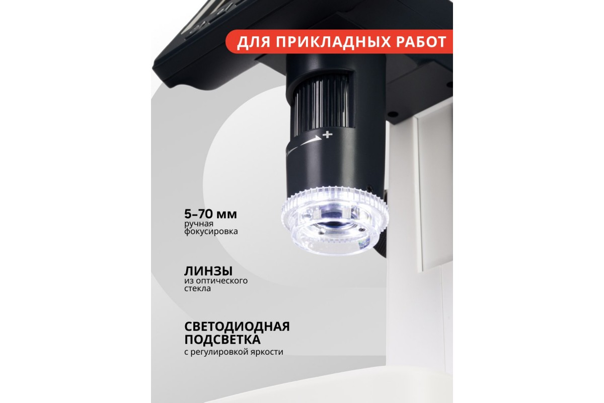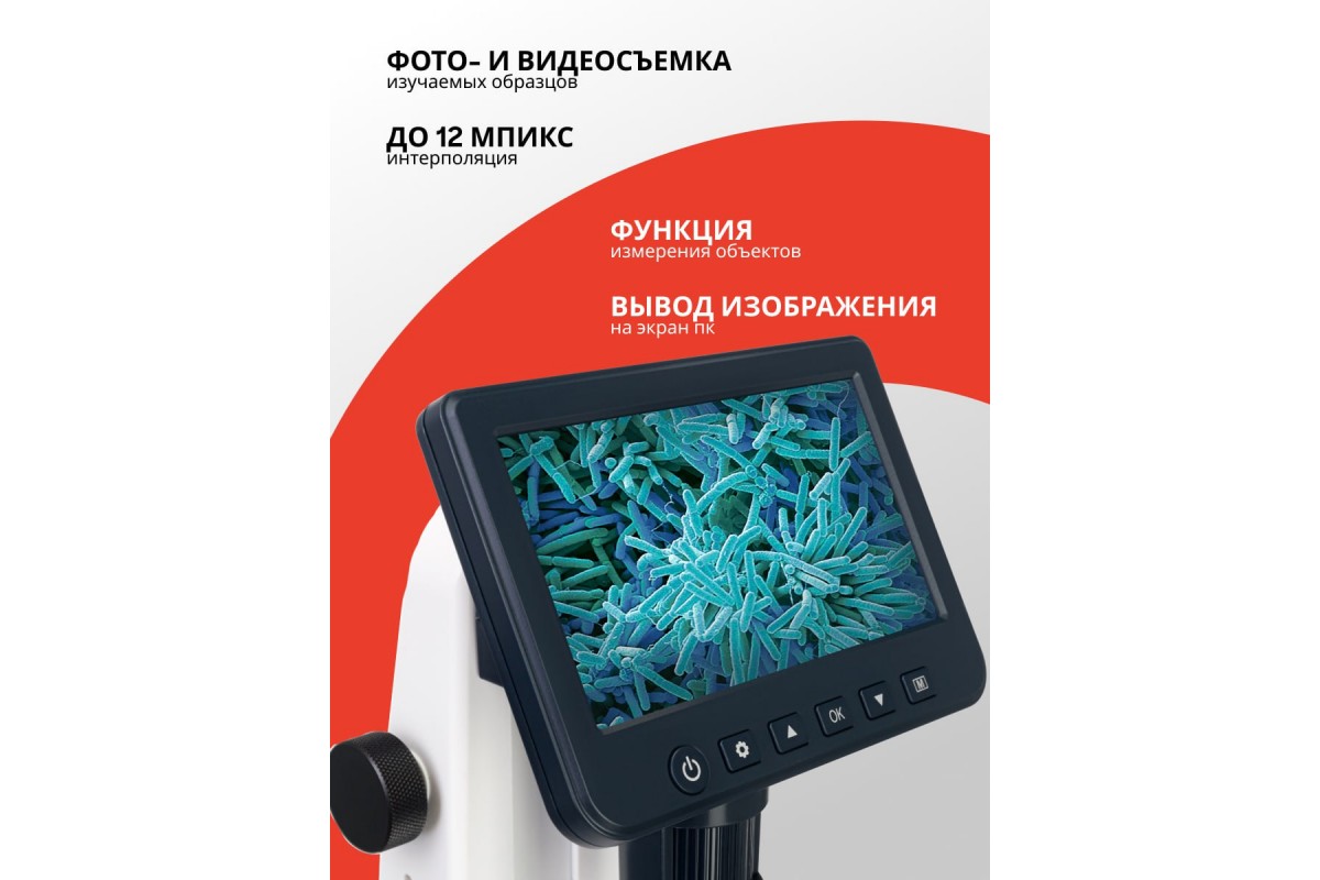 Прибор дает оптическое увеличение в диапазоне от 10 до 300 крат, также можно использовать цифровой зум, чтобы повысить кратность до 1200х. Изображение с объектива сразу же отображается на встроенном цветном 5-дюймовом экране. Изучать образцы, глядя на экран, гораздо удобнее, чем через окуляр, так как это меньше нагружает зрение – длительная работа становится более удобной. Более того, микроскоп можно подключить к компьютеру или телевизору для вывода картинки на внешний экран. В этом случае микроскоп позволит даже проводить презентации и групповые исследования.