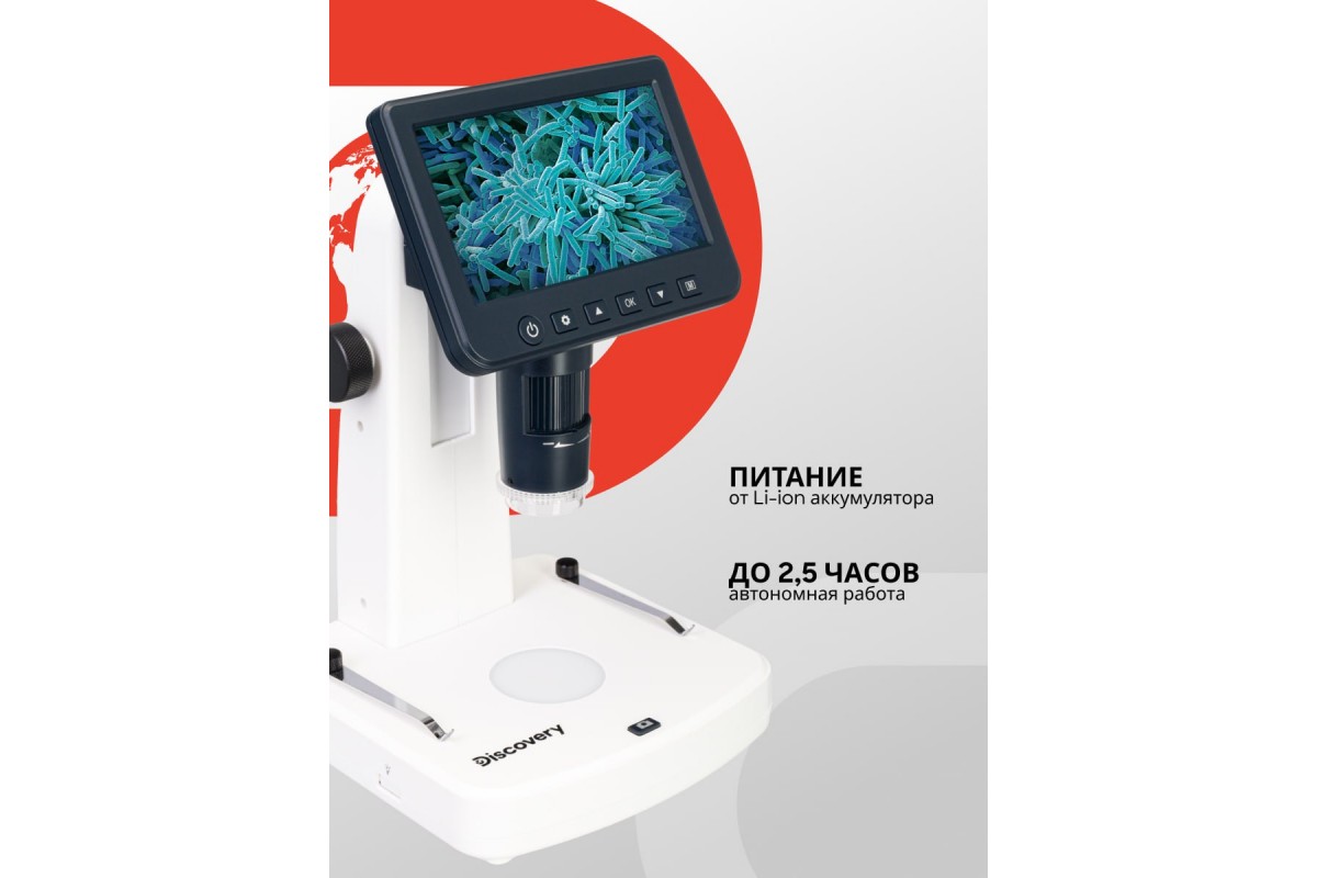 Микроскоп может работать как от сети переменного тока, так и от встроенного аккумулятора. Время работы на одном заряде – около 3 часов.